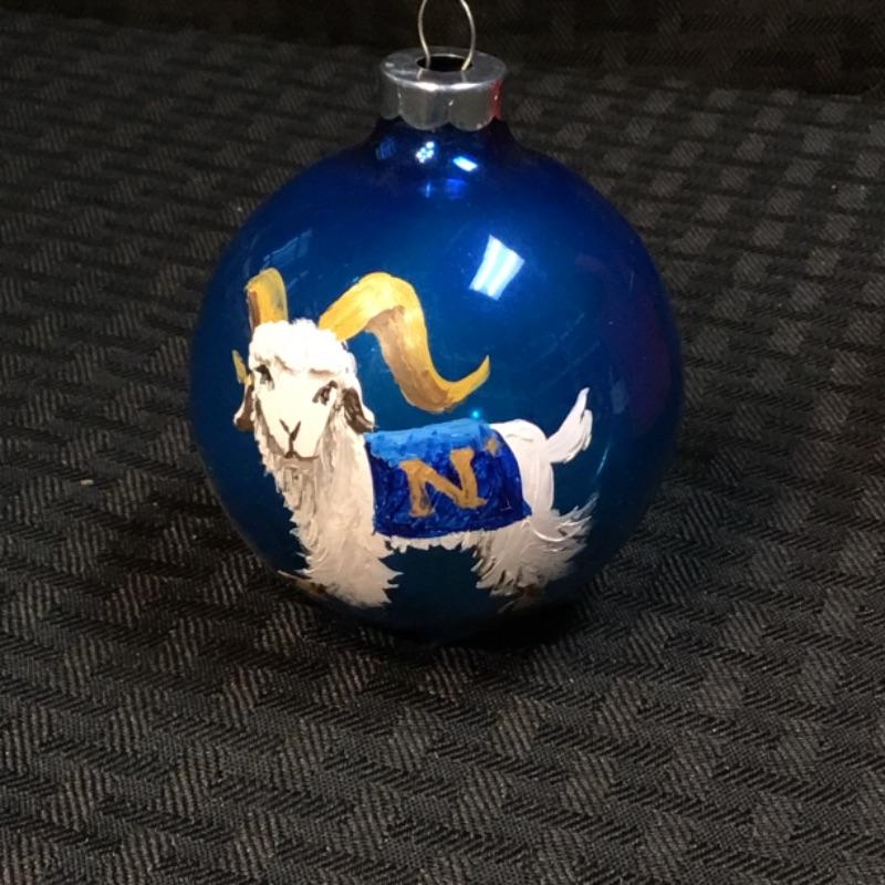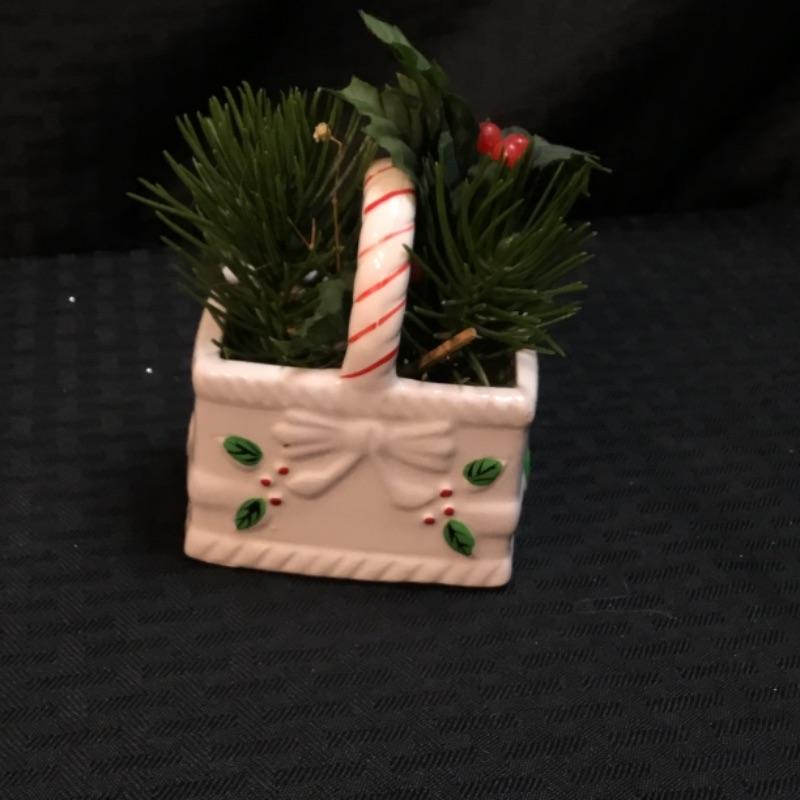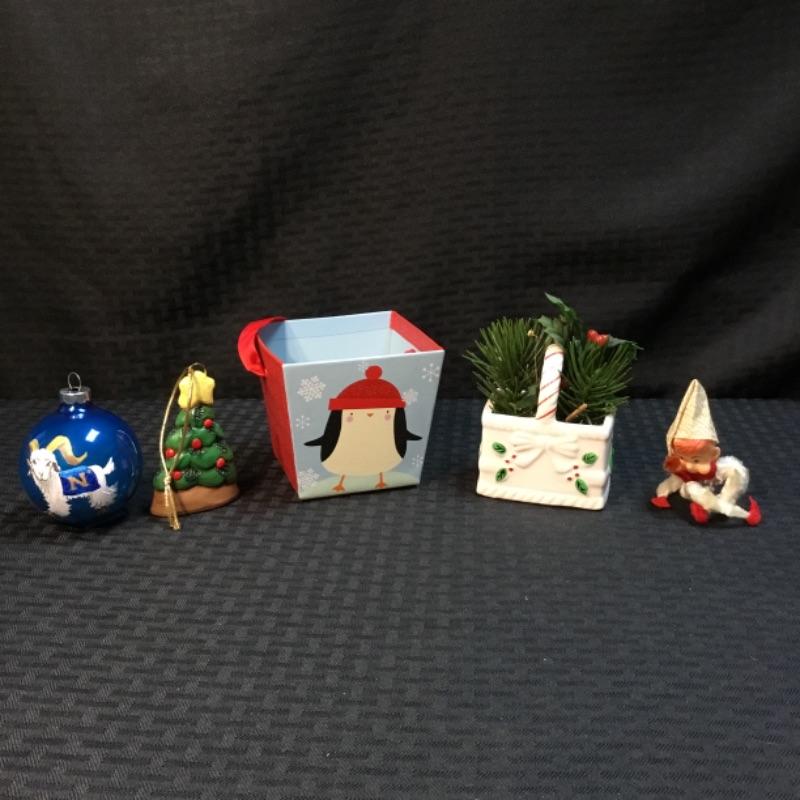 Miscellaneous holiday ornaments and decor pieces. In this lot you’ll receive one blue holiday ornament with a hand painted goat wearing a blue throw with an, “N“ on it, one Christmas tree ceramic ornament, One smiley Santa-boy tree topper made of a pipe cleaner, One miniature gift basket with a festive holiday penguin, and one ceramic holiday basket with simulated plants inside; see pictures.