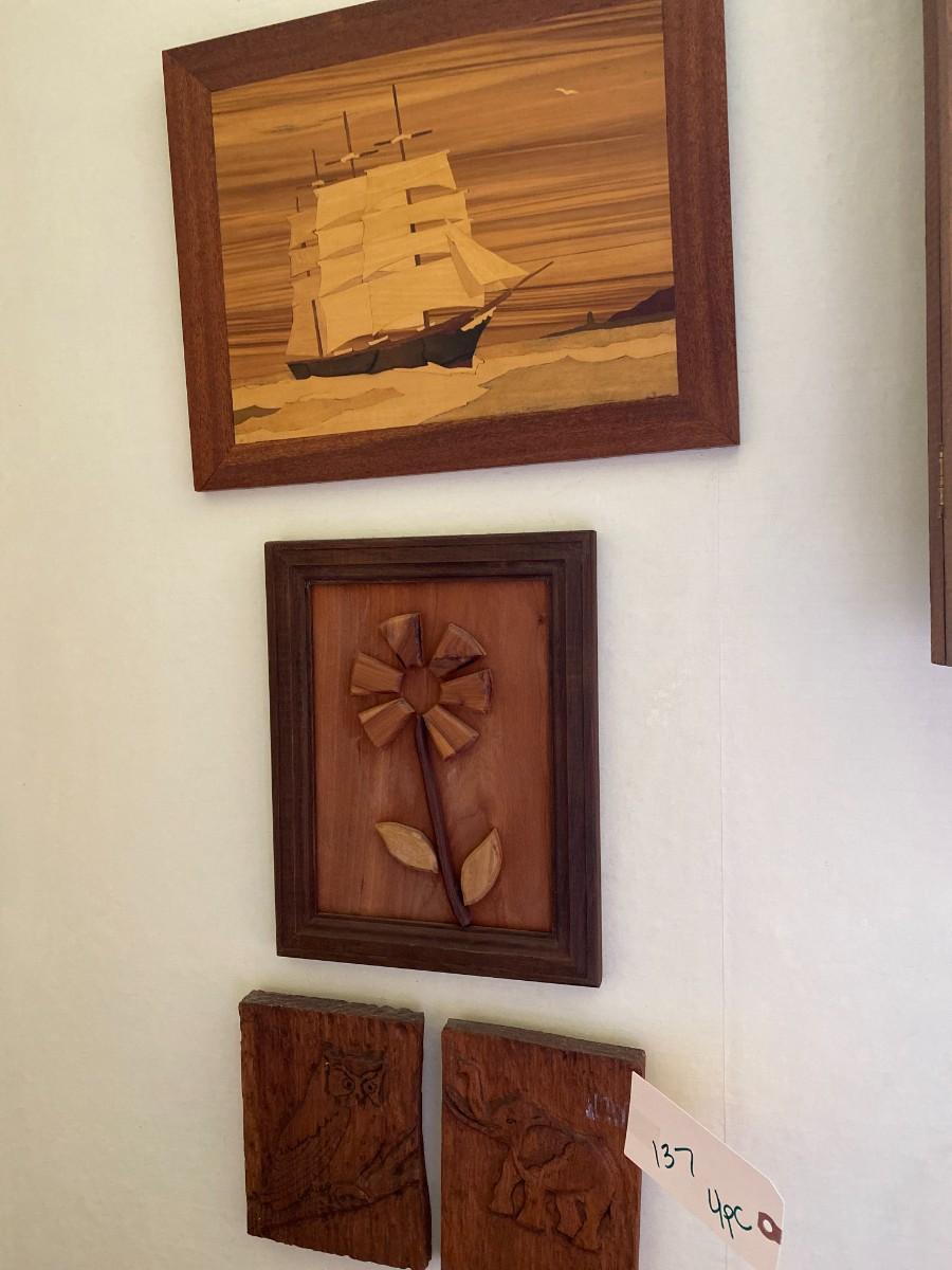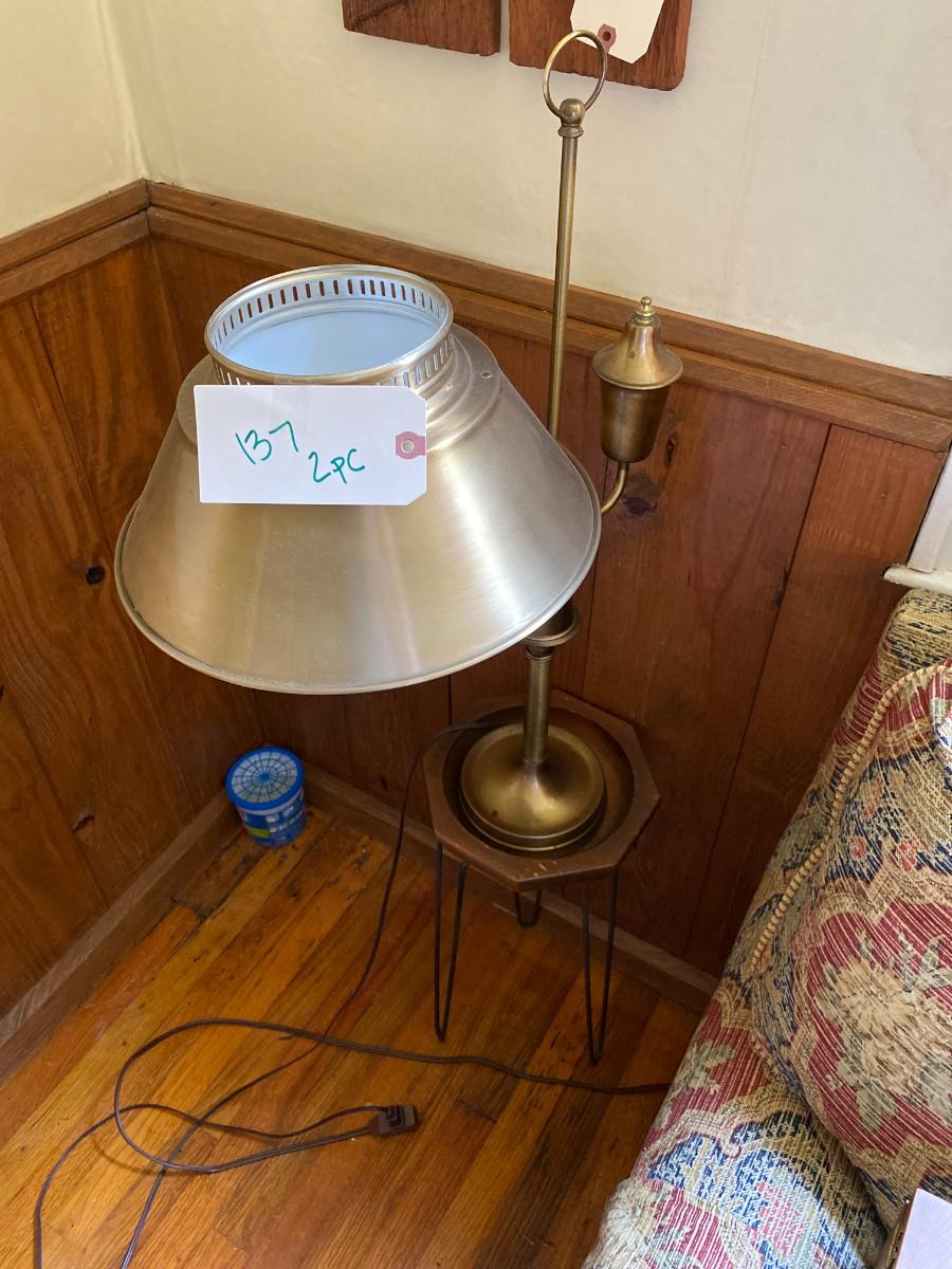 Wooden Plant Stand, Brass Lamp, 4 Pc Wall Art As Pictured
