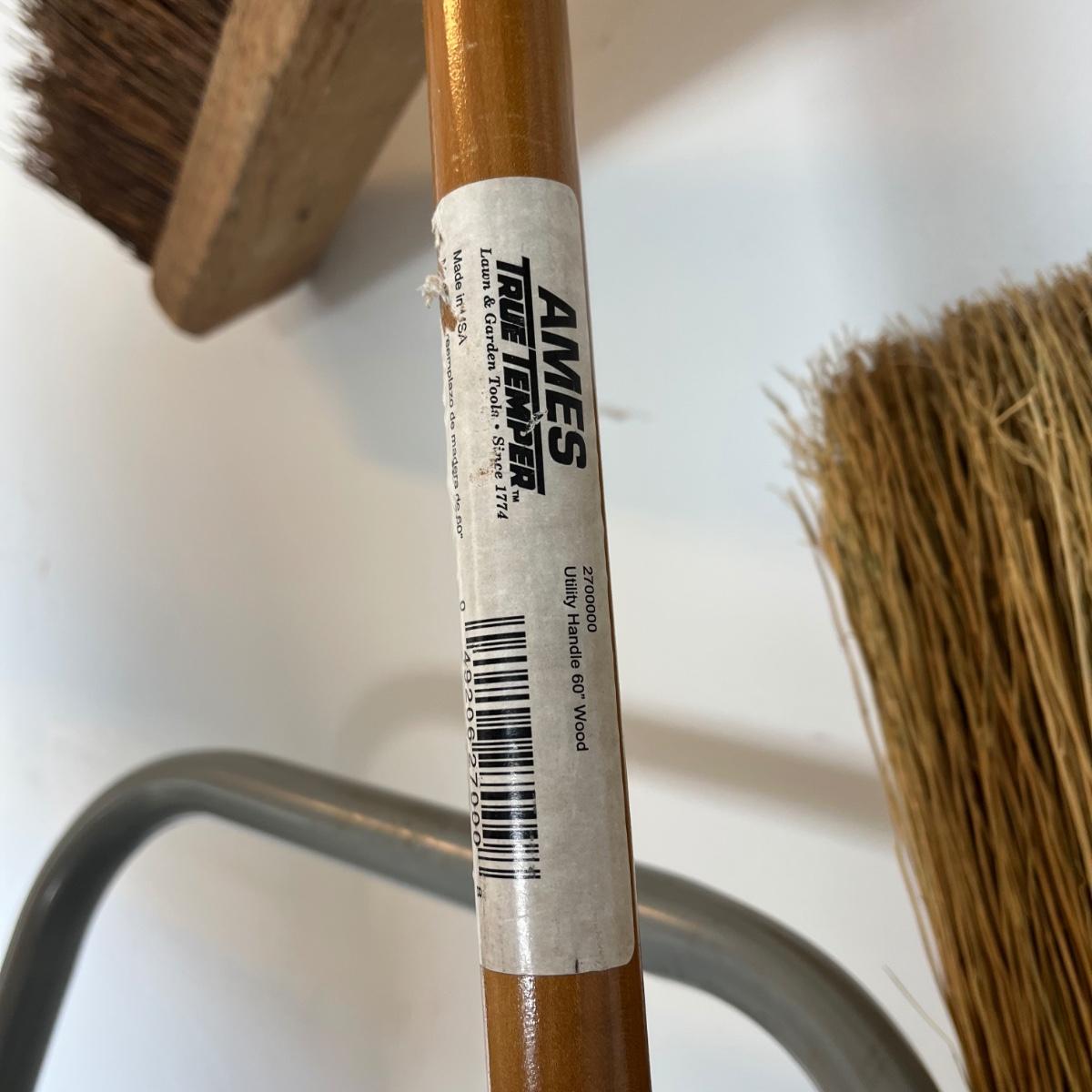 This lot includes an adjustable hand truck, a 32 gal Rubbermaid Roughneck wheeled refuse container, brooms and dustpan, vinyl tarp and an Eco-I-Lite power failure style flashlight. Rubbermaid bin is dusty from use in a workshop. See pictures for more details.