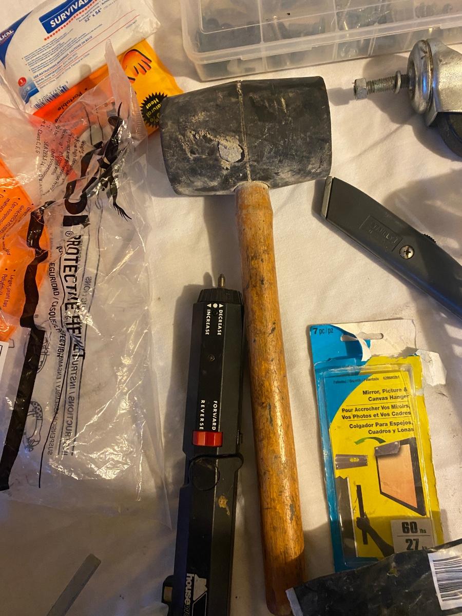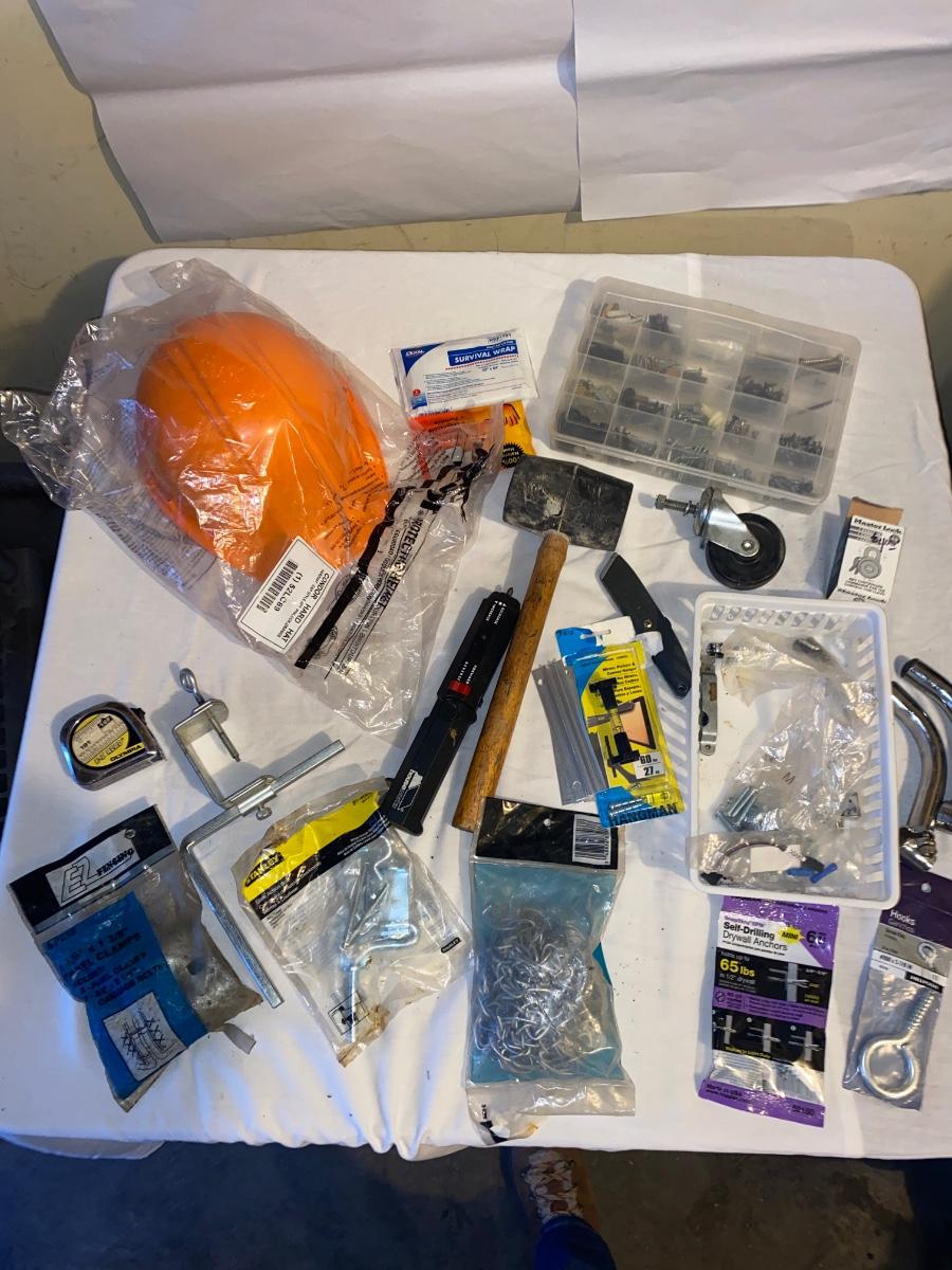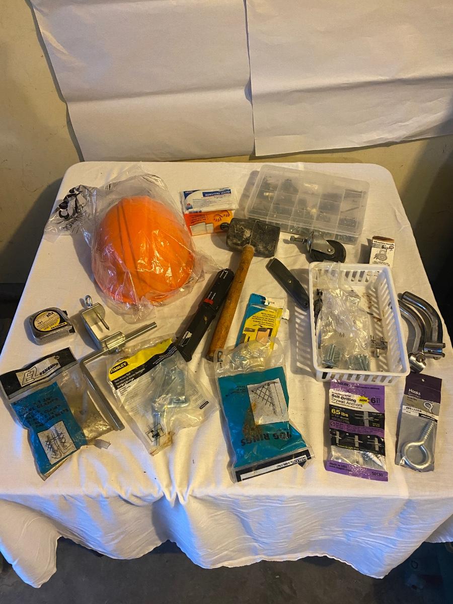 MISC HOUSEHOLD HARDWARE AND AN ORANGE HARD HAT TOO!