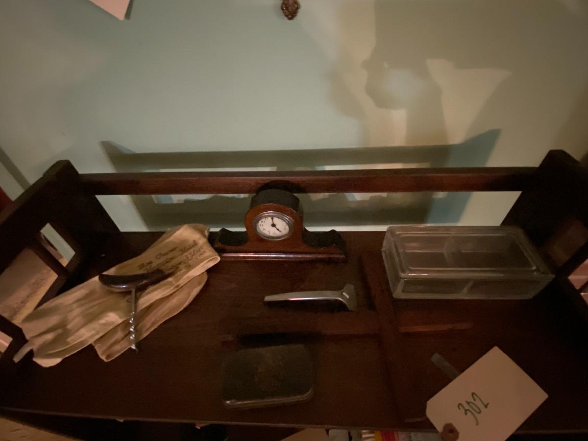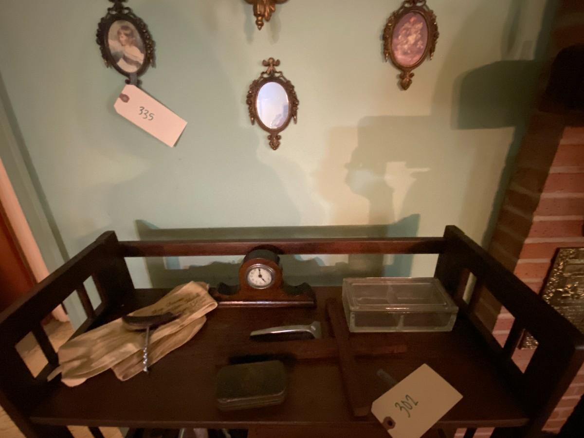 LOT 302 Wade Hampton Hotel Columbia SC Shoe Cleaner, Dyke Head Carved Wine Bottle Opener, Razor, Cross, USGOV'VT Kit Vintage, SM Mantle Clock, Dresser Dish