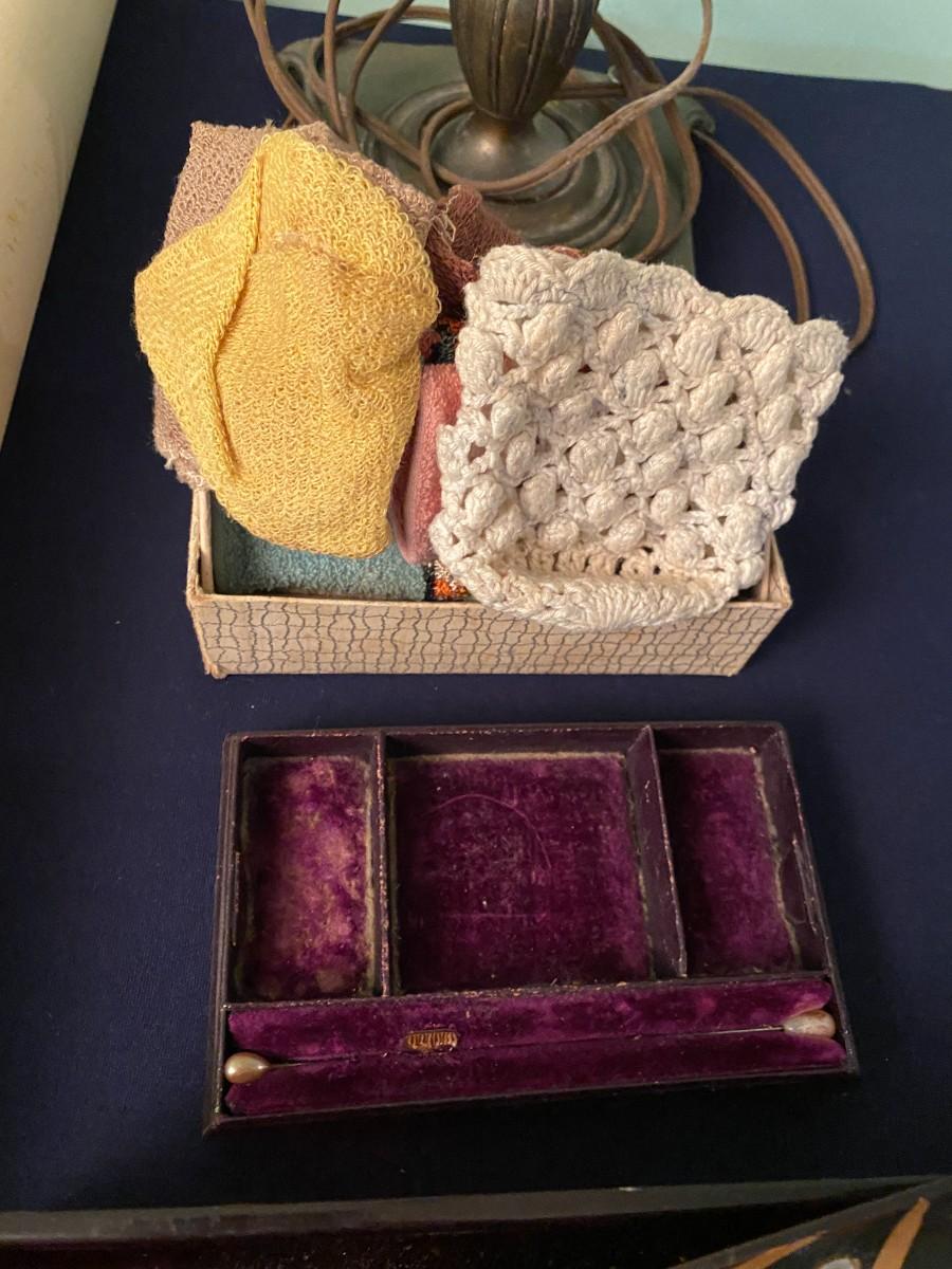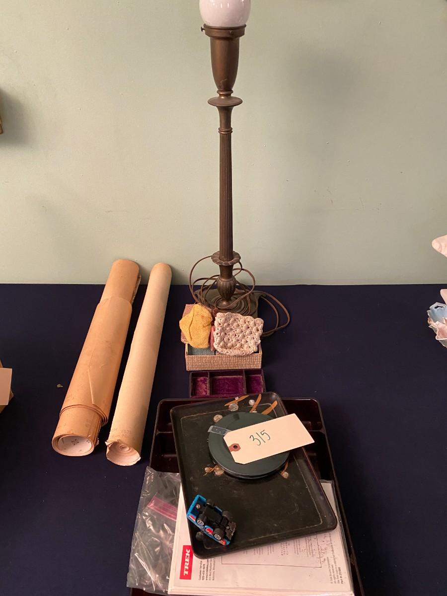 LOT 315 Vintage Wallpaper, Lamp, Crocheted Items, Hat Pins, Tray, and More As Pictured