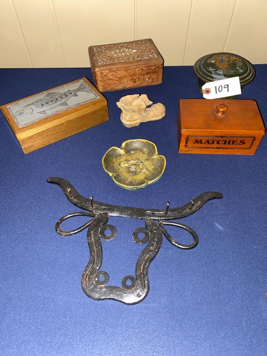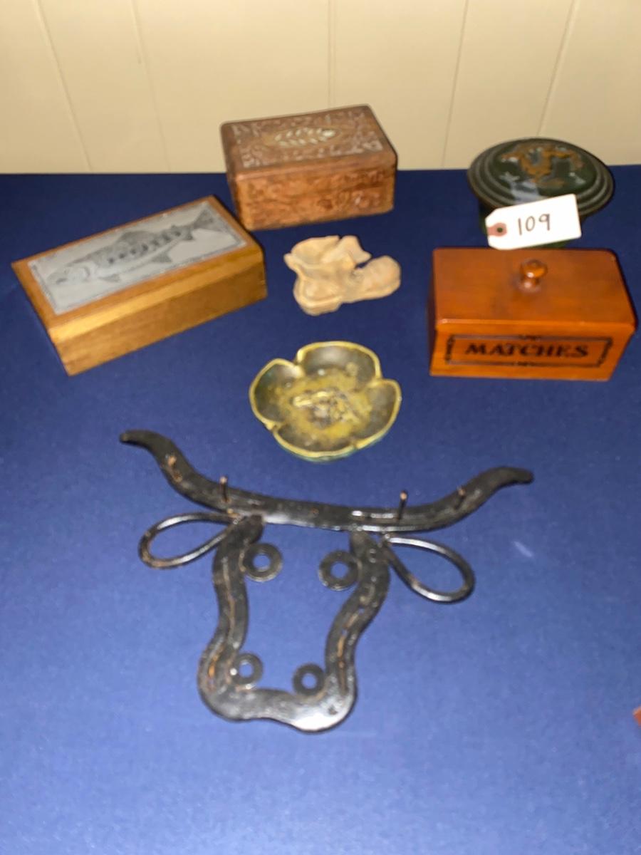 Misc Wooden Boxes, Brass Ash Tray, Bull Wall Key Holder, As Pictured