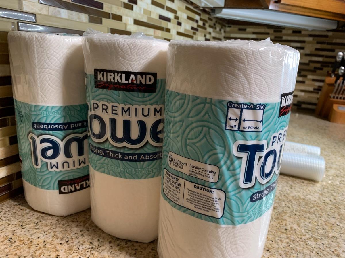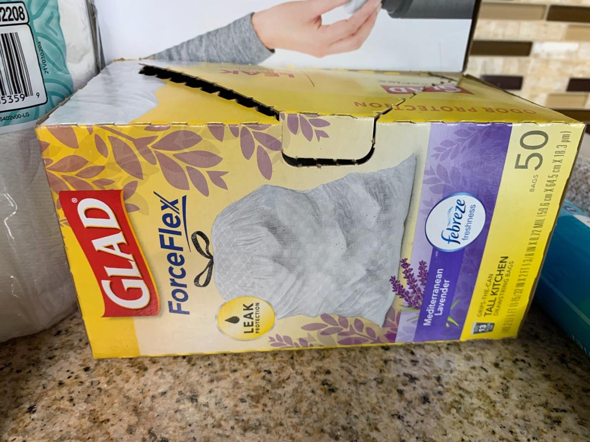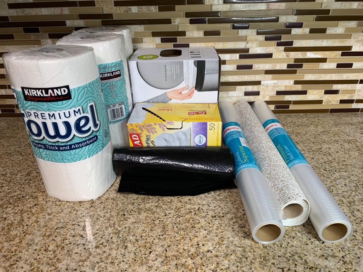 Misc. Household Supplies (shelf liner, 3 rolls of paper towels, 3 boxes of trash bags, 1 roll of black trash bag)