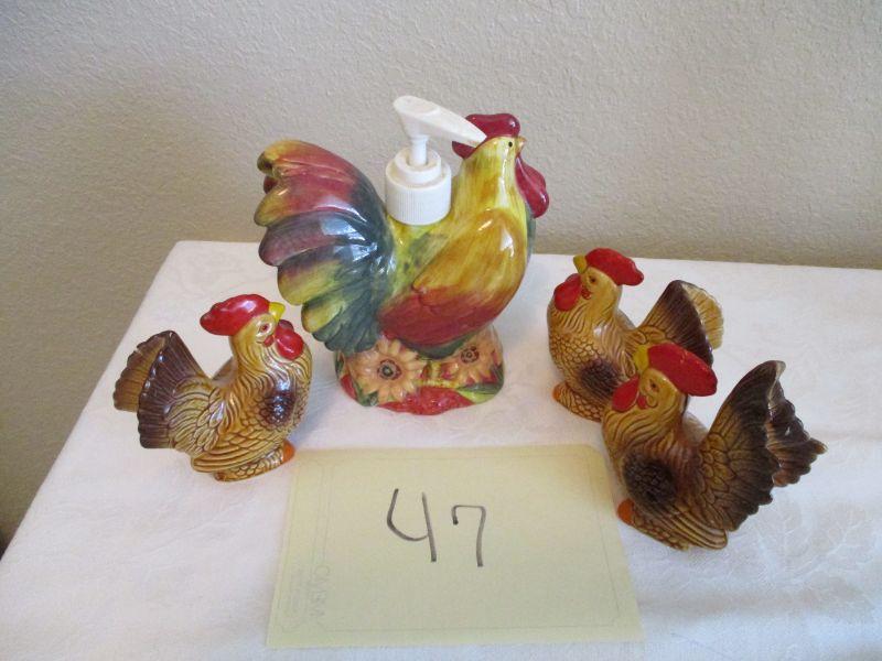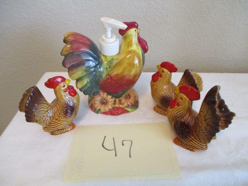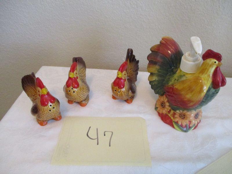 Ceramic Rooster dispenser. Salt and Pepper Shakers. (4 items)