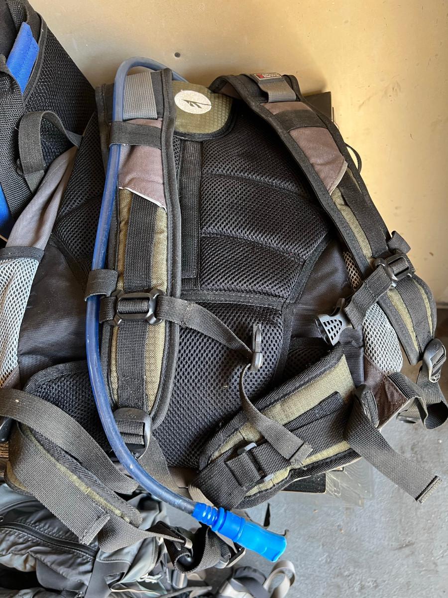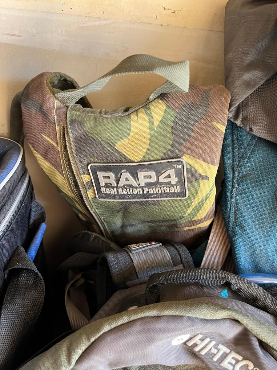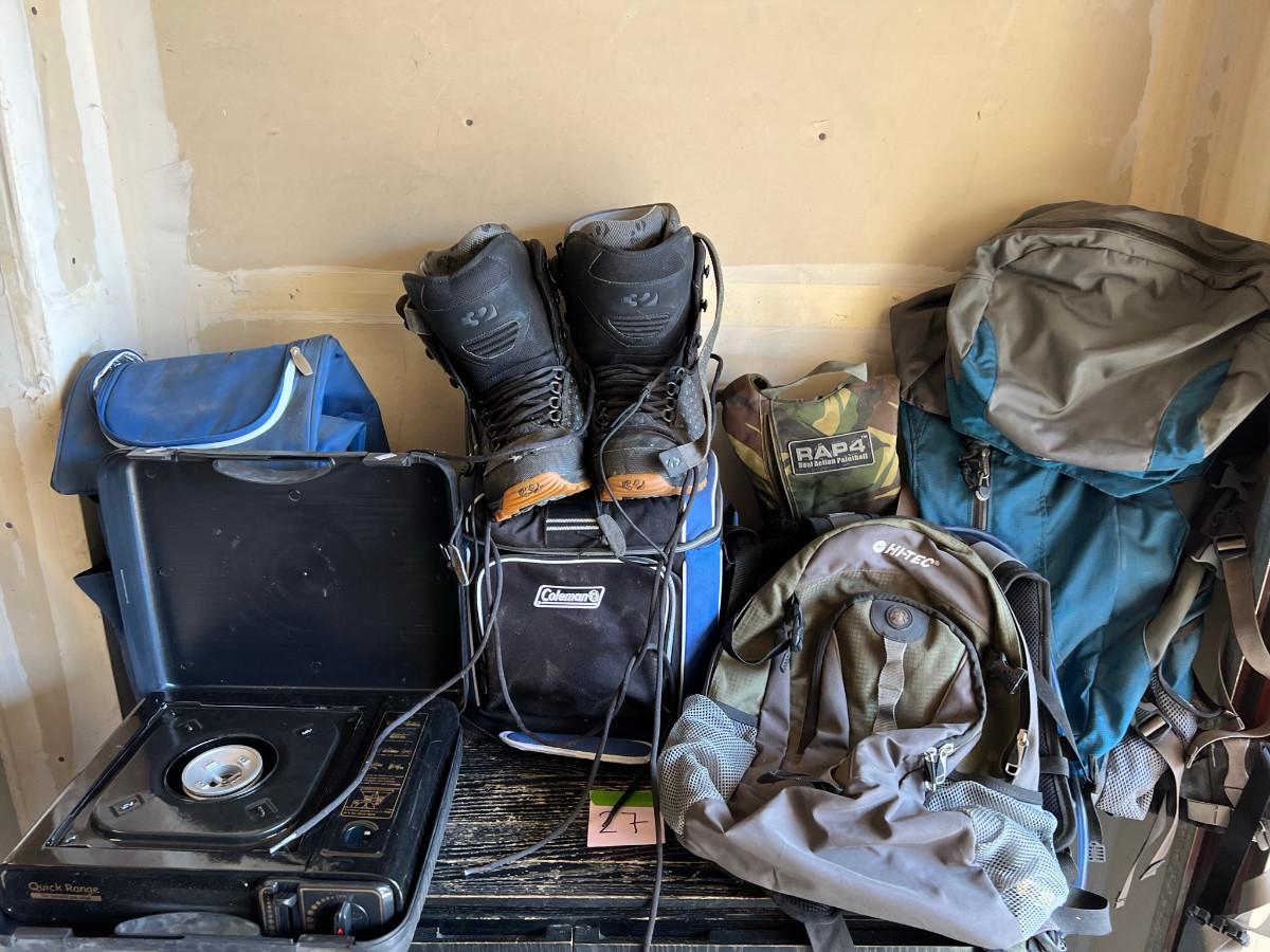 Coleman cooler, as is Thirty-Two boots size 9, RAP4 real action paint ball vest, Hi-Tech backpack, picnic time cooler bag, Quick Range portable gas range, REI Backpack