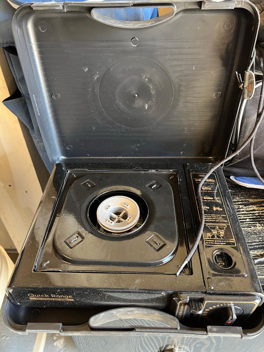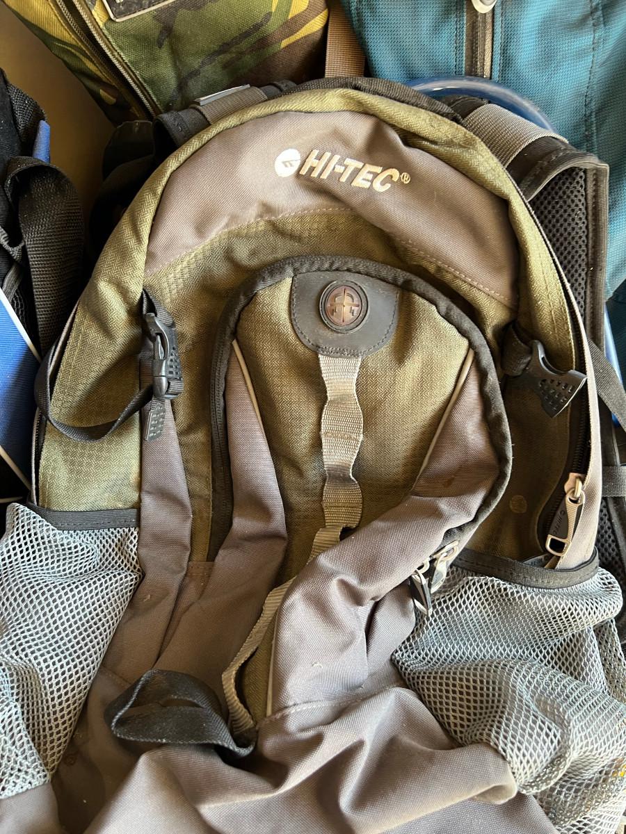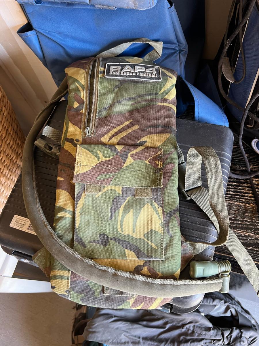 Coleman cooler, as is Thirty-Two boots size 9, RAP4 real action paint ball vest, Hi-Tech backpack, picnic time cooler bag, Quick Range portable gas range, REI Backpack