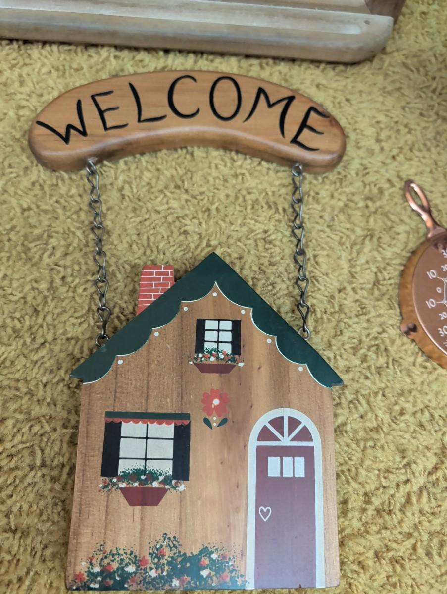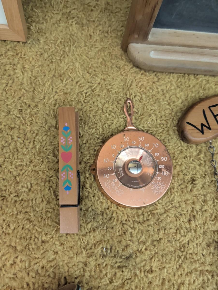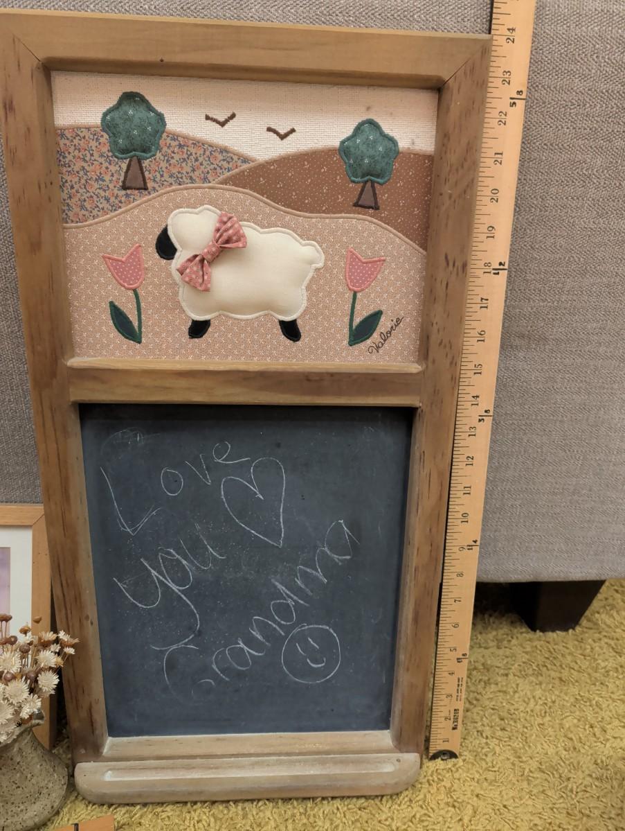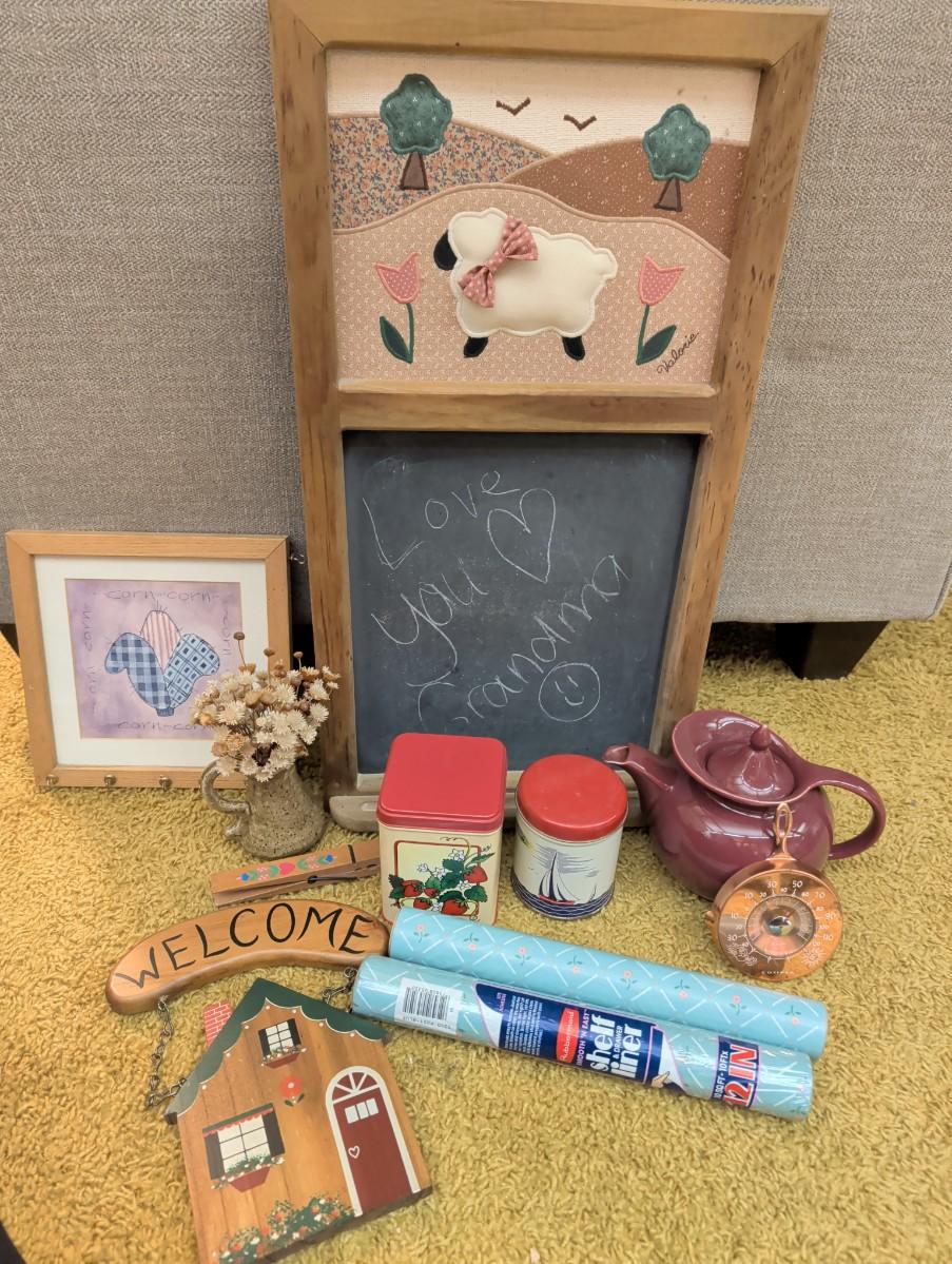 A nice miscellaneous group. A chalkboard with sheep at the top two tin cans shelf paper, a pottery vase with dried flowers, a key holder, a refrigerator magnet that looks like a clothespin.
