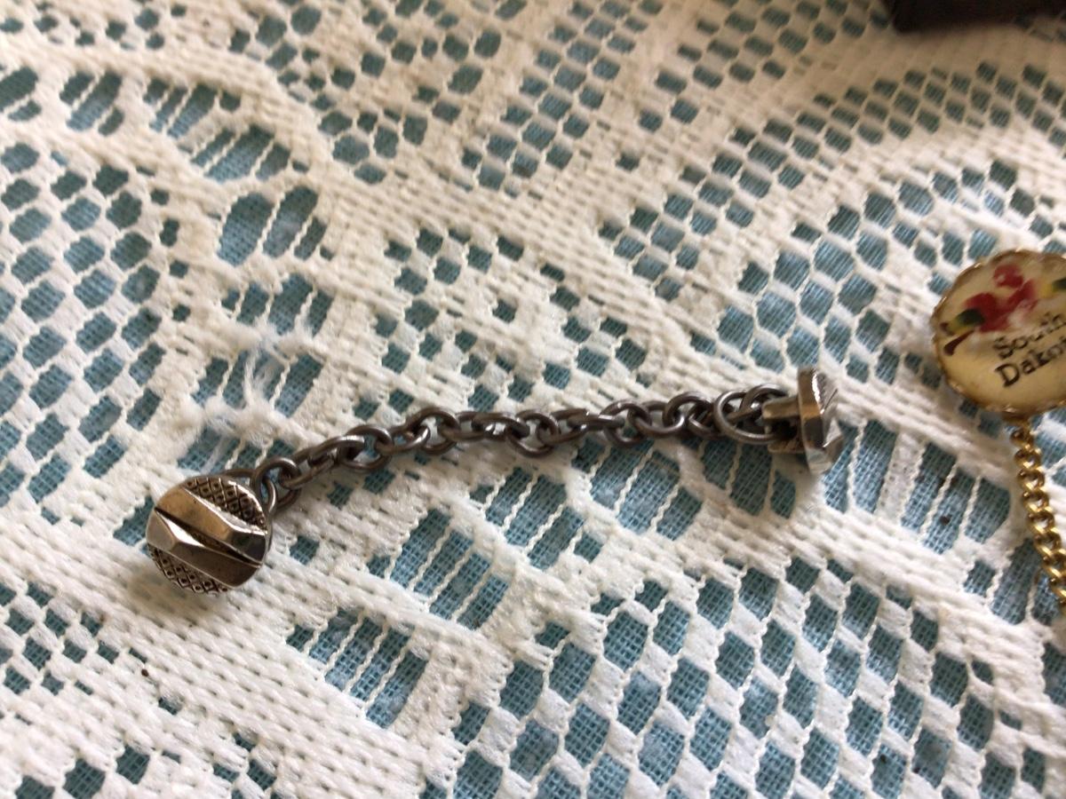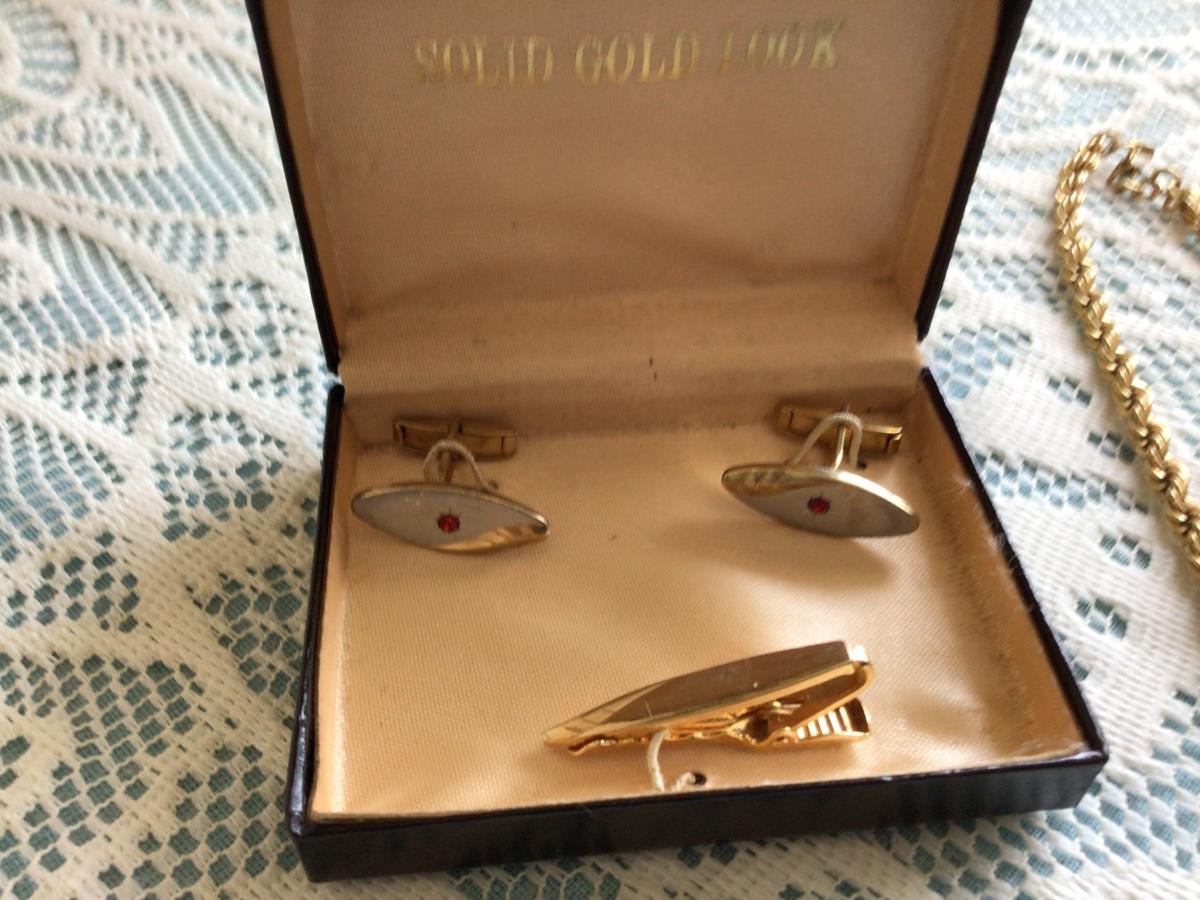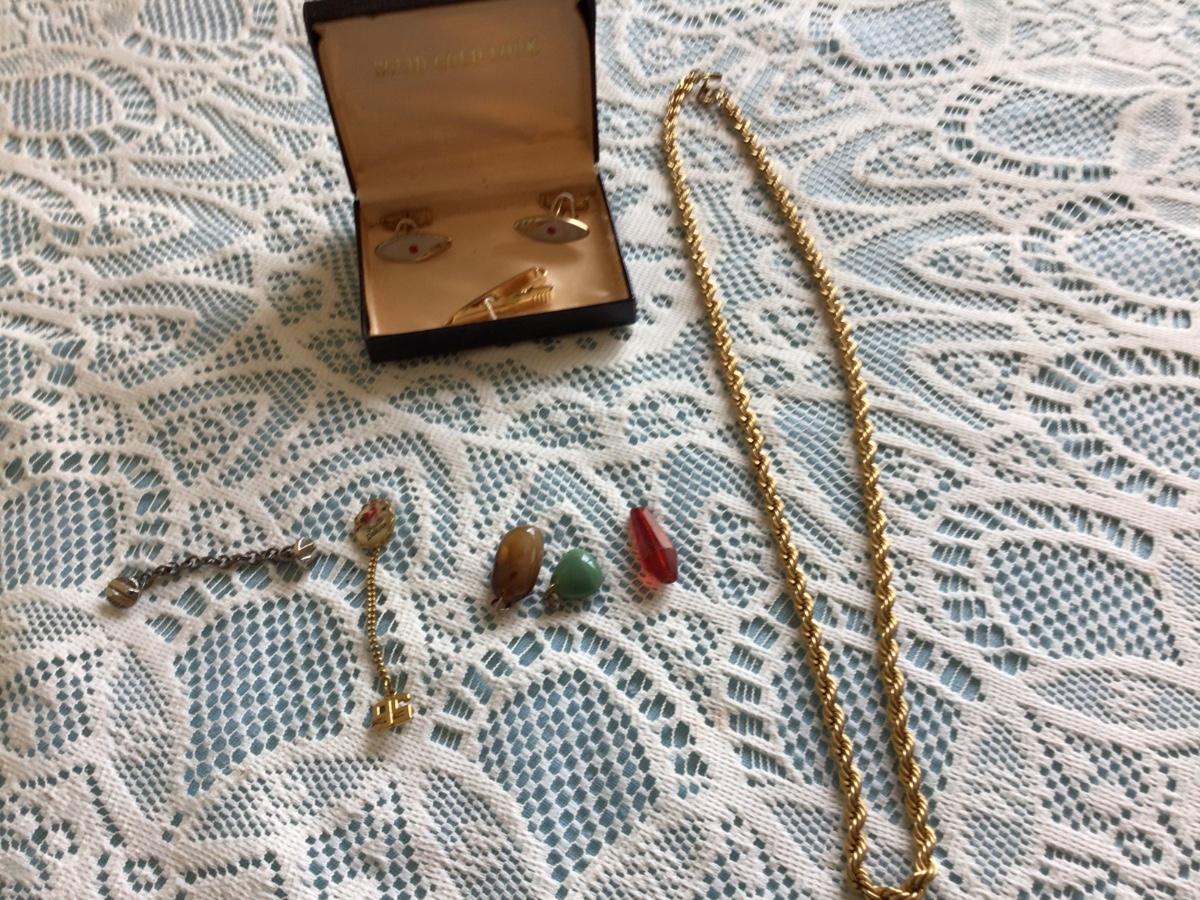 You get tie clip and matching cuff links, South Dakota 56 pin, Monet gold chain, three pendants, and a tie chain.