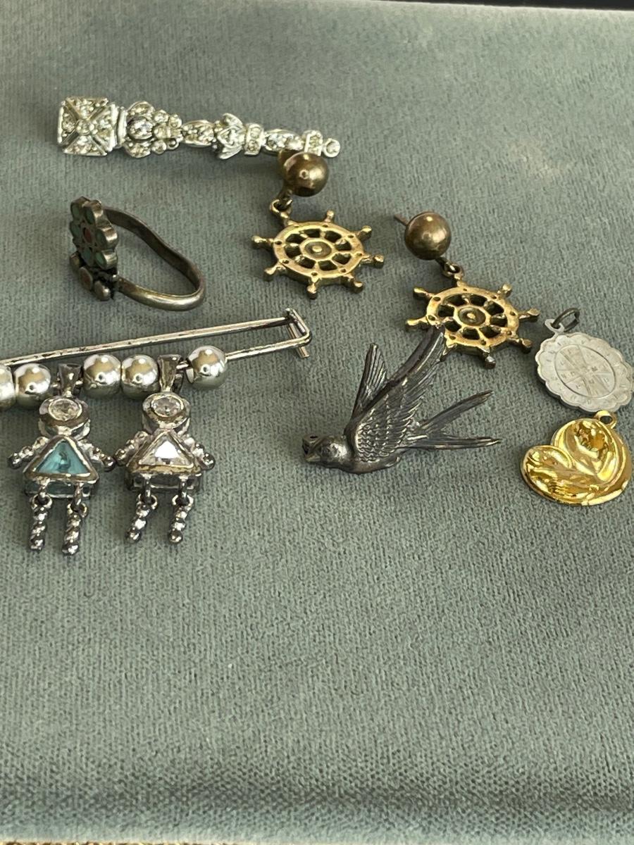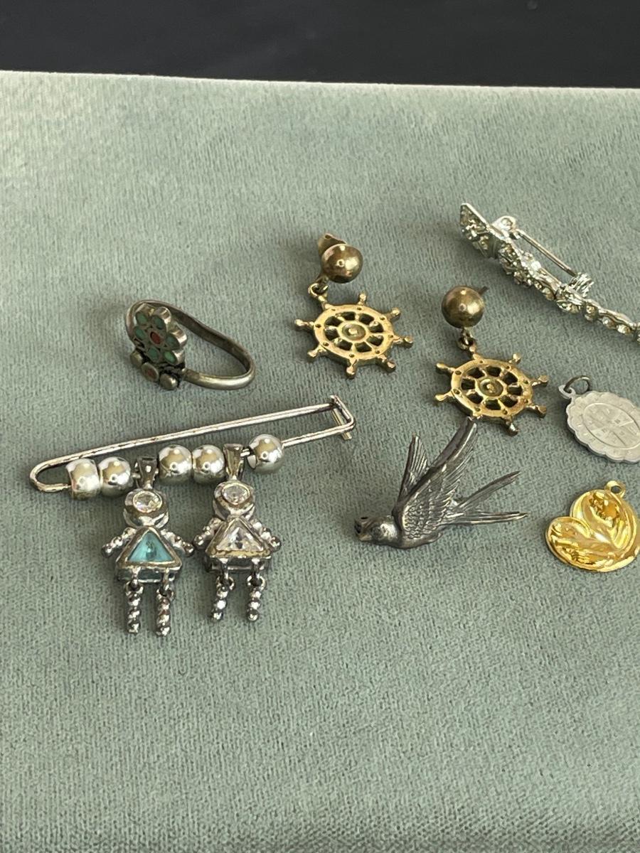 Bird, religious, sterling birthstone babies, stamped earrings I can’t make out the mark. Ring needs straightening.