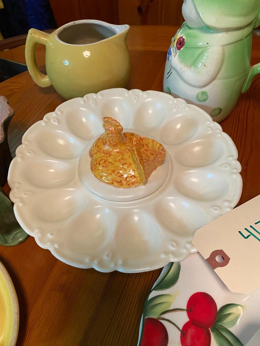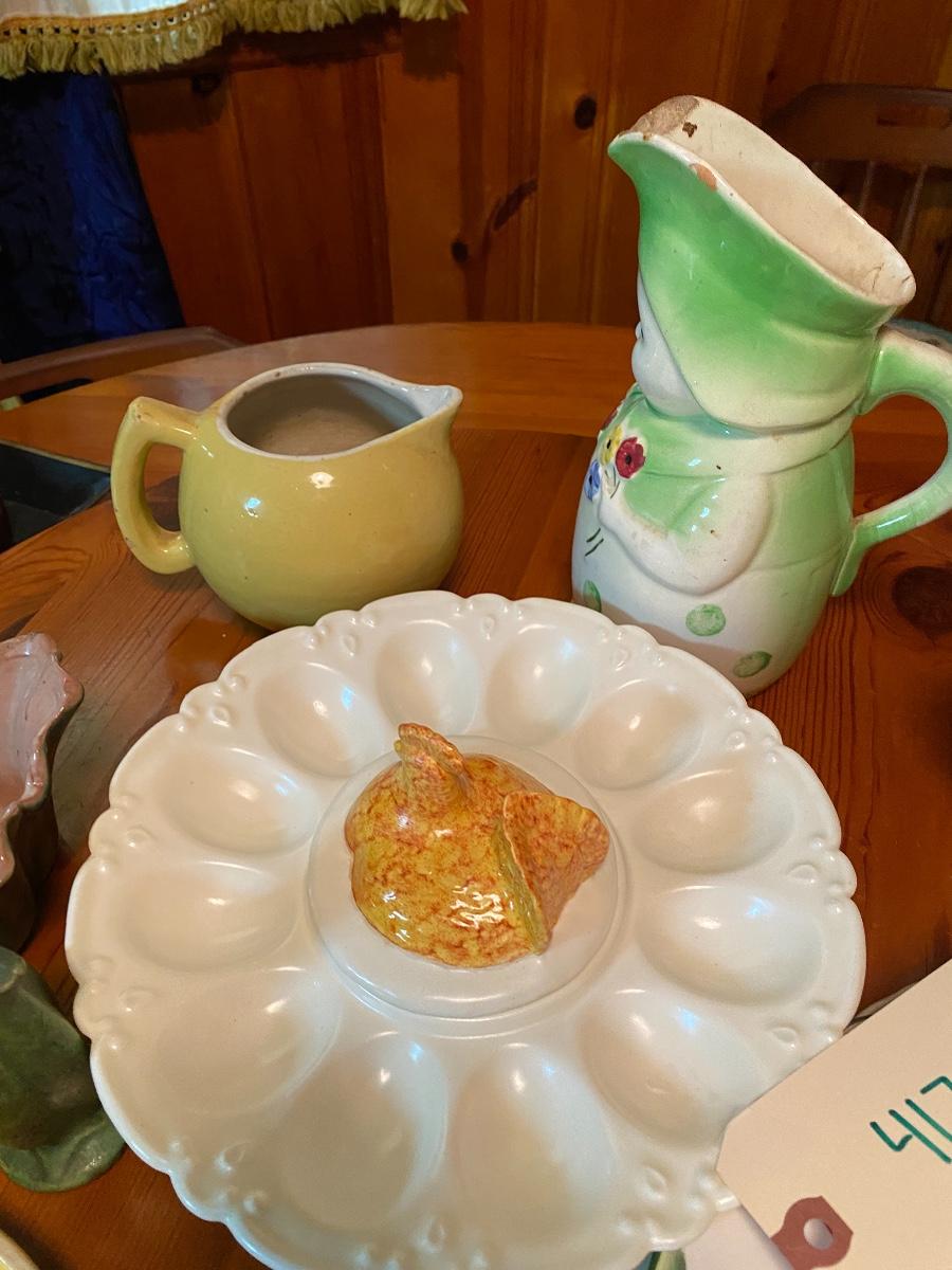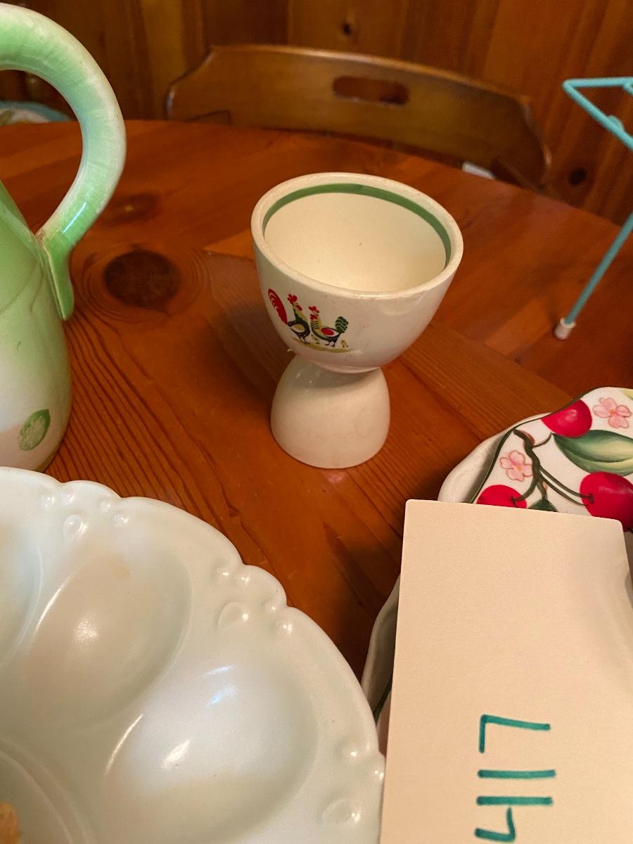 LOT 417 Vintage Egg Plate, Pitcher, Spoon Rest, Egg Cup, 1 Pitcher is Chipped As Pictured