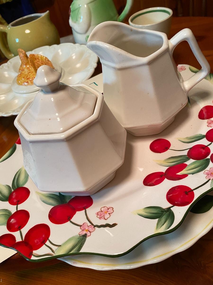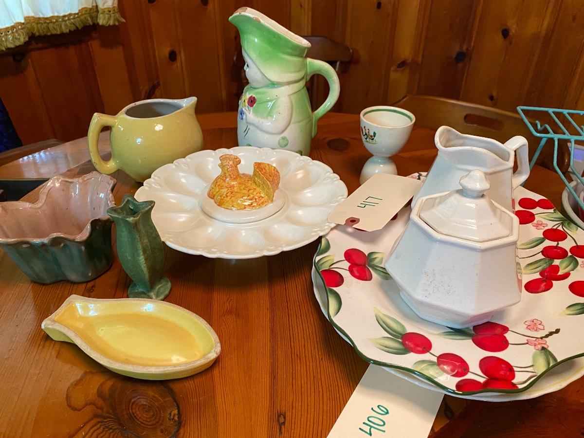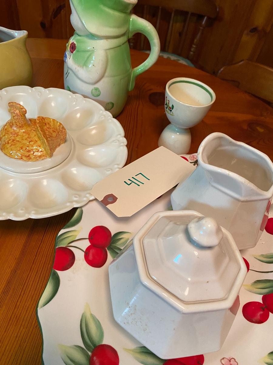 LOT 417 Vintage Egg Plate, Pitcher, Spoon Rest, Egg Cup, 1 Pitcher is Chipped As Pictured