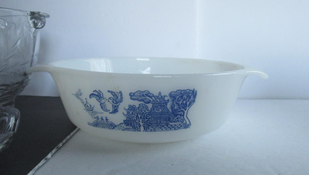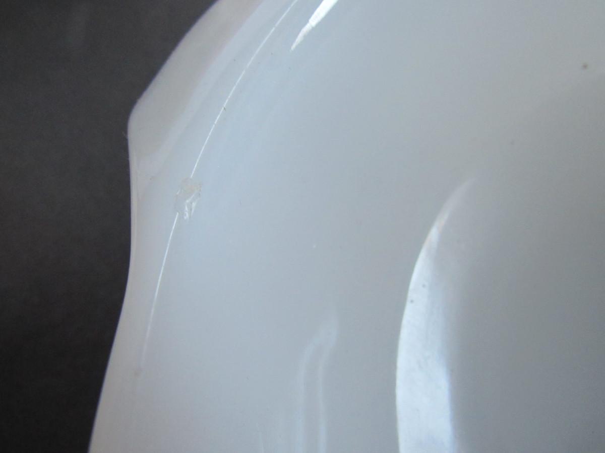 Ice bucket and tray are in good shape. Casserole has a tiny edge nick as seen in magnified photos. Salt dip has tiny chips at the top edge. Shipping is available at cost plus $5.00 per box handling and supply fee. See our terms for details. All sales final.