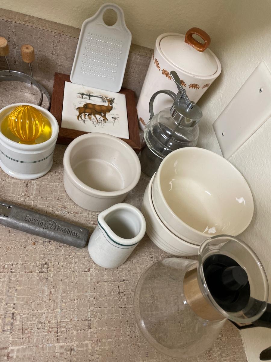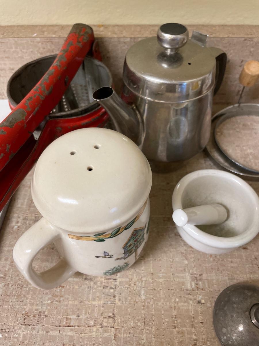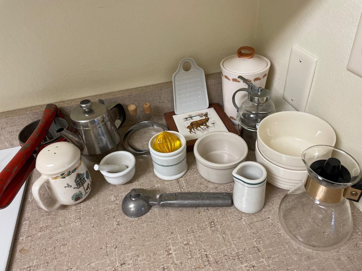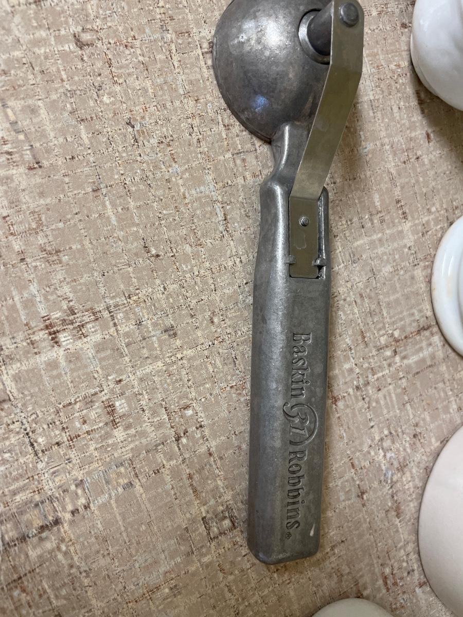 Vintage Baskin-Robbins ice cream scooper, teapot, hot plate