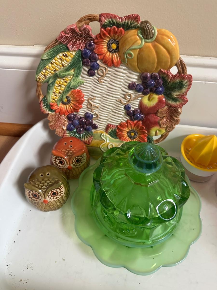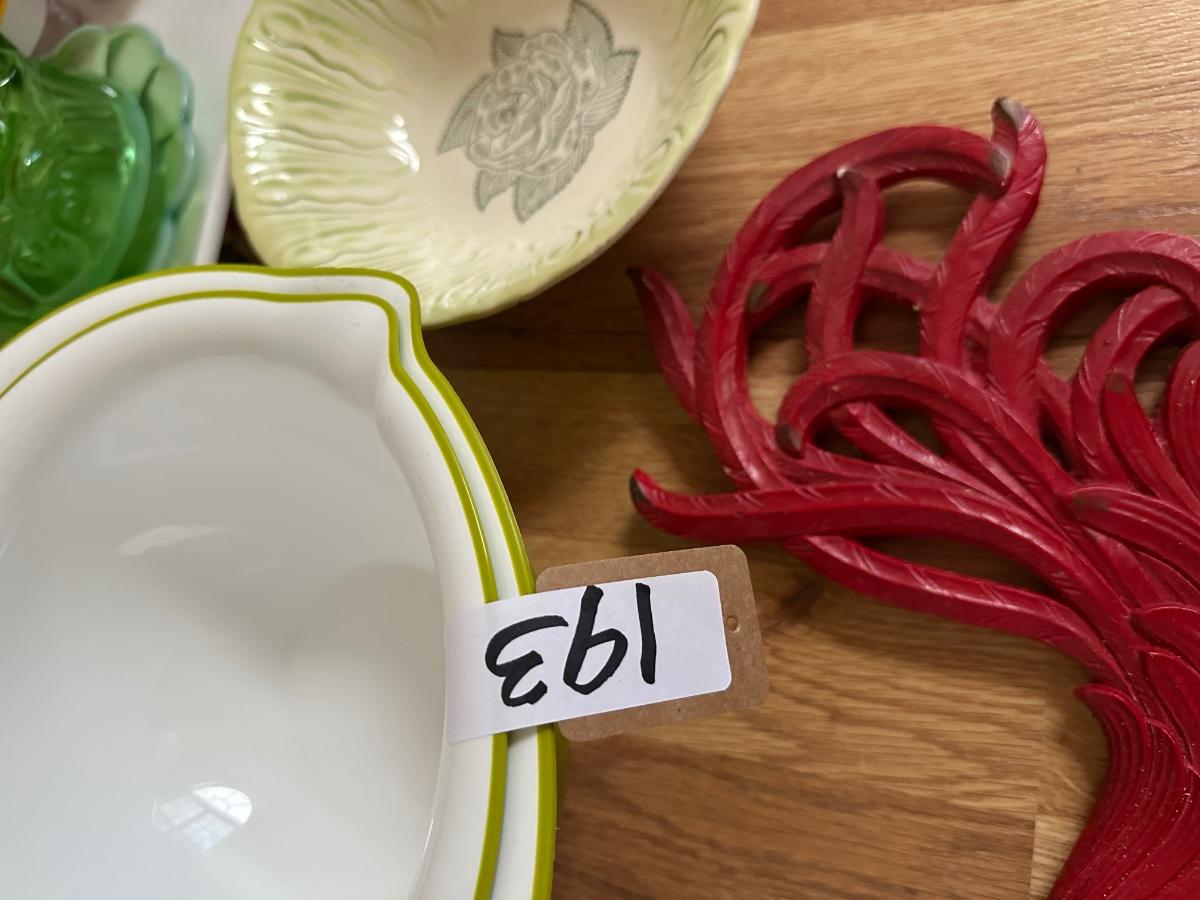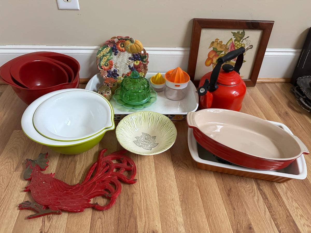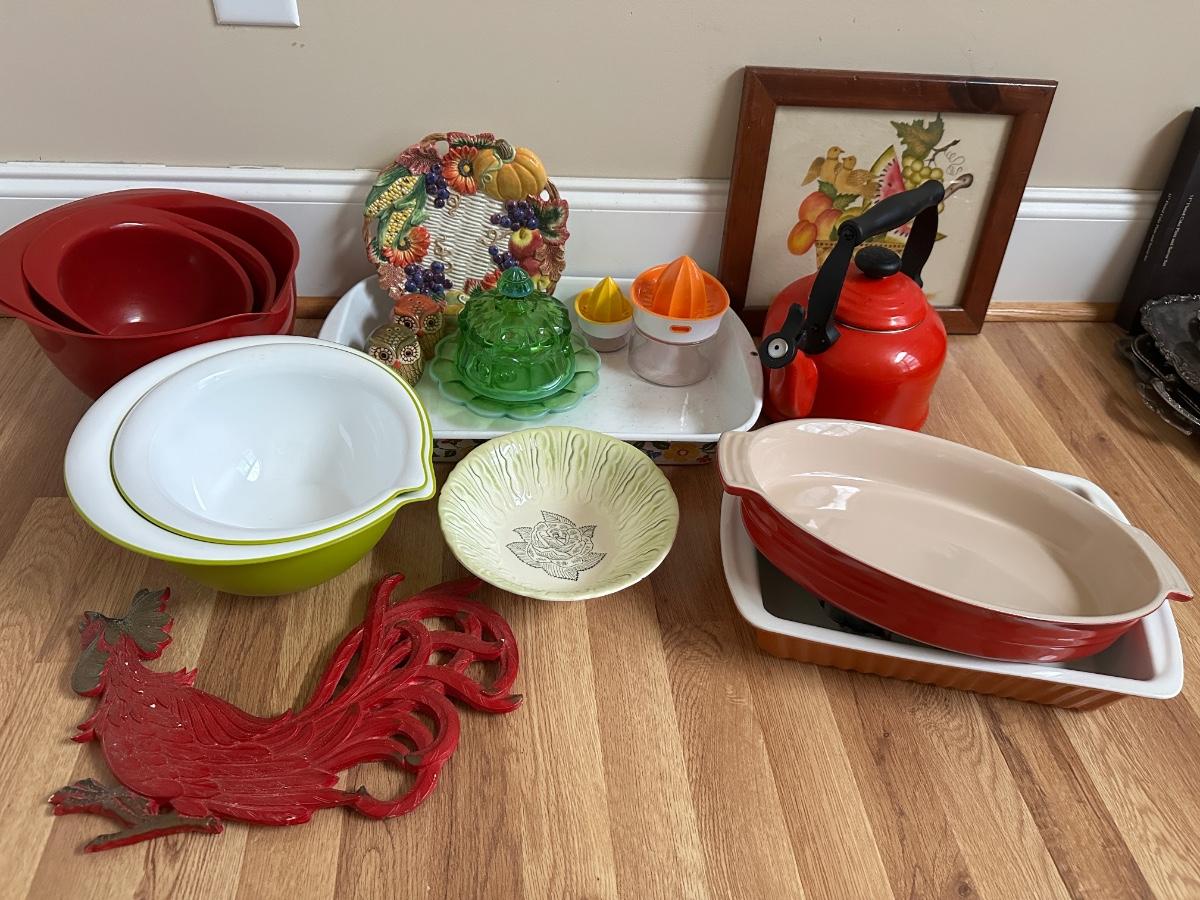 KITCHEN LOT INCLUDES LECREUSET BAKING DISH, PLASTIC MIXING BOWLS, OWL S&P SHAKERS, TEA KETTLE AND MORE