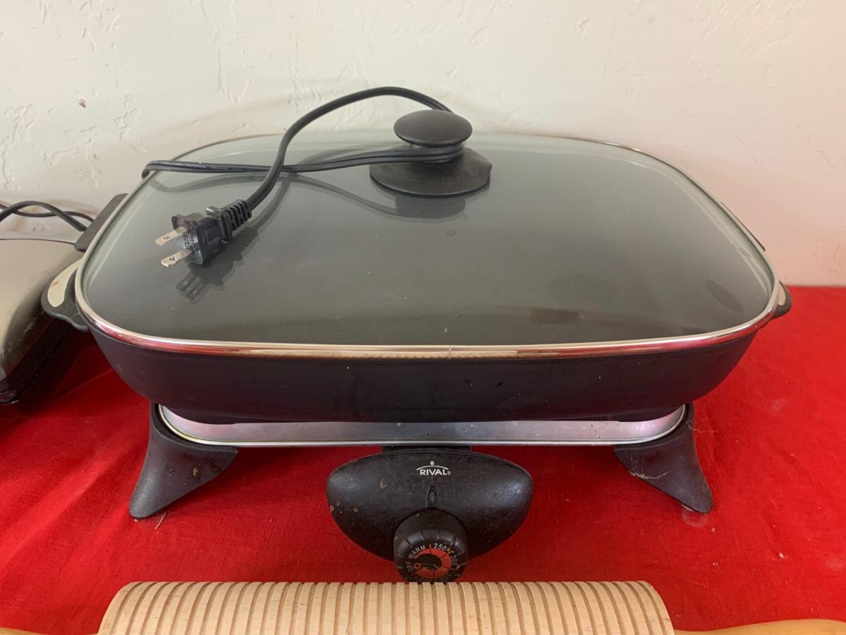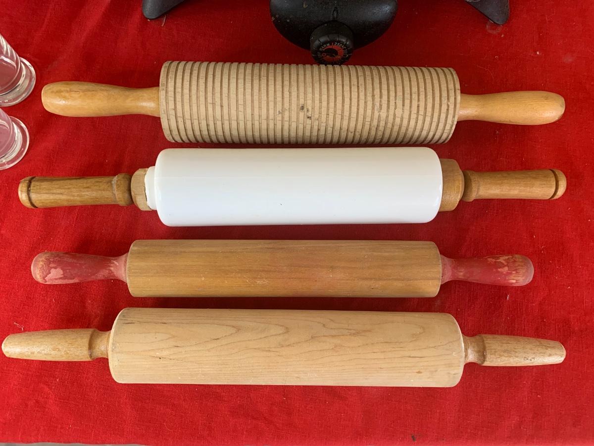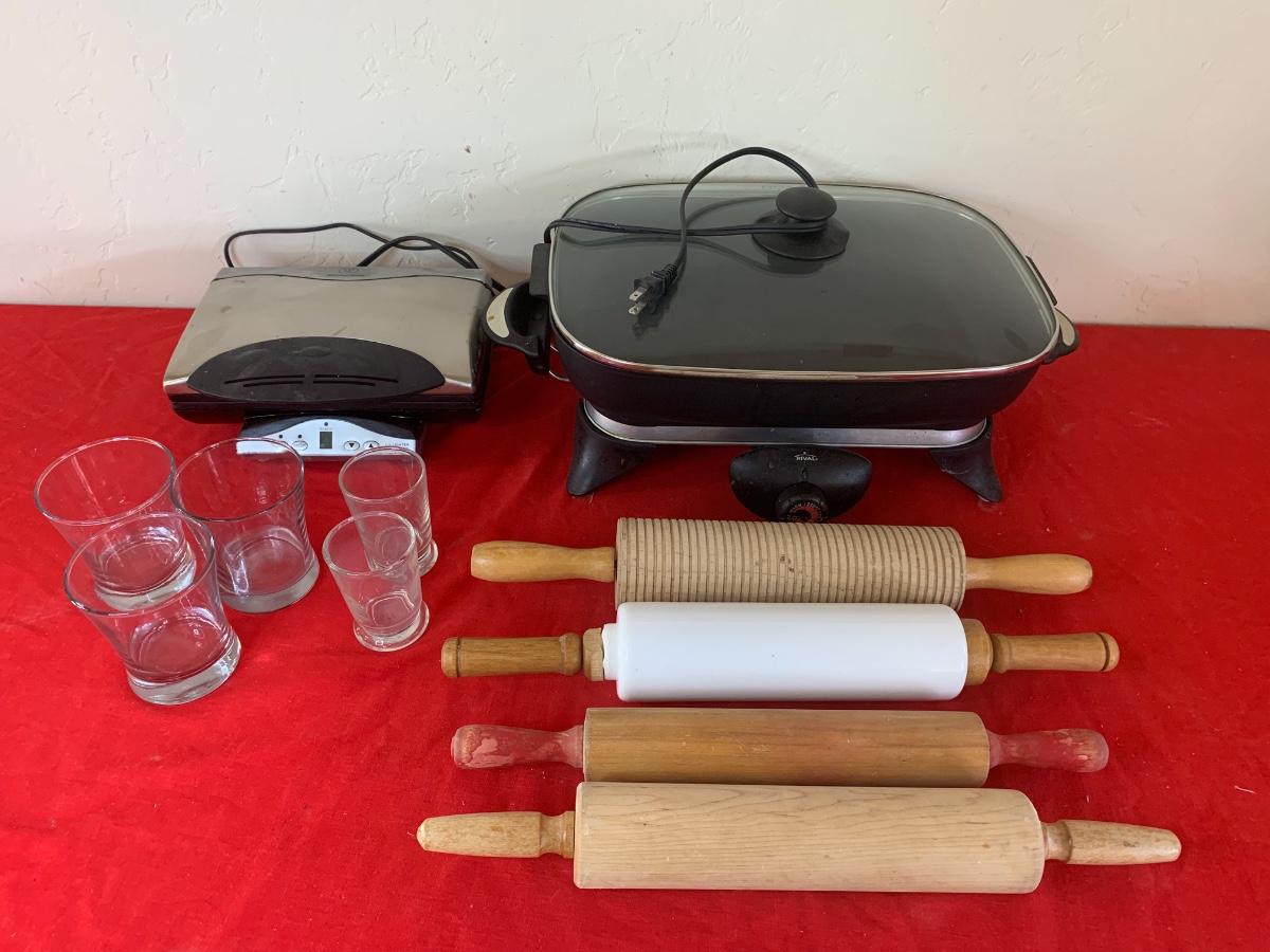 Lot includes a Westinghouse waffle maker and Rival electric roaster, misc glassware and 4 vintage/antique rolling pins all are wood handles, white one is milk glass.