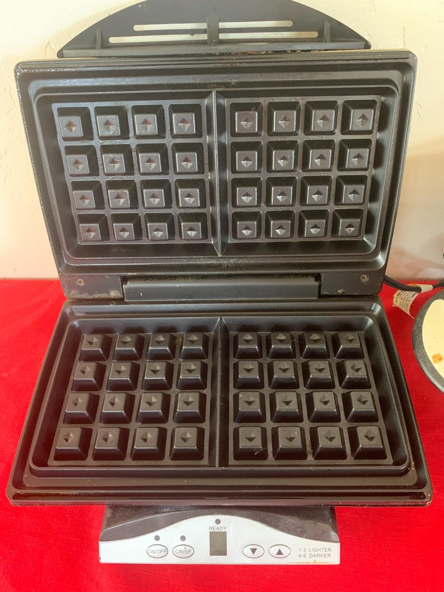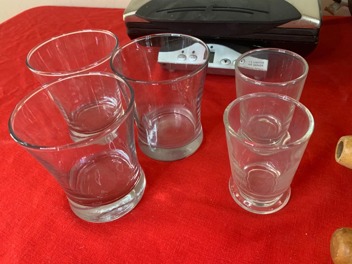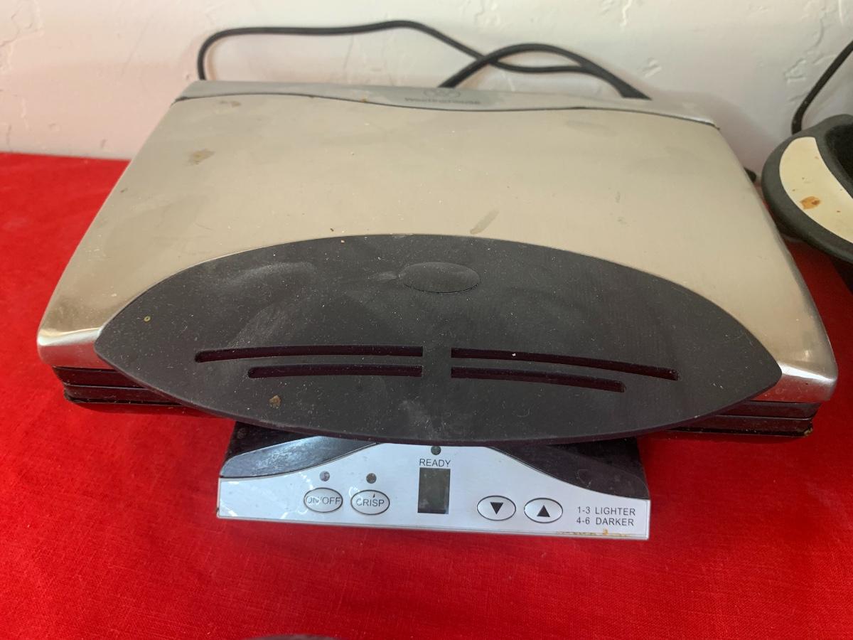 Lot includes a Westinghouse waffle maker and Rival electric roaster, misc glassware and 4 vintage/antique rolling pins all are wood handles, white one is milk glass.