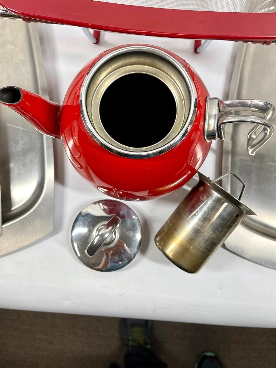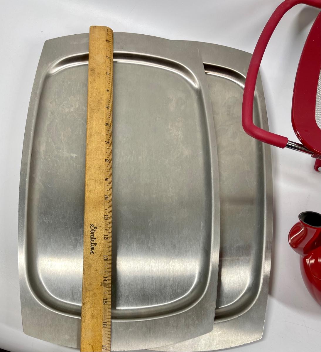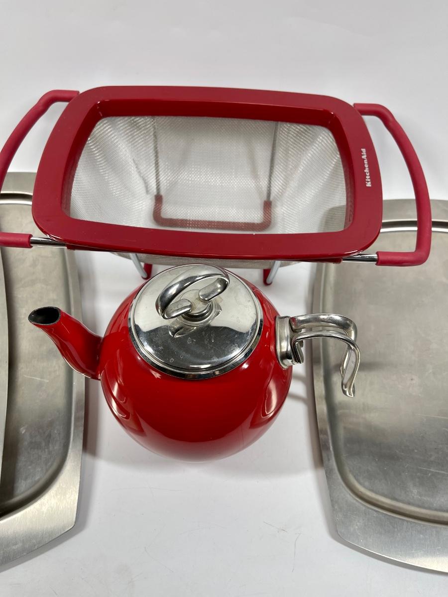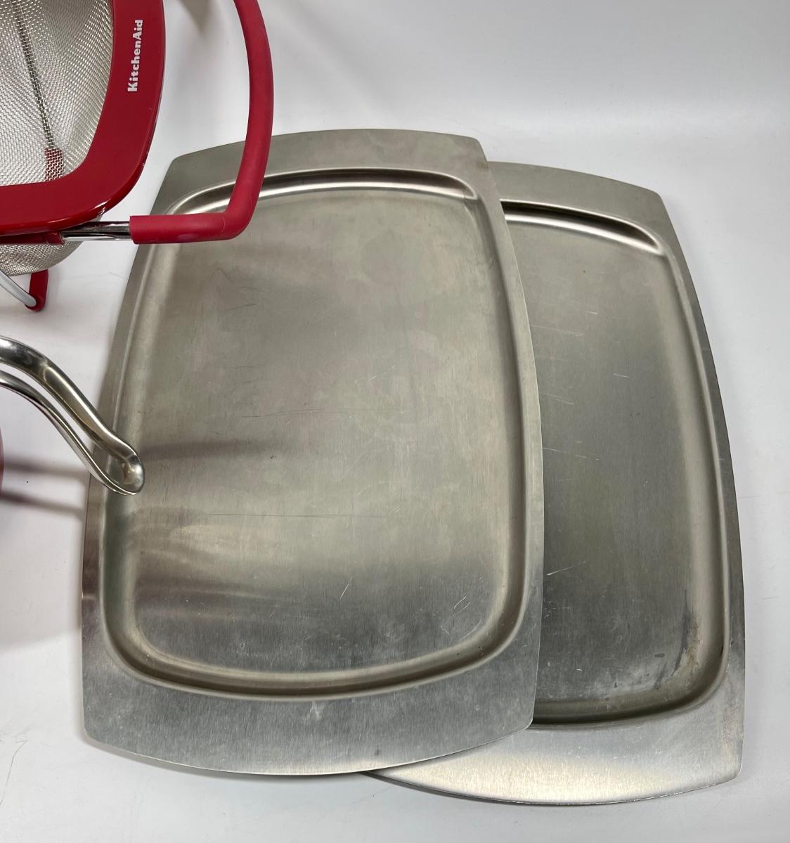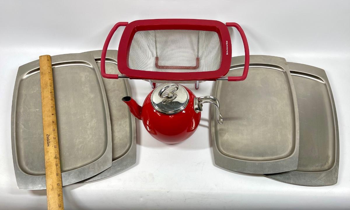 Misc Kitchen Lot - stainless steel serving trays, tea kettle Kitchen-aid strainer