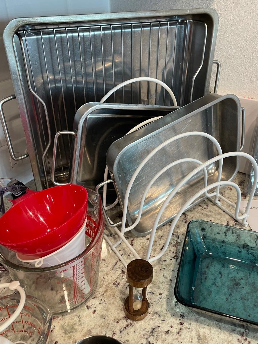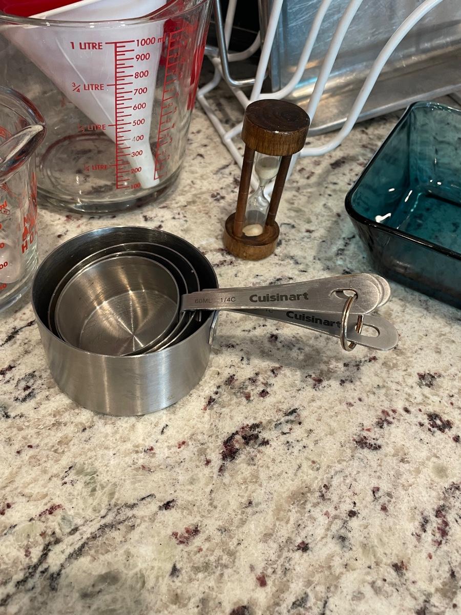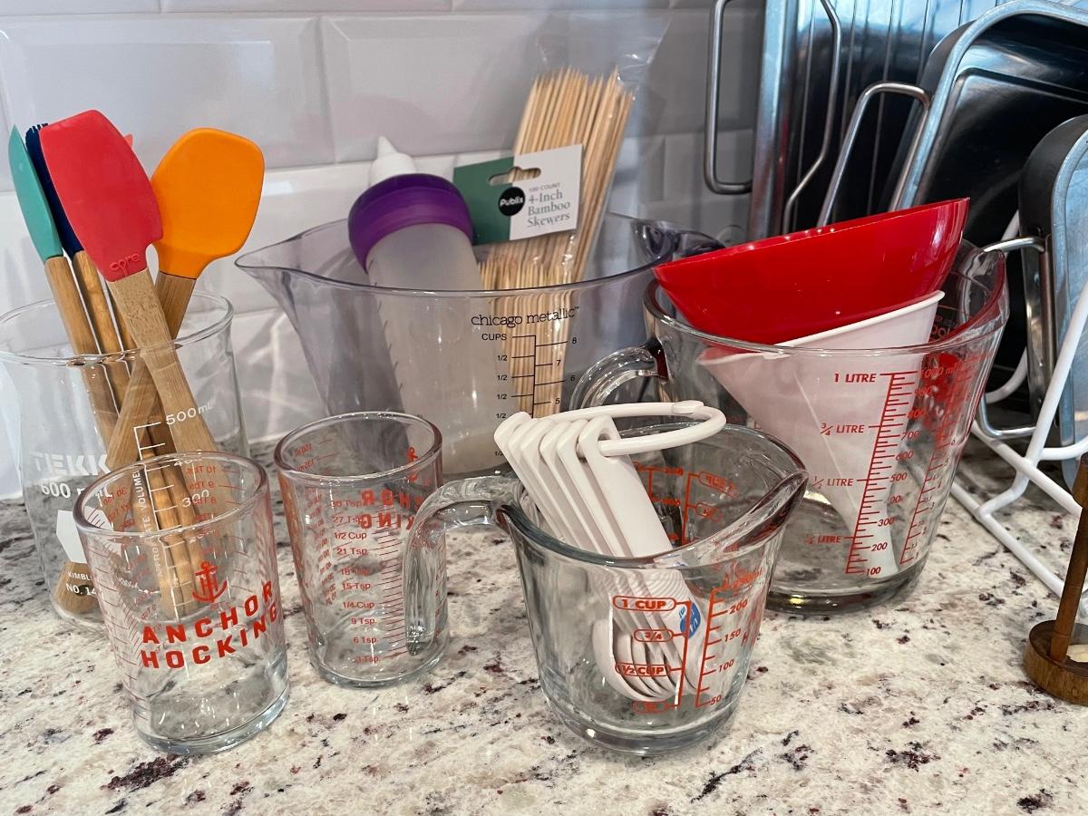 Misc Kitchen lot W/ scale, measuring cups, pans, spatulas