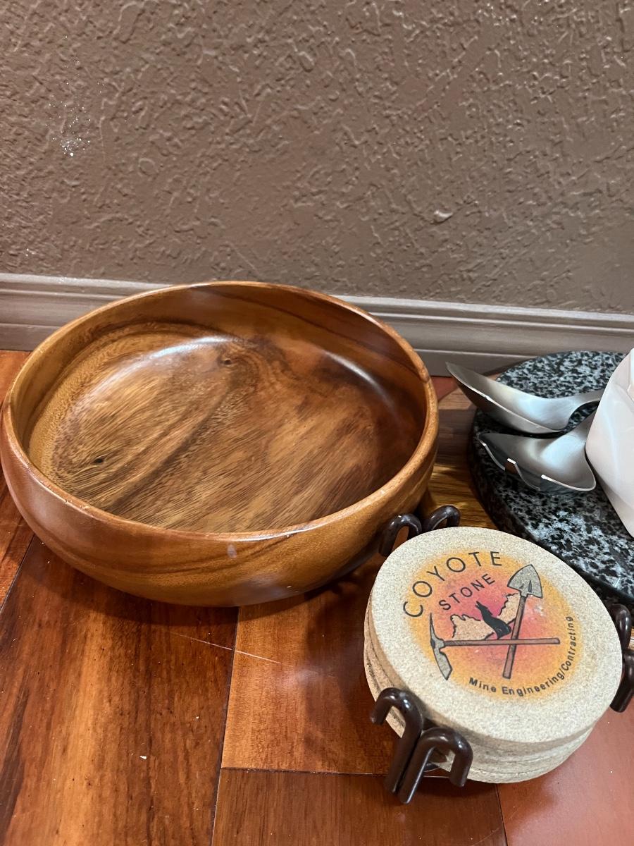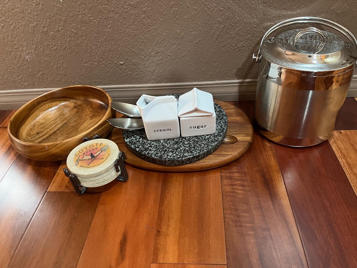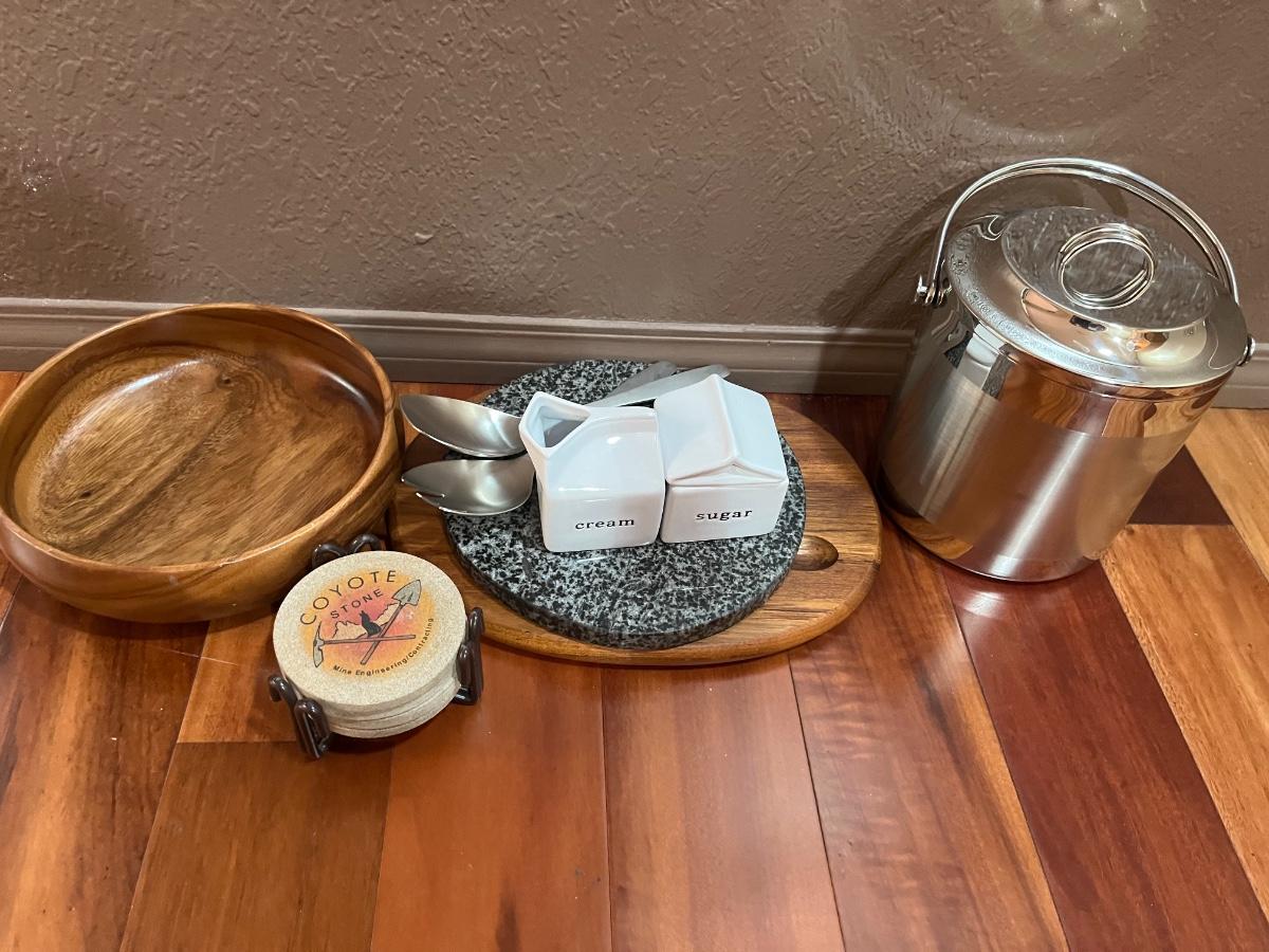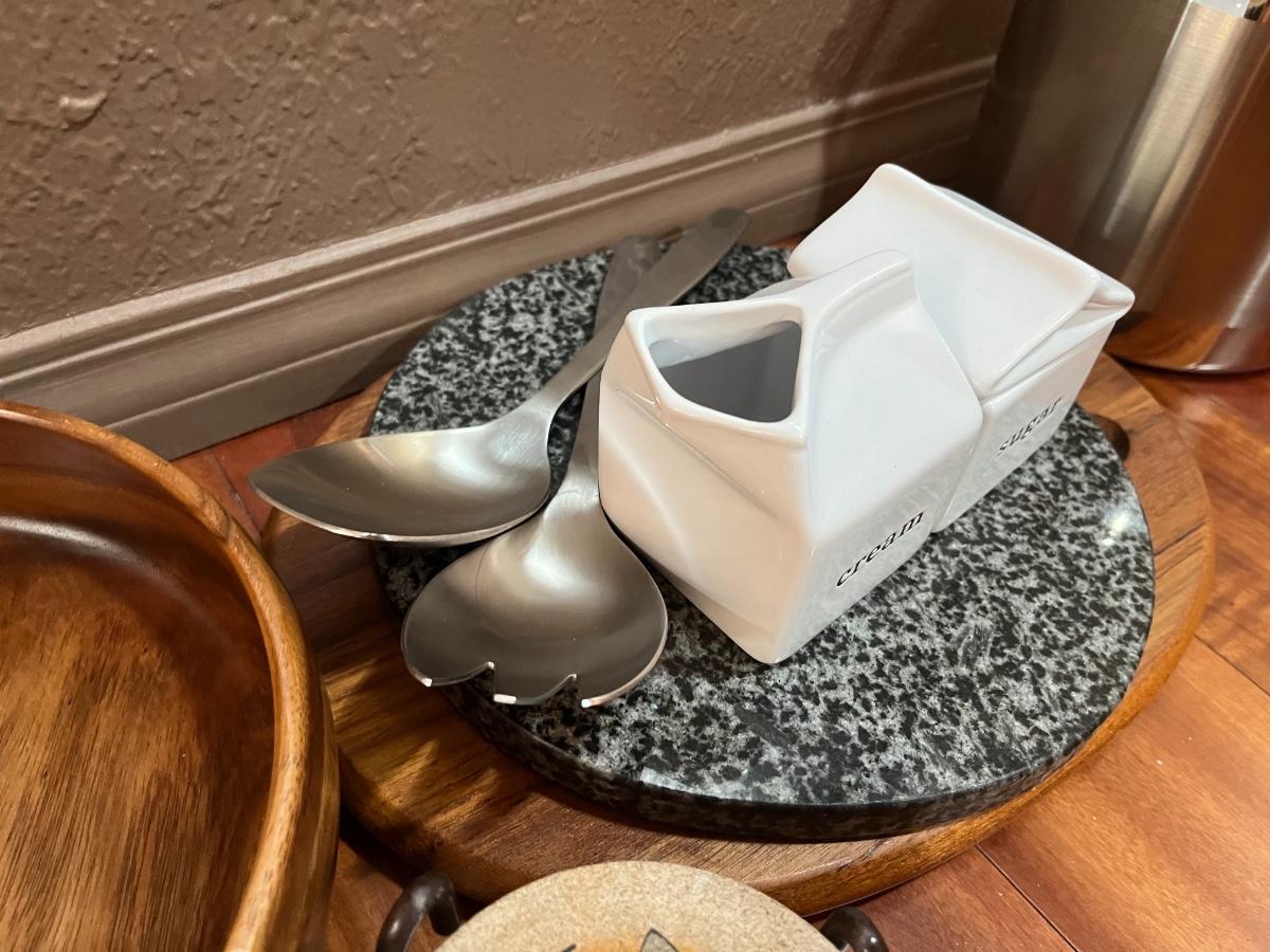Ice pitcher, cream/sugar canisters, giant stainless silver fork/spoon, coasters with stand, wooden setting tray and bowl, marble tray
