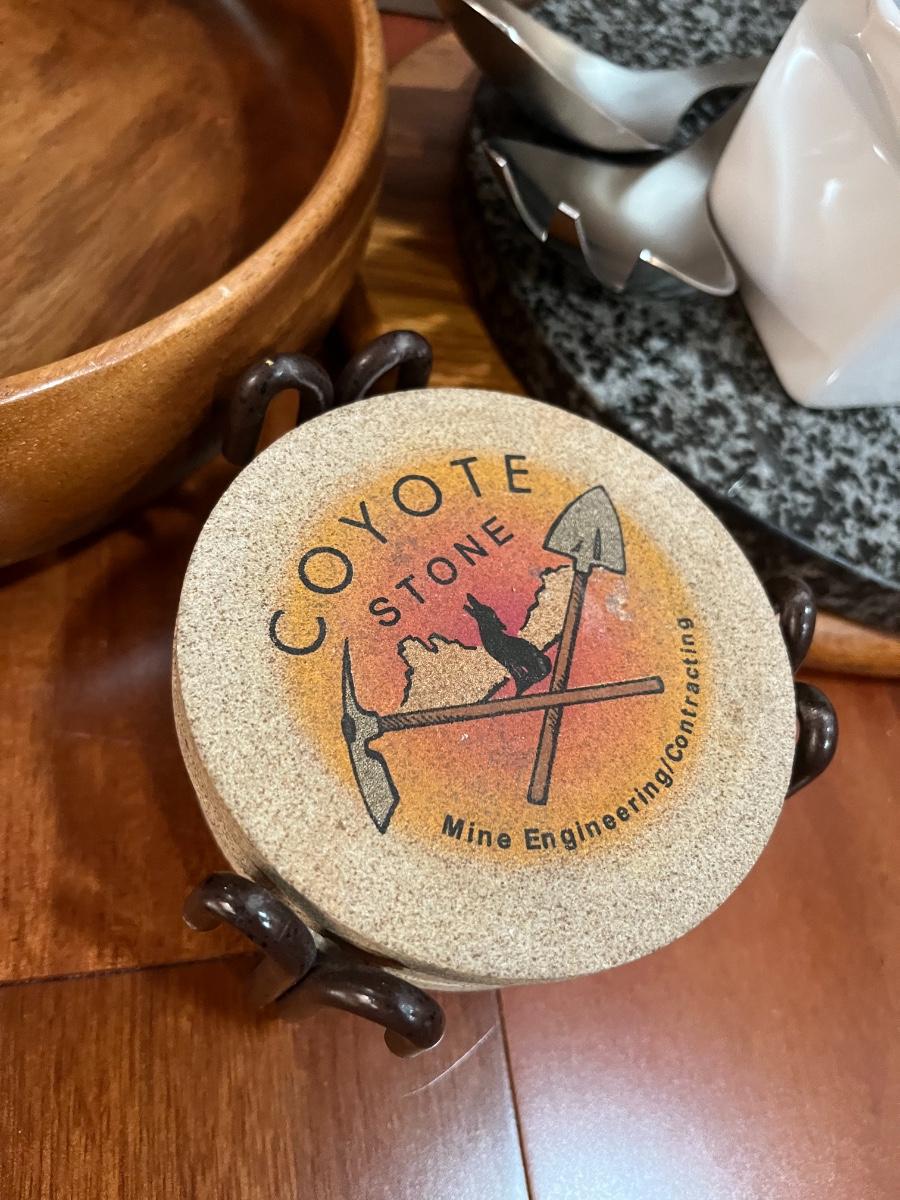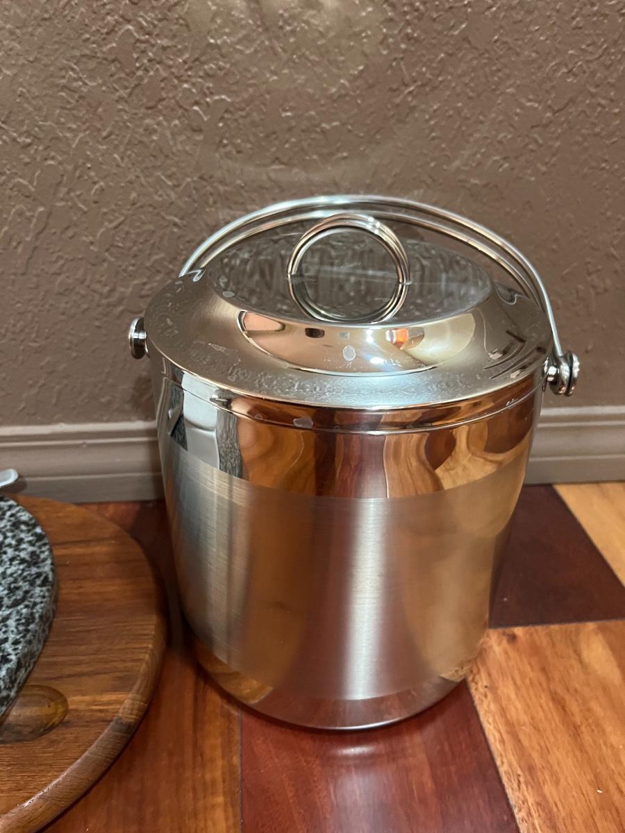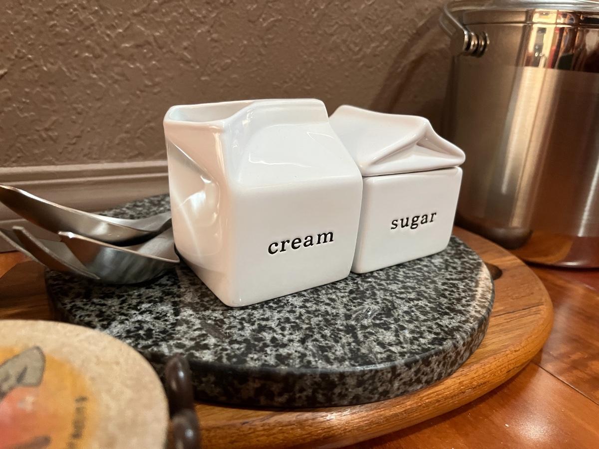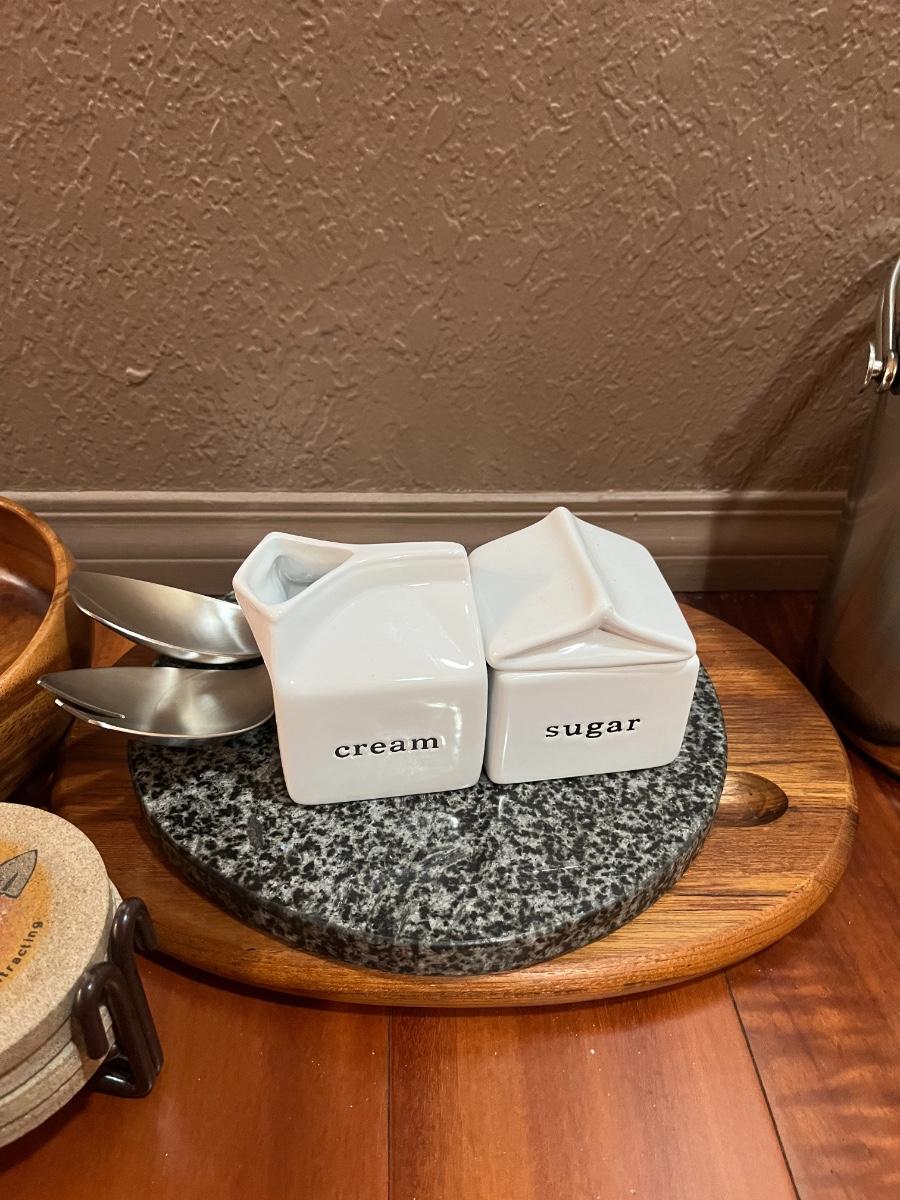 Ice pitcher, cream/sugar canisters, giant stainless silver fork/spoon, coasters with stand, wooden setting tray and bowl, marble tray