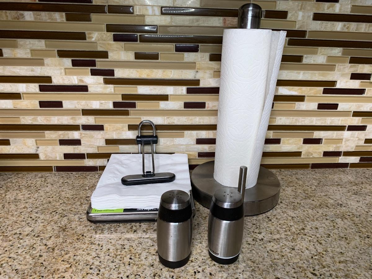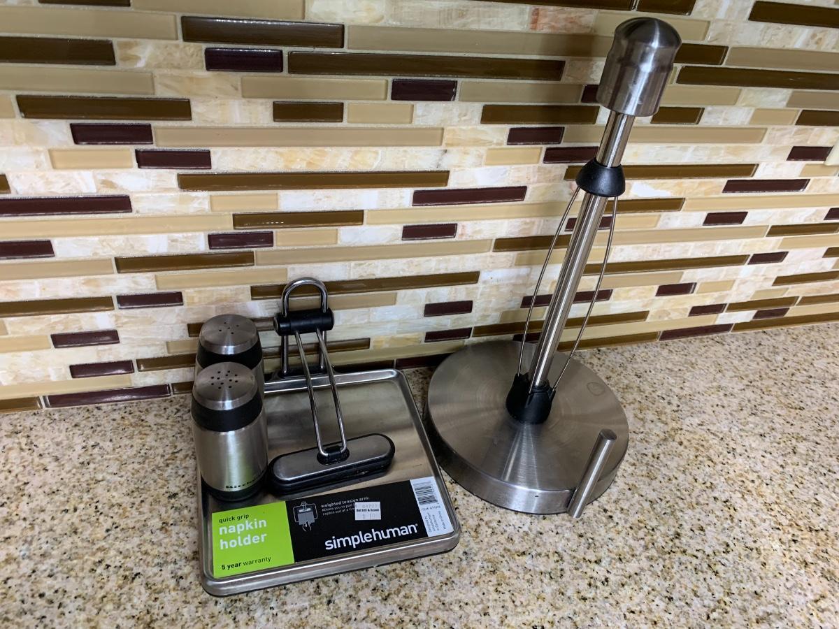 Misc Kitchen Supplies (stainless napkin holder, paper towel holder, and salt &pepper shakers)