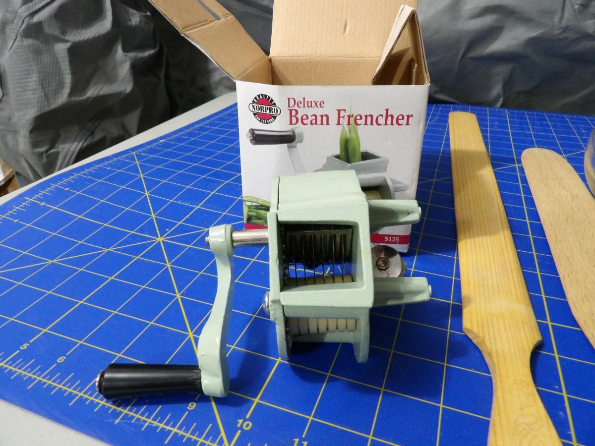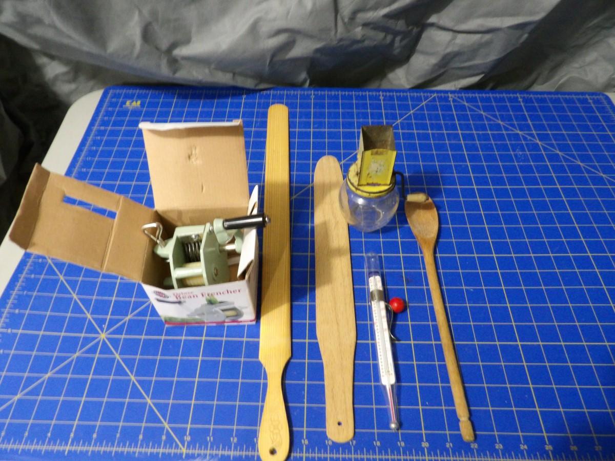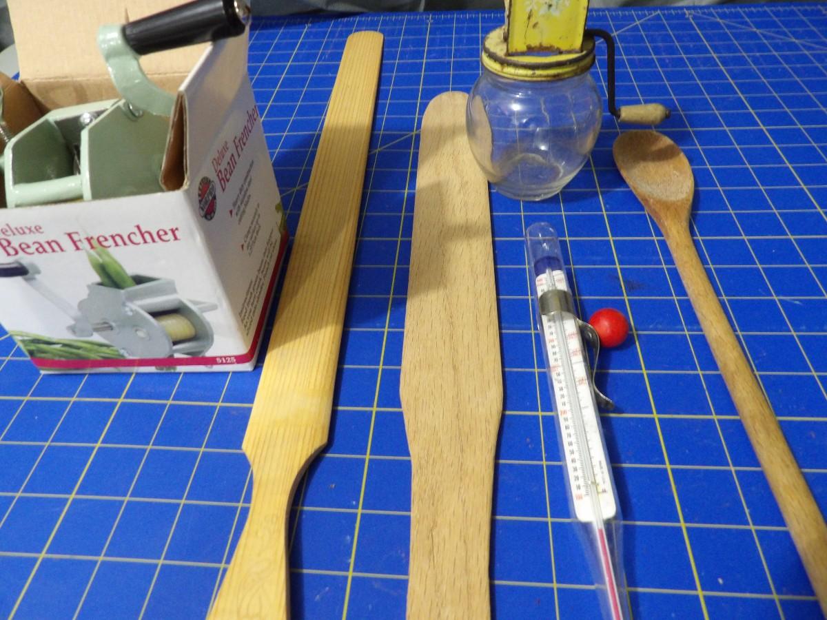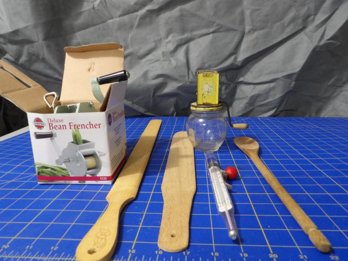 Green bean frencher, Lefse Sticks, Nut Chopper, Candy Thermometer and Wooden Spoon