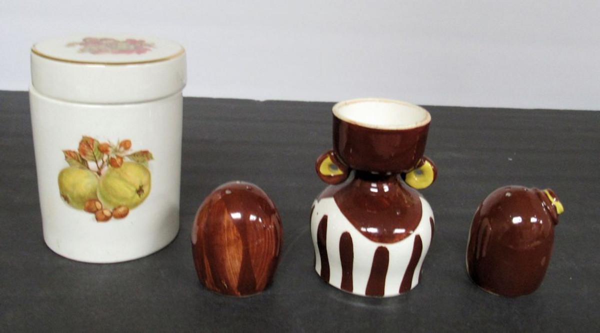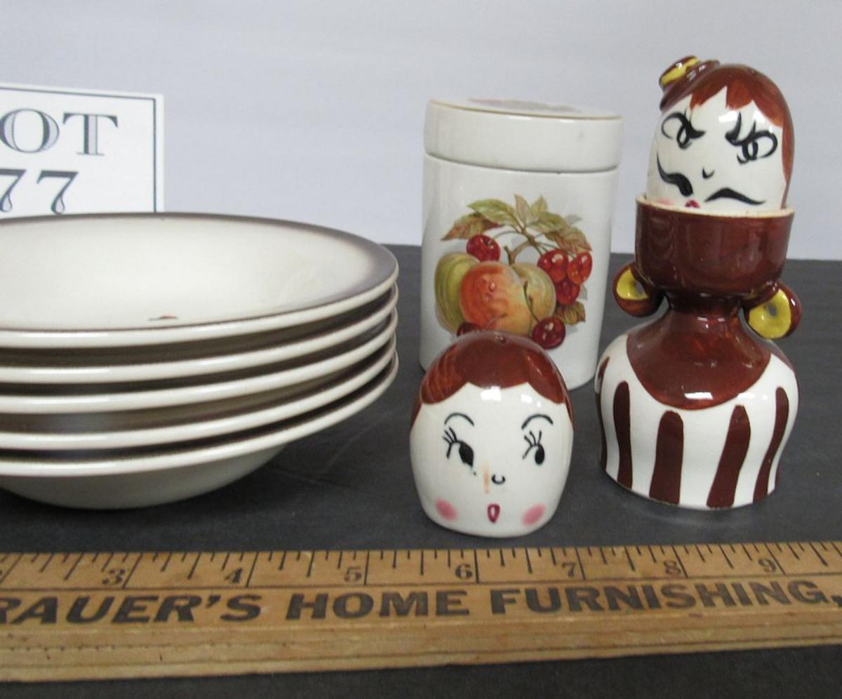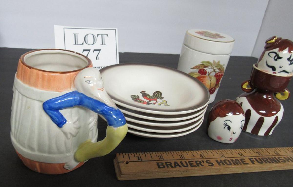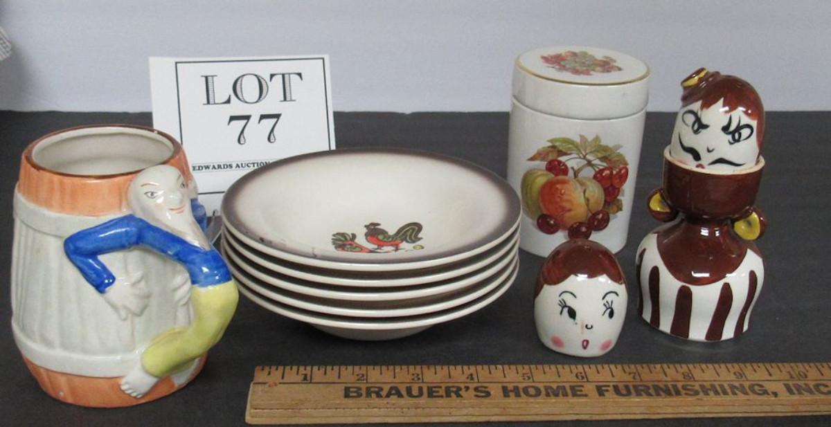 Misc Kitchenware Lot, Figural Shakers and Eggcup, Figural Mug, Metlox Red Rooster Bowls, More