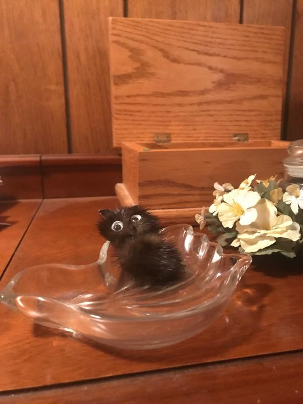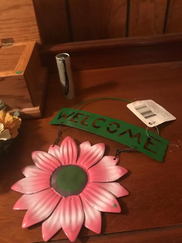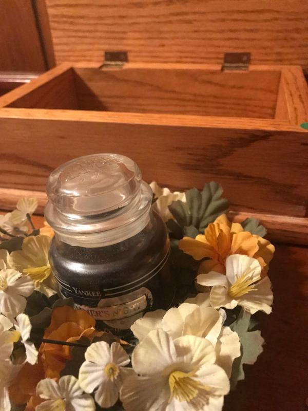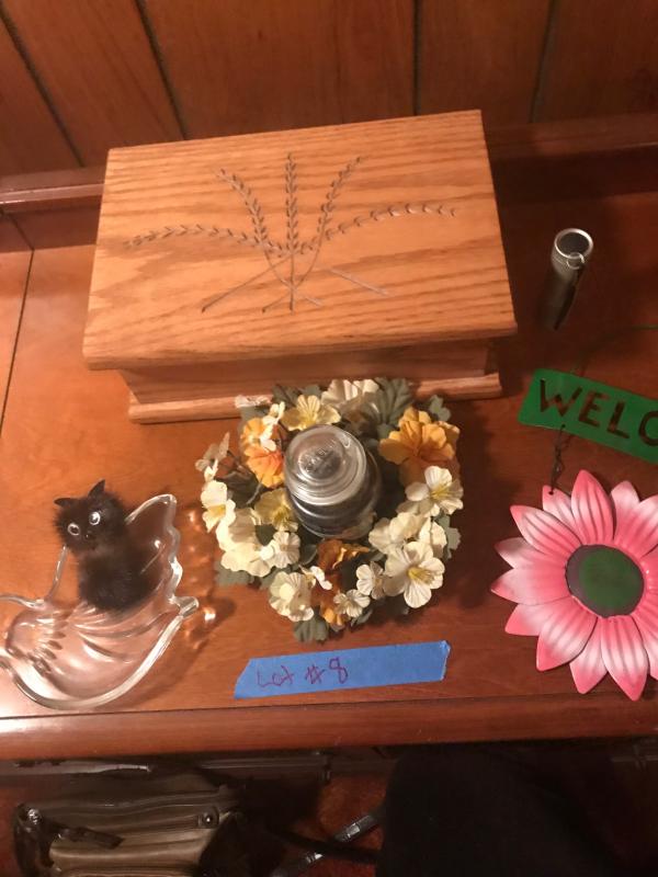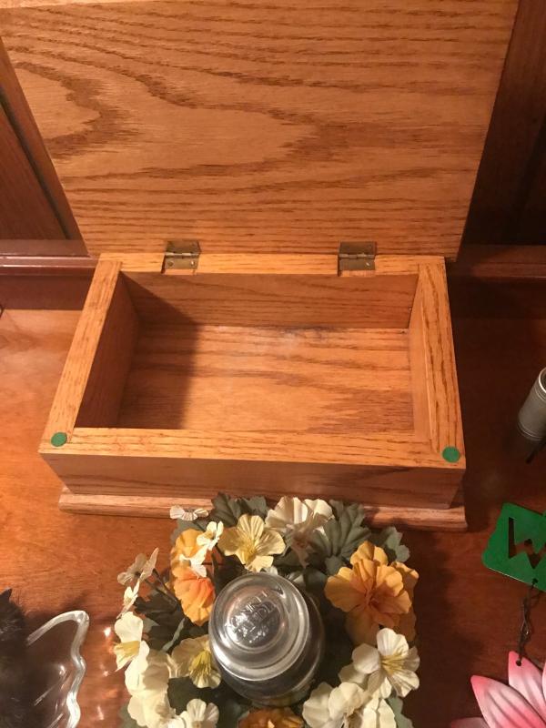And oak bachelor box measures 8x7x4, with a dove dish, candle, flower, candle holder and a metal welcome sign and flash light. Tested and working.