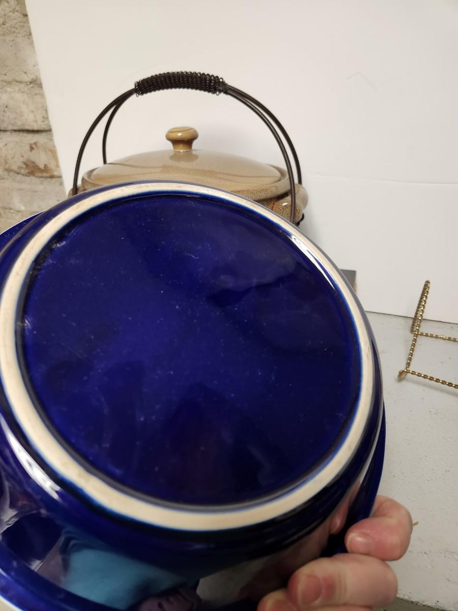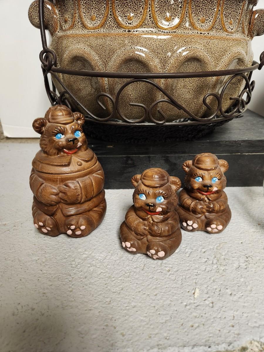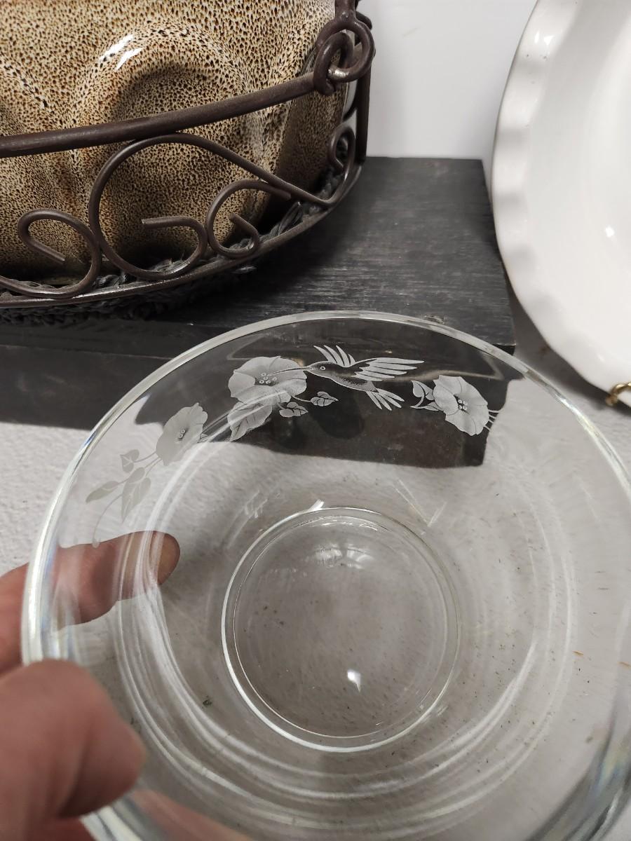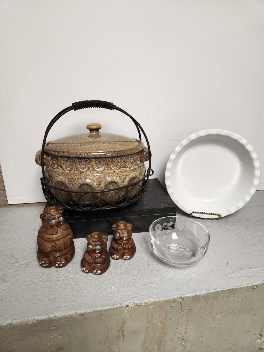 Avon hummingbird bowl, cobalt pie plate, bear salt and pepper and small container, casserole and basket