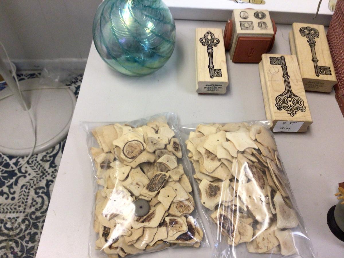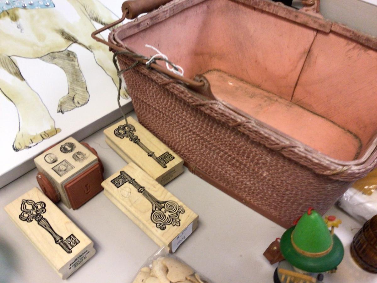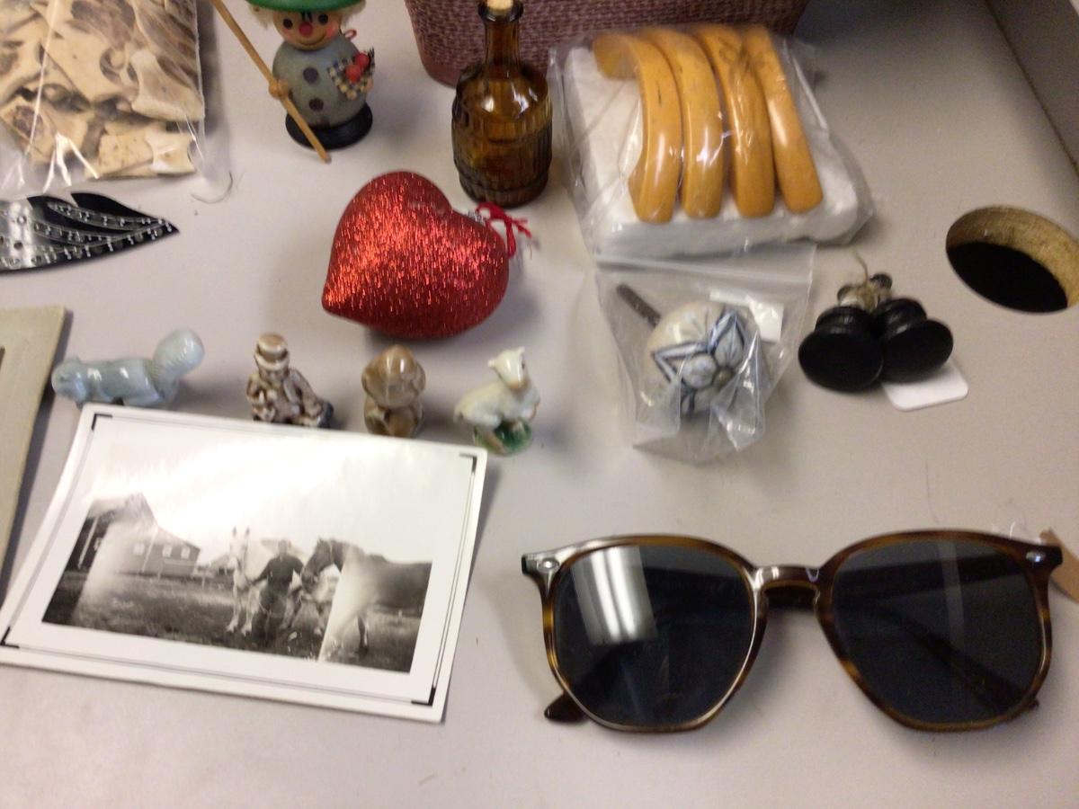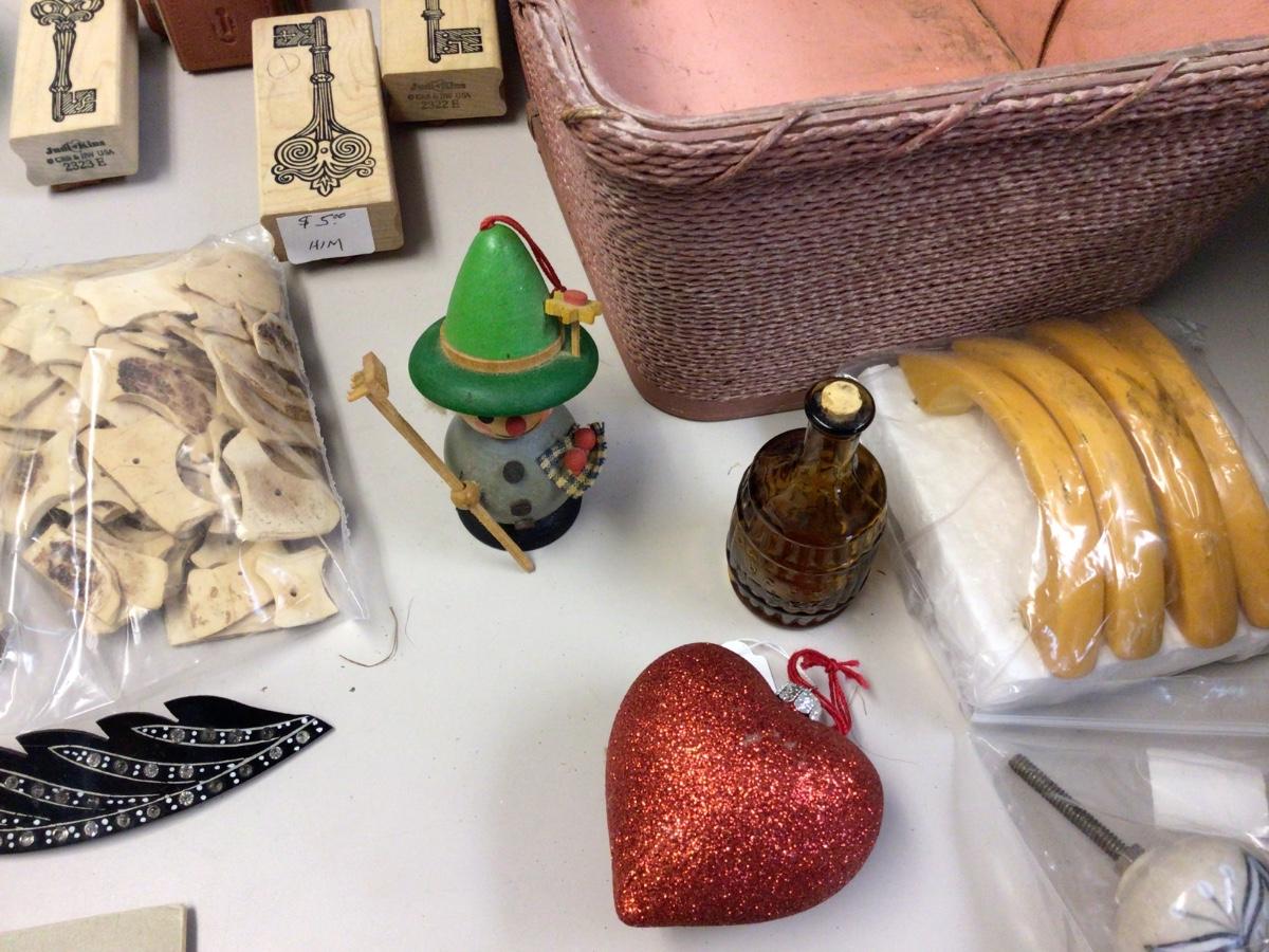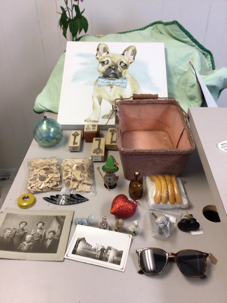 You get French Bull dog pictures, pink basket,glass ornament, wood puzzles, key stamps, door knobs, wade figurines, vintage pictures, vintage glasses, vintage hair pin, vintage lip balm, glass jar, misc