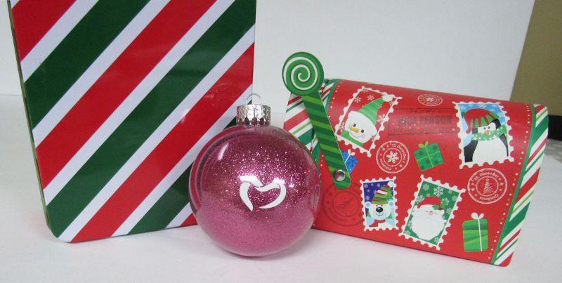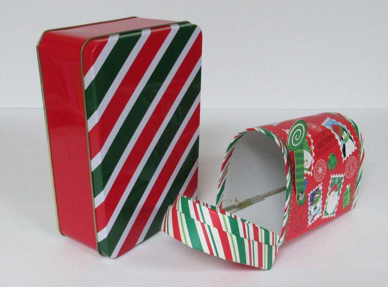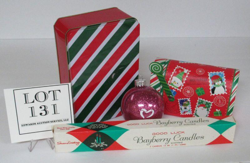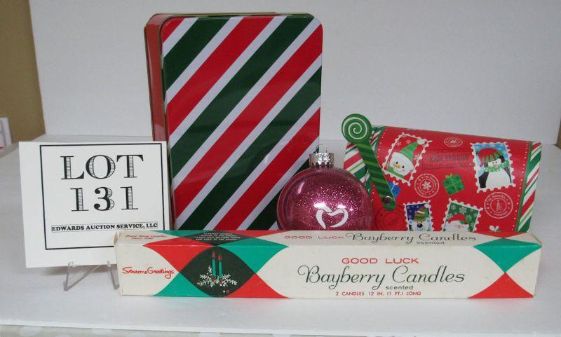 Christmas metal box, cardboard mailbox, glass ornament, unused vintage Bayberry taper candles in original box. Nice overall,some wear on the boxes.