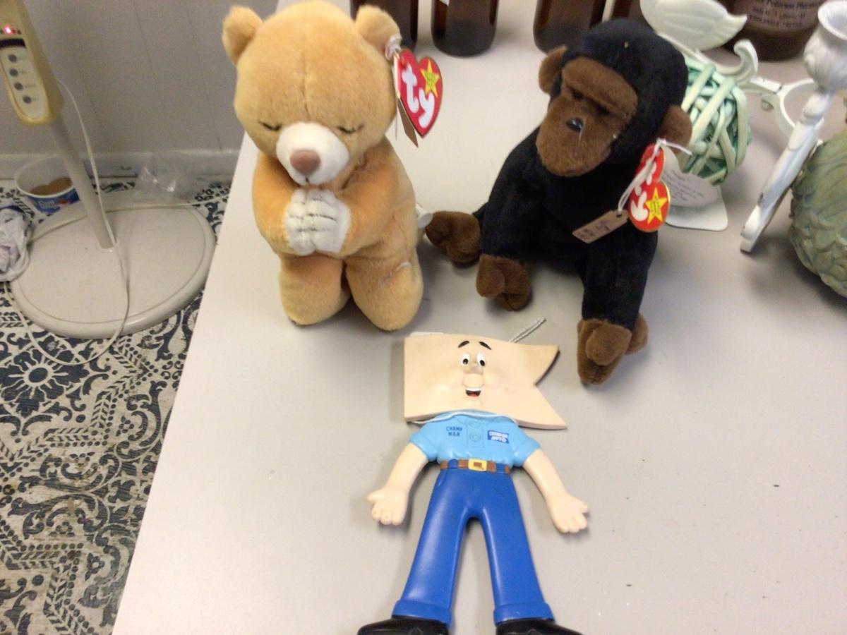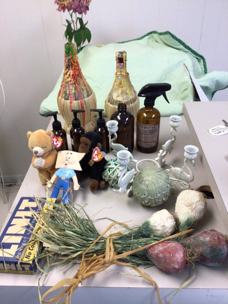 You get MCM bottle candle holder, bottles, metal candle holder, Ty beanie babies, lint, fake veggies, misc