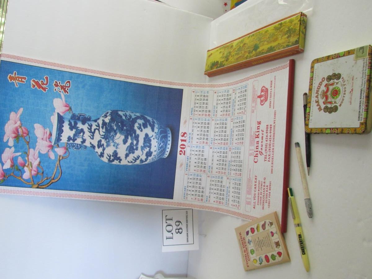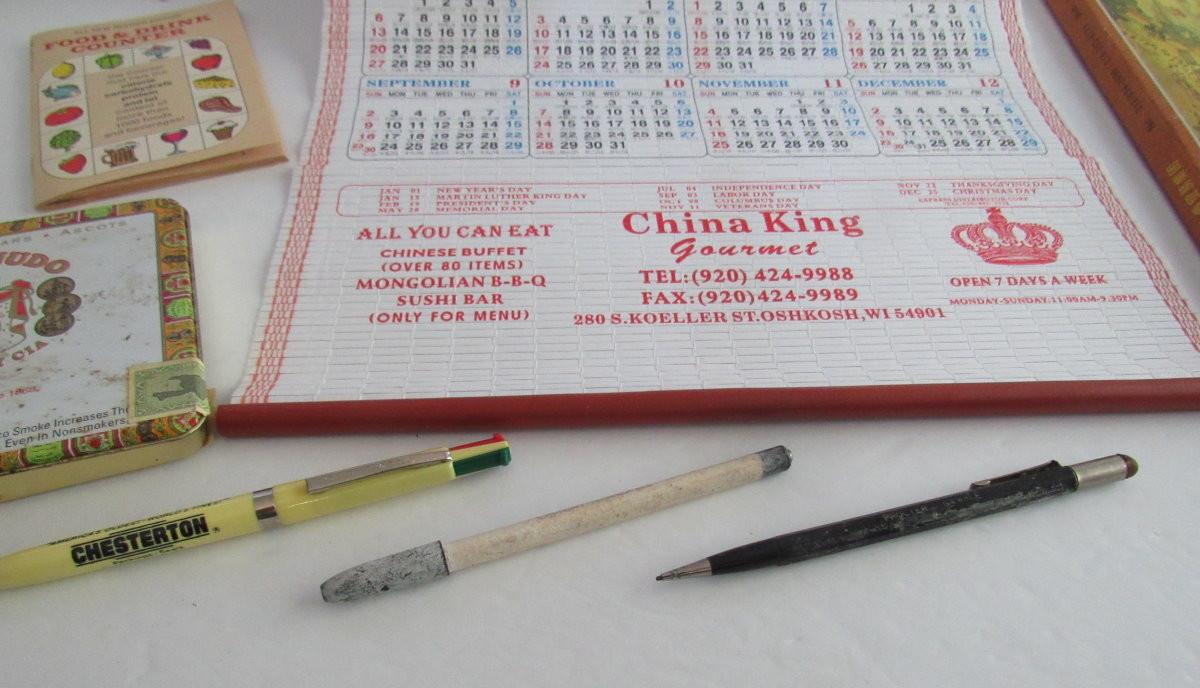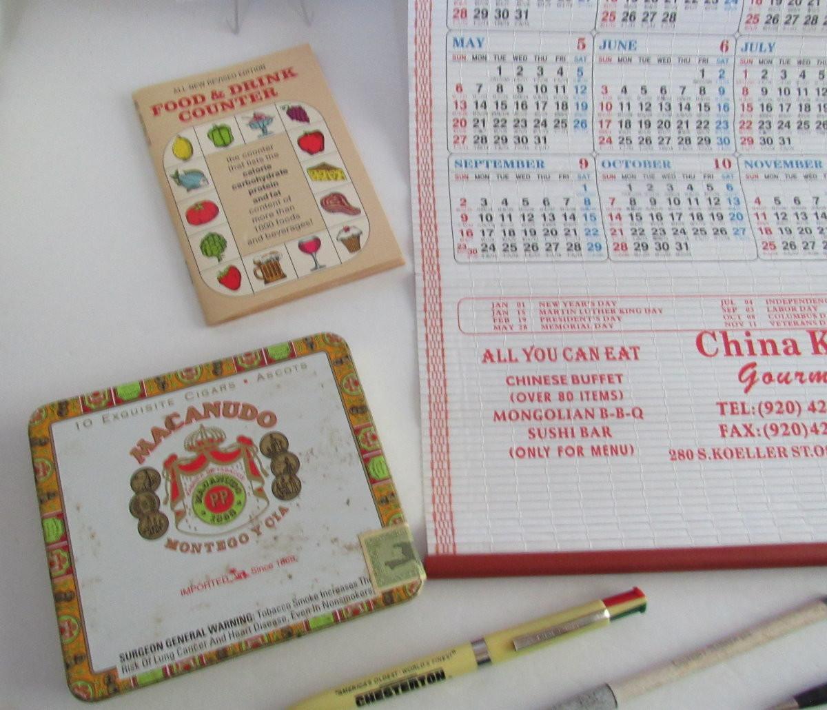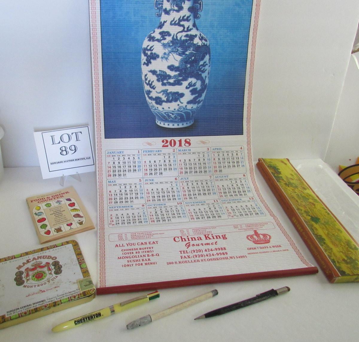 The 2018 Calendar was unused. The booklet is very nice. The tin isn't too old, has wear in spots. The pens need a good cleaning and I didn't try them. Shipping available at shipping cost plus $5.00 per box handling fee. See our terms for details.