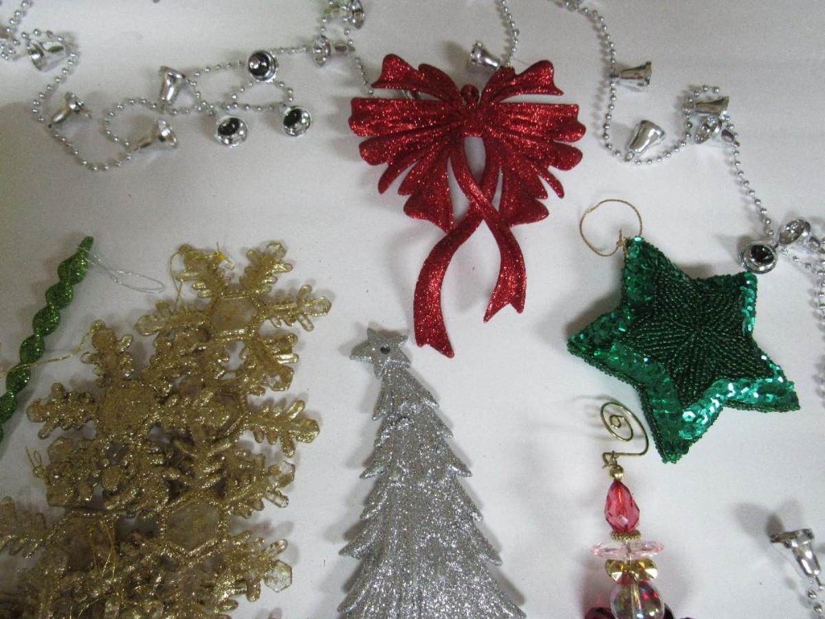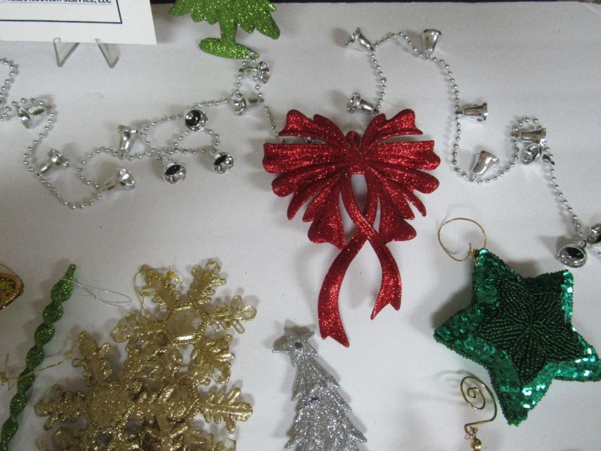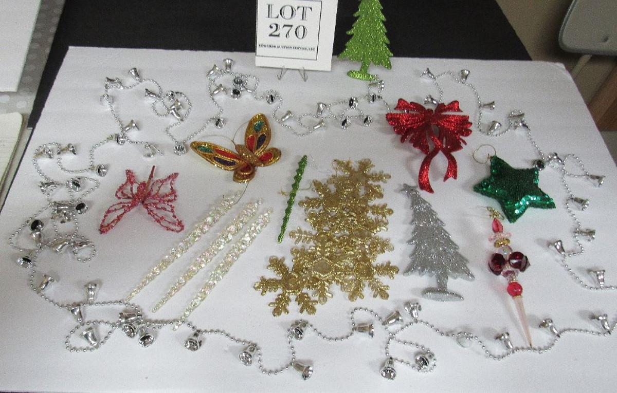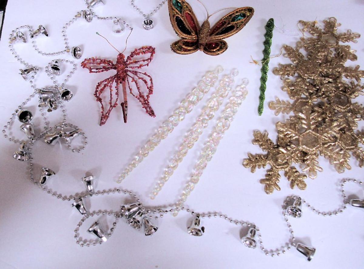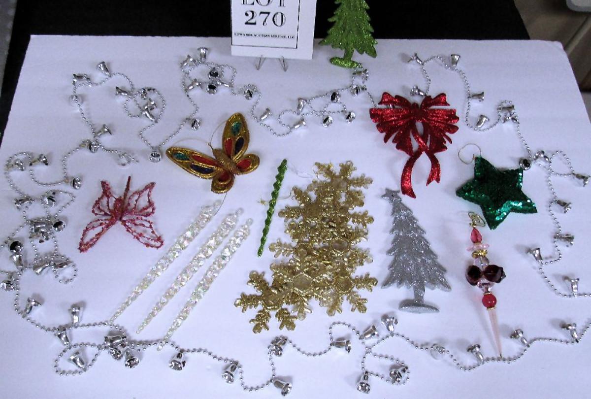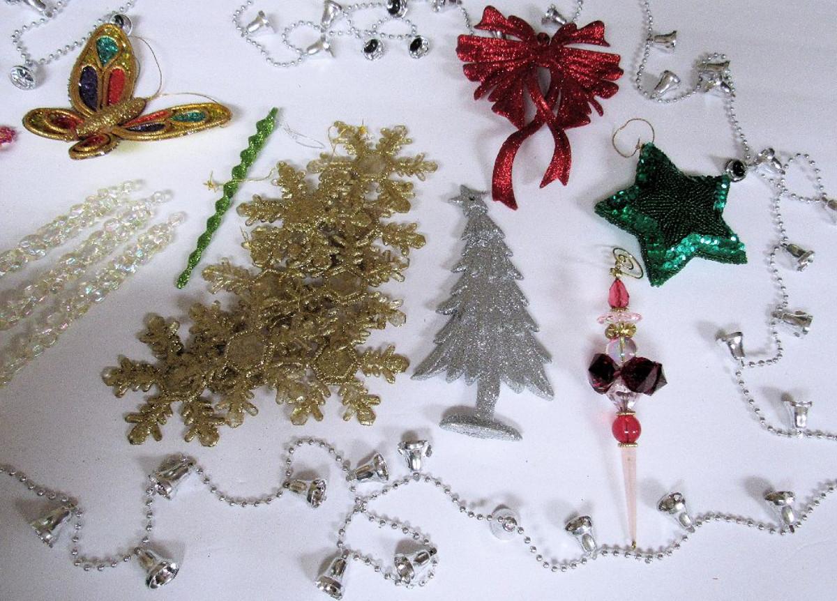Misc Lot of Glittery Christmas Ornaments and Very Long Bell Garland