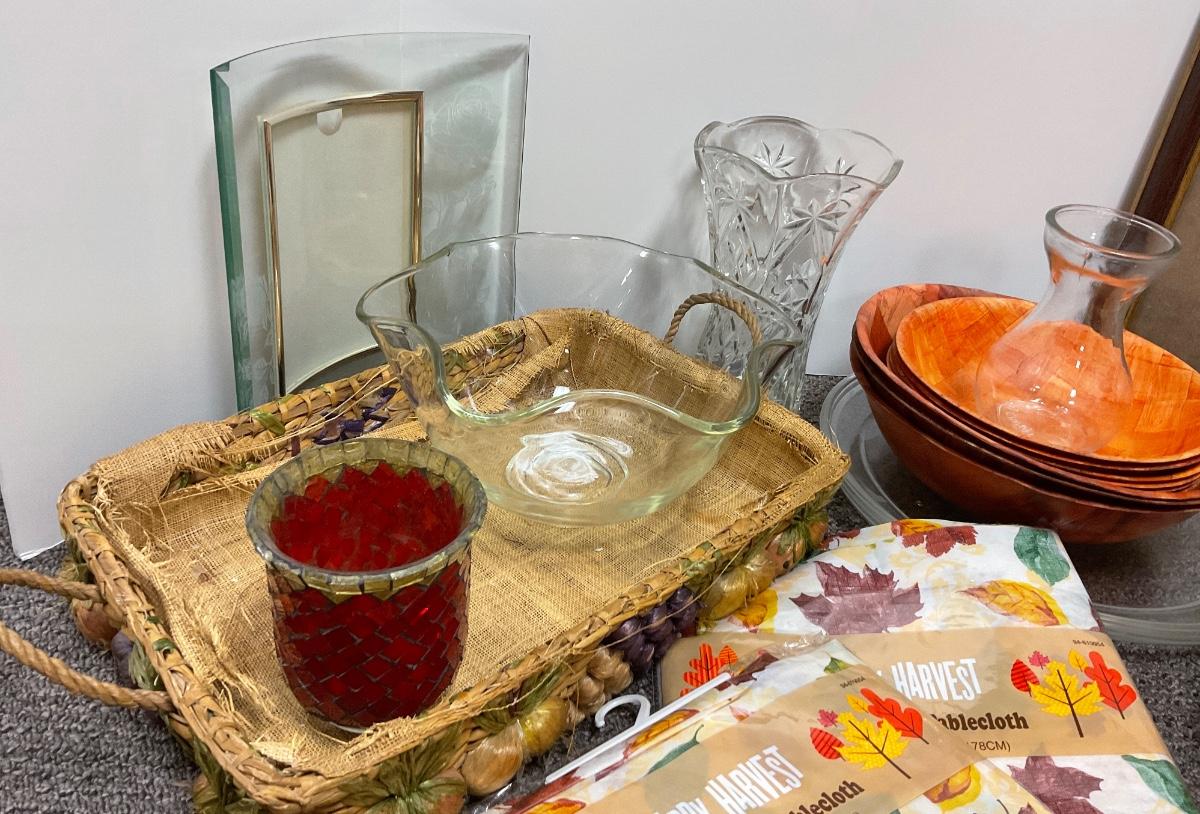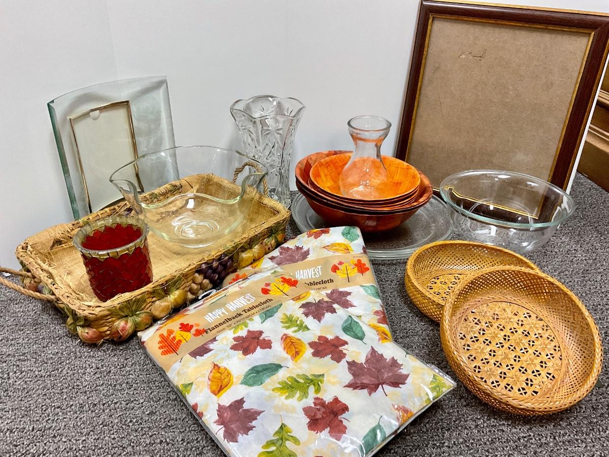 Misc Lot of Kitchen Serving Ware & Home Decor - picture frames, baskets, bowls, vases, etc