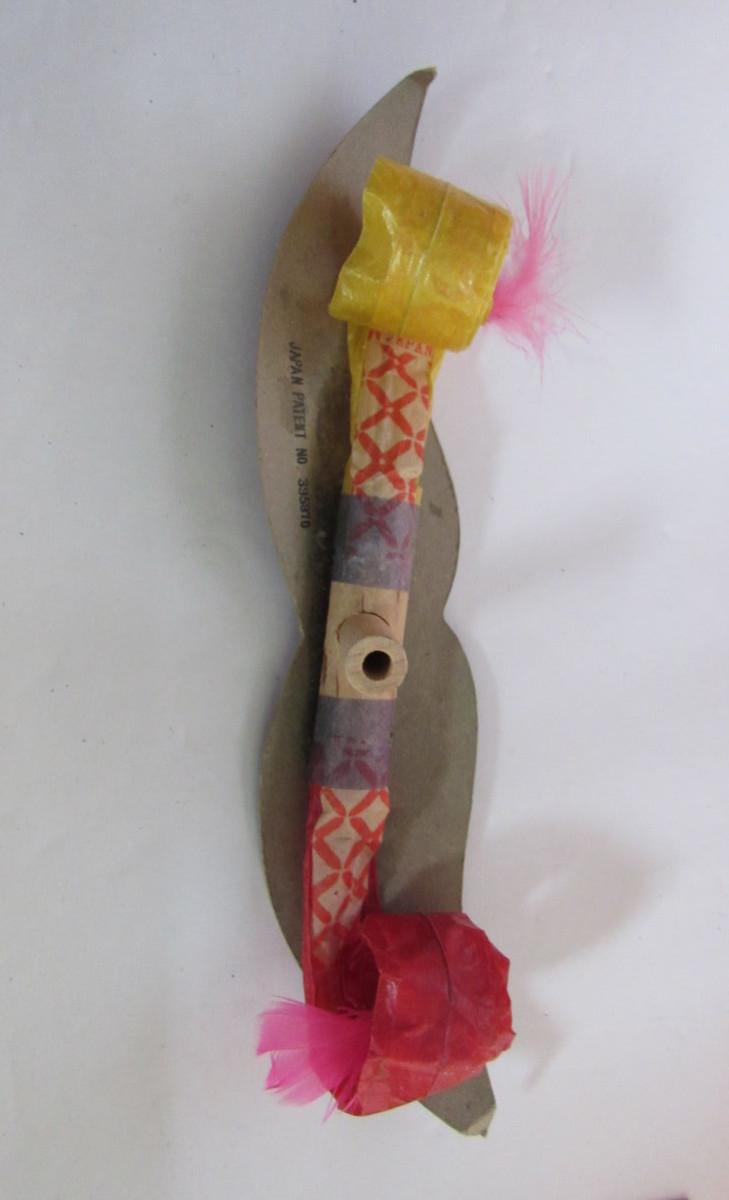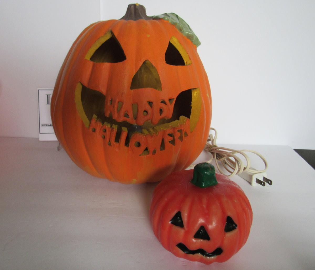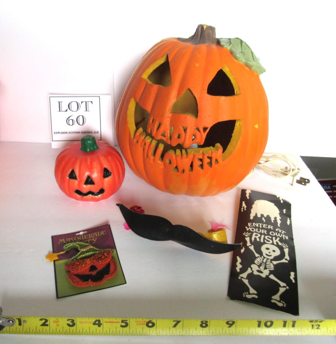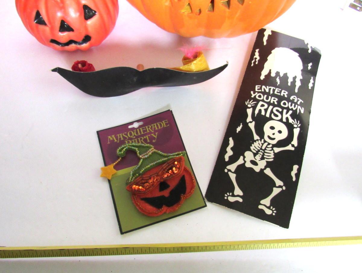 A neat vintage Japan mustache blow out horn, no noise but blowouts work. Marked Jap Pat 395970. Electric foam Jack-O-Lantern, unused candle, sequined jewelry/pin, door decor.