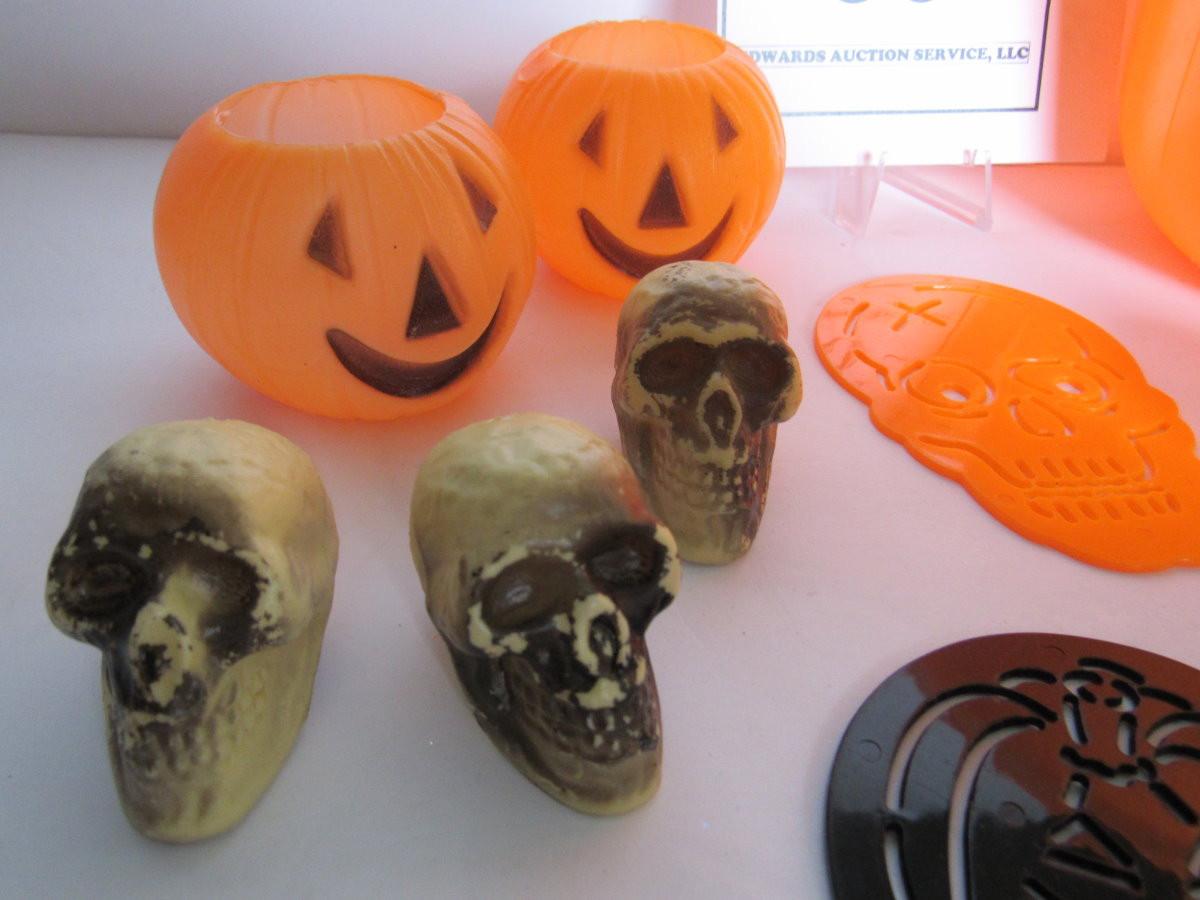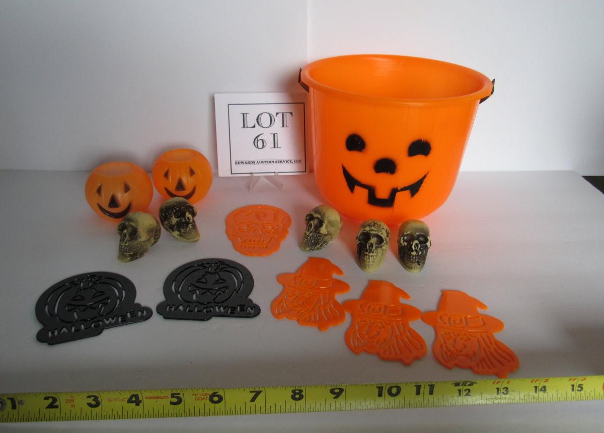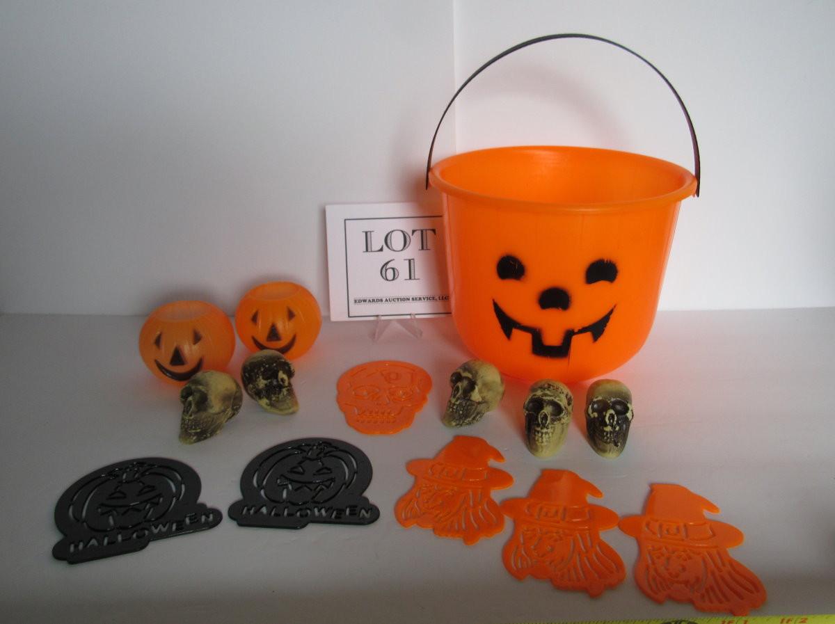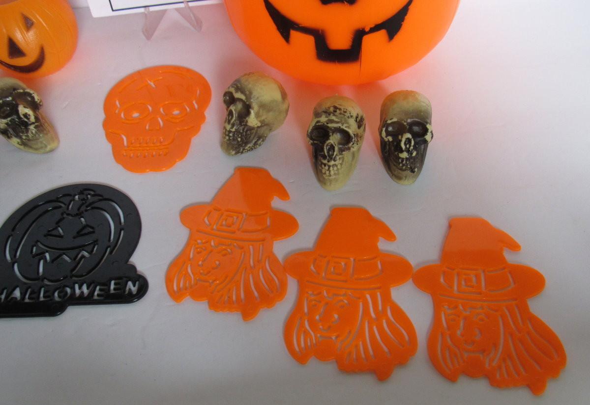 The skulls and bucket have minor paint wear. The thin plastic pumpkins and stencils are fine. Shipping is available on this lot with additional shipping and handling fees. Please see our terms for details.