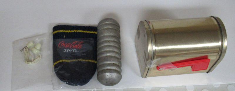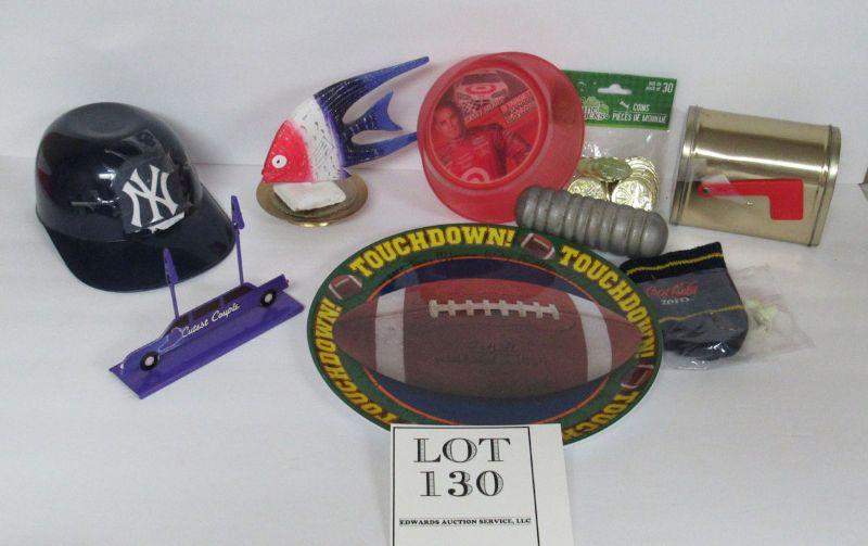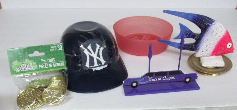 GB Packers plate, has wear, NY Helmet, taped, wood fish, unused St. Patrick's plastic coins,Coca Cola tiny hat. Little tin mailbox,plastic bowl and metal thing I have no idea what it is.