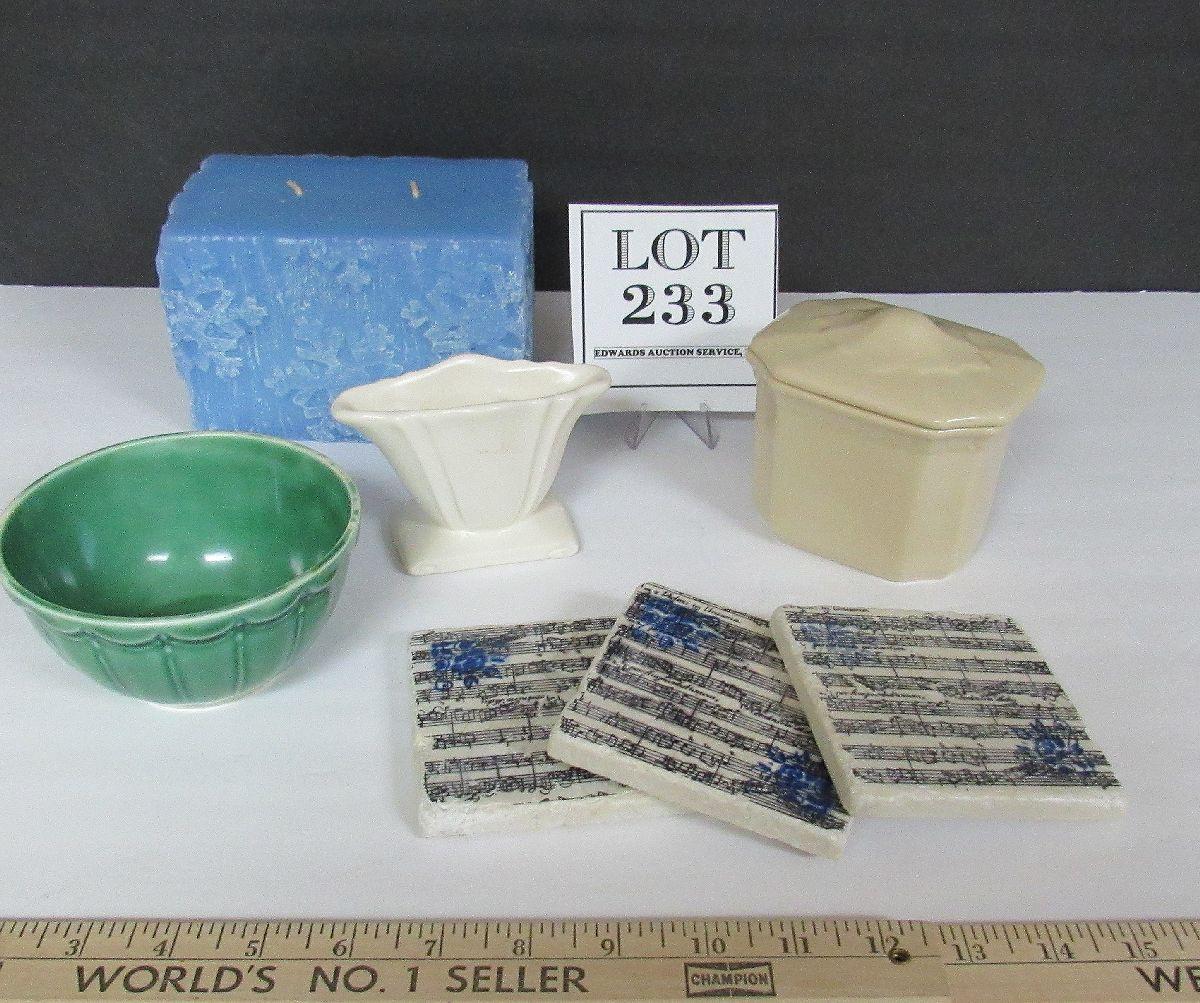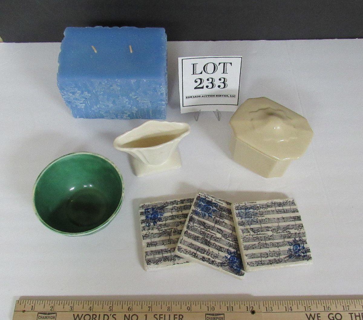 Candle is snowflake themed and is quite large. The bowl has crack, Syracuse China covered dish is nice as is the small vase. Shipping is available at shipping cost plus $5.00 handling fee on one box, $10.00 handling fee on two boxes, $15.00 handling fee on 3 boxes. Helps cover shipping materials and labor cost.