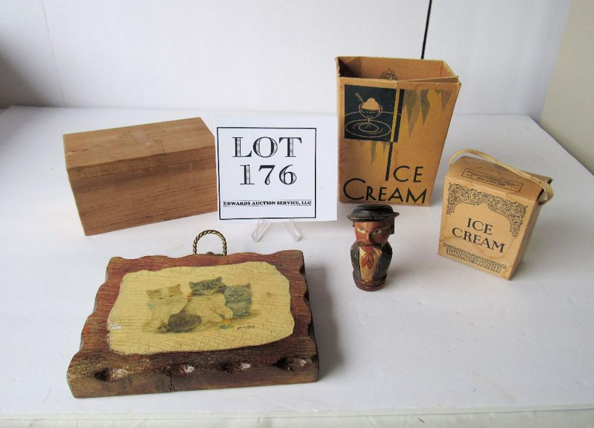 Misc Lot of Stuff: Vintage Ice Cream Boxes, Carved Wood Stopper, More