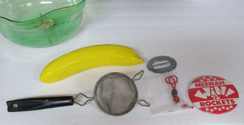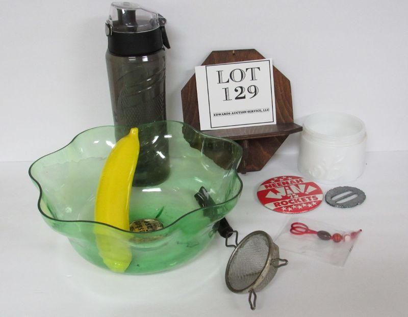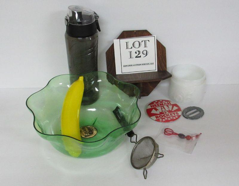 Small wood wall shelf, water bottle, bowl, strainer, milk glass jar no cover, metal belt end,pinback button, plastic bead piece.