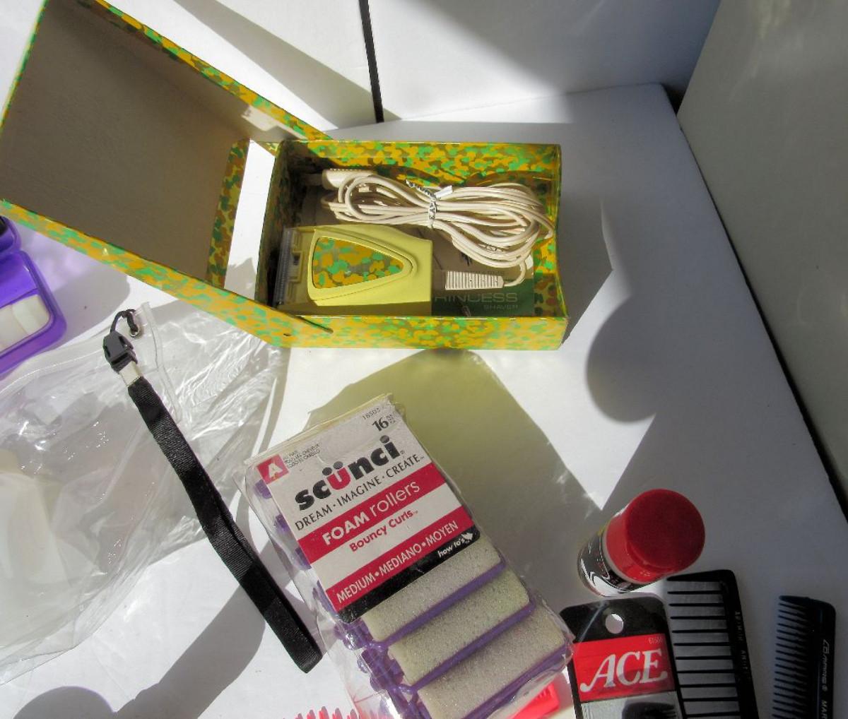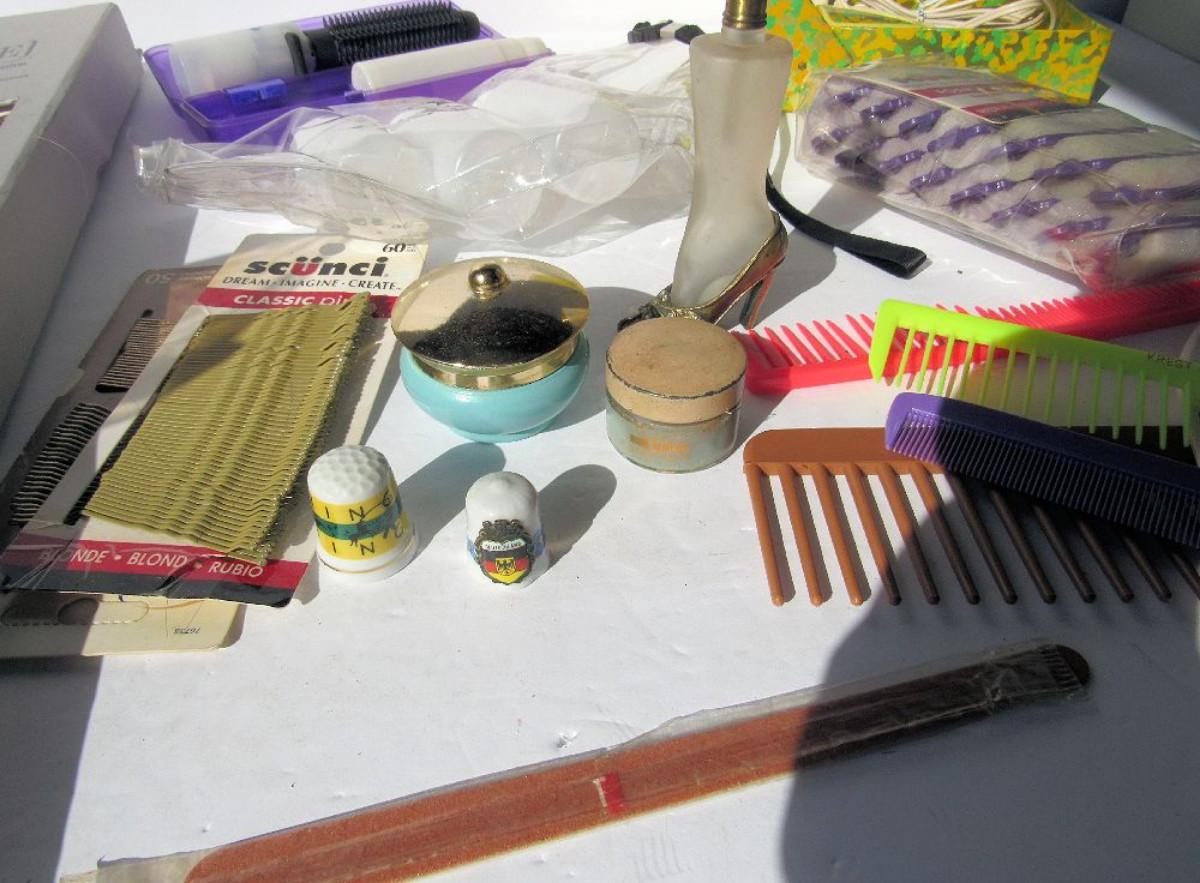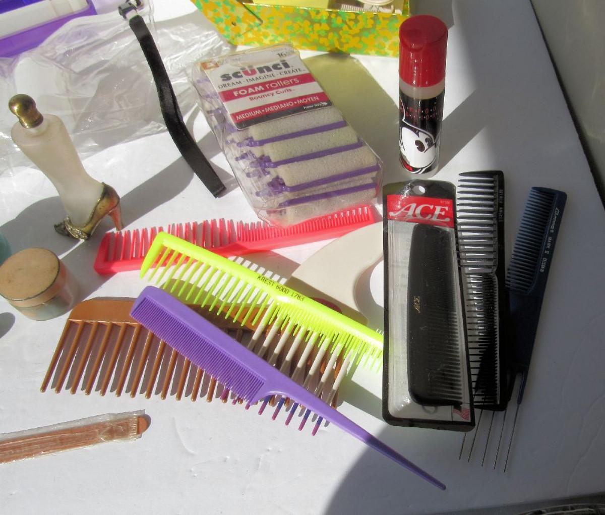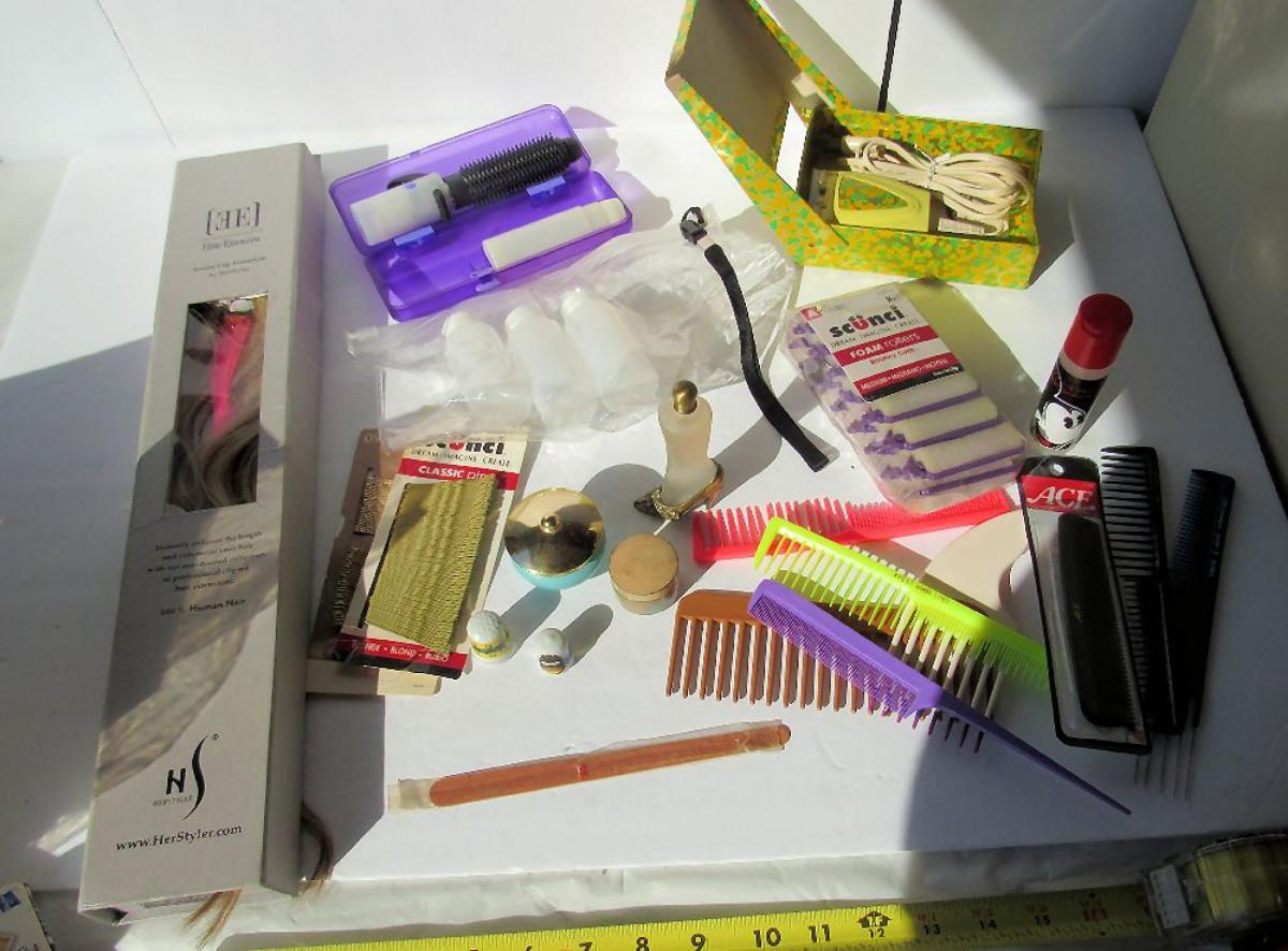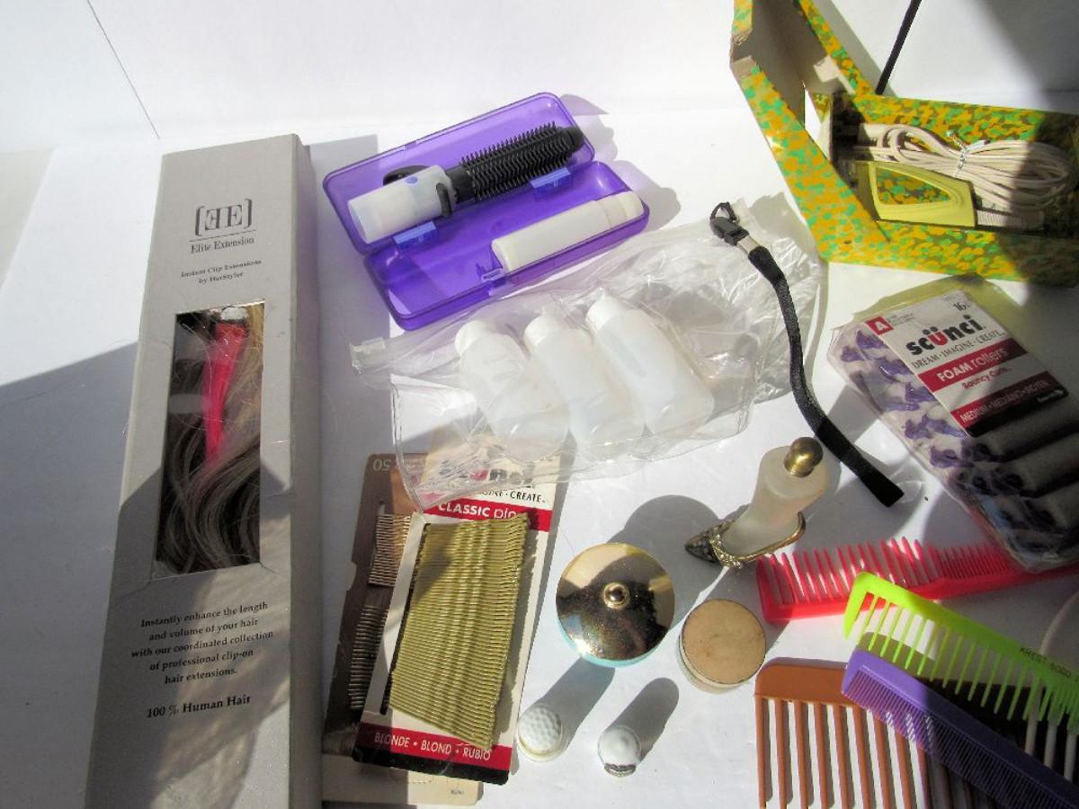 Misc Lot of Vanity Items: Combs, Hair Extension, Travel Bottles, Old Remington Shaver, More