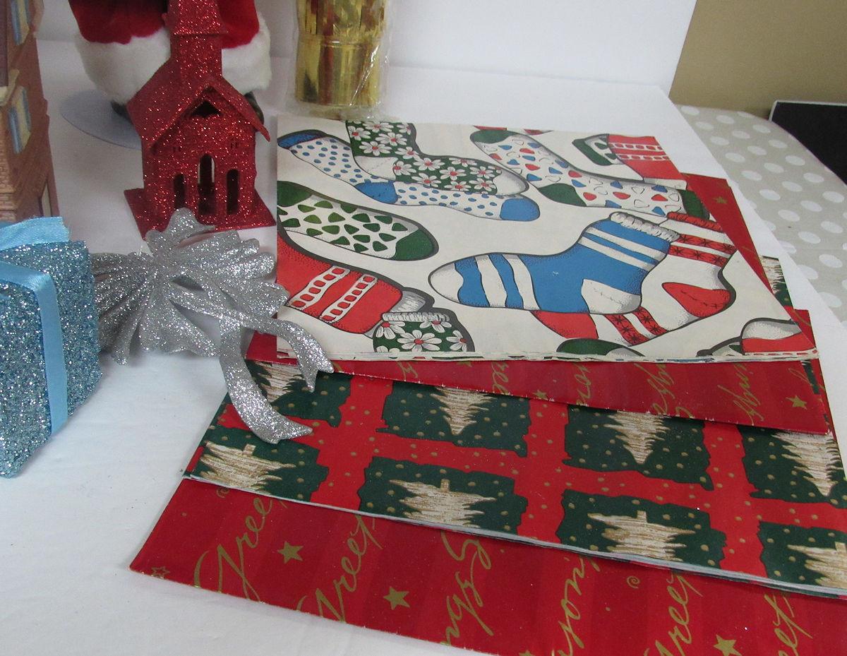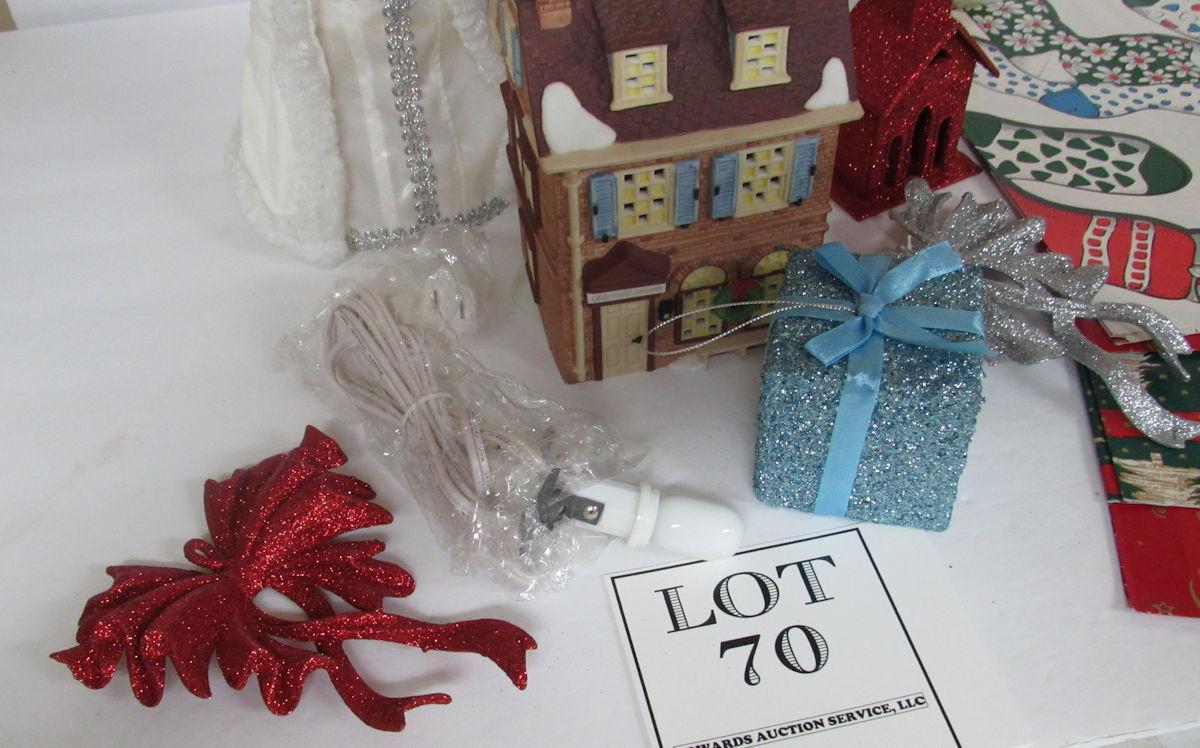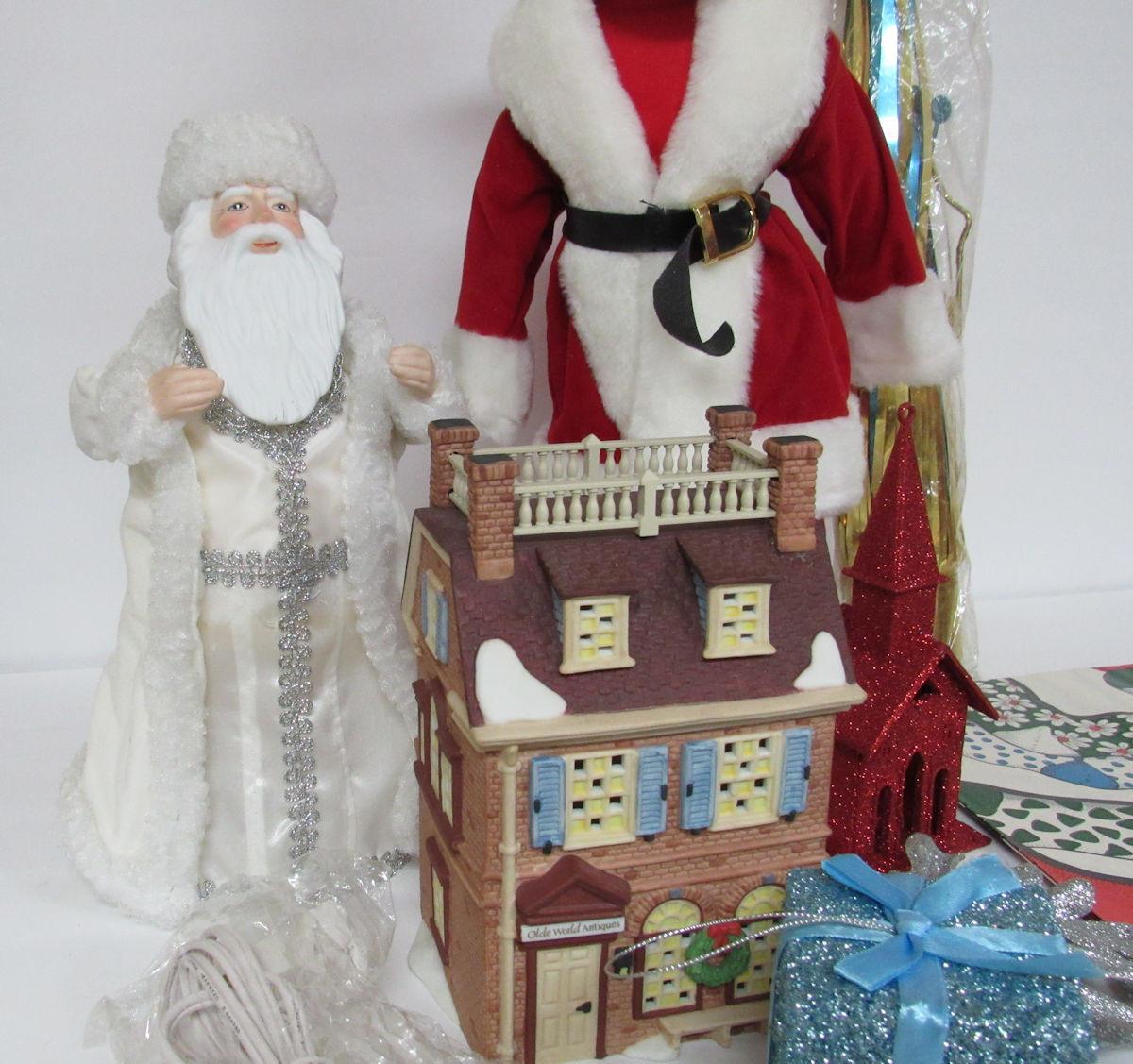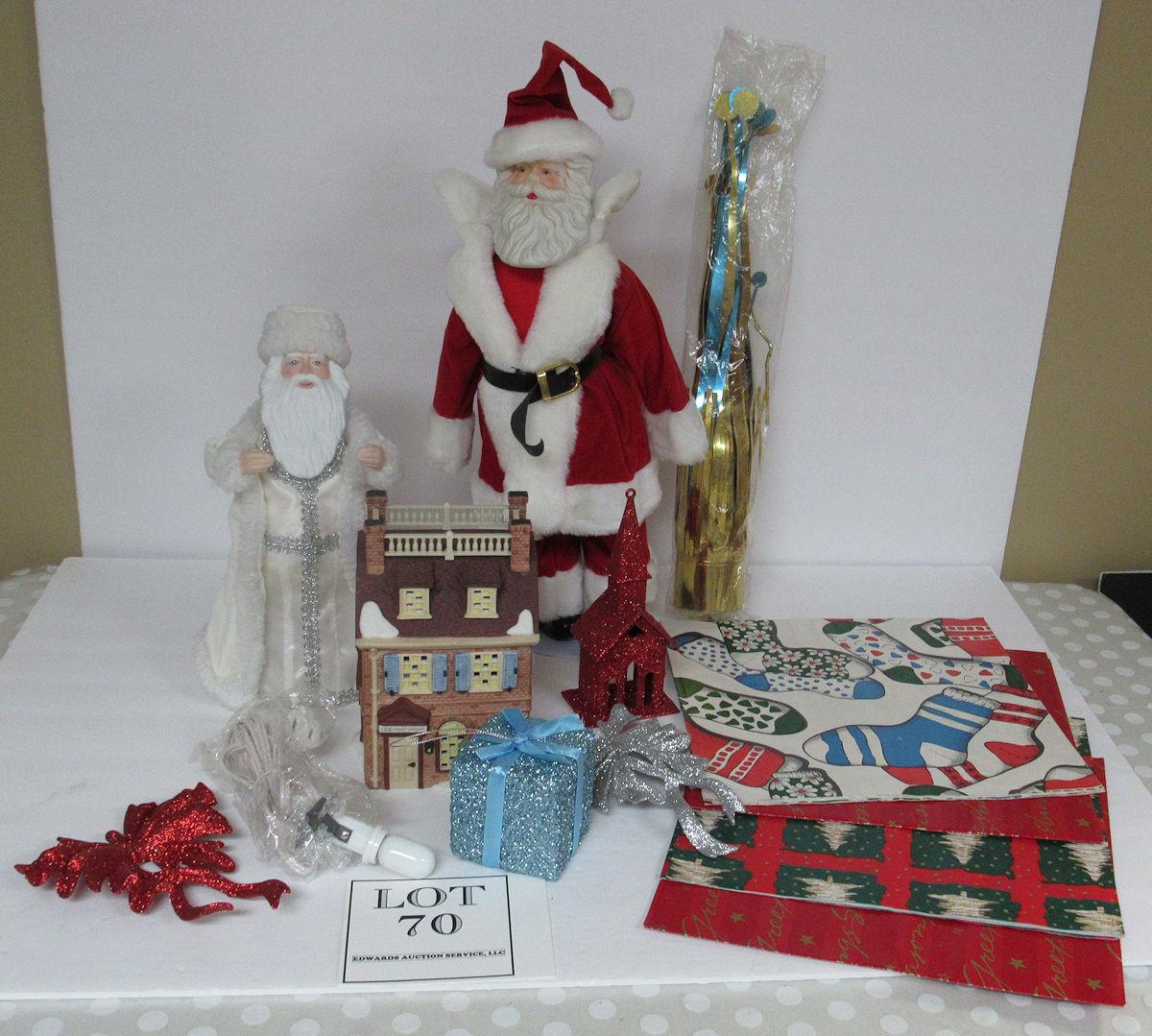Nice bisque Santa doll on stand, Santa tree topper, Dept 45 house with cord, 3 large plastic glitter ornaments, 4 vintage styles wrapping paper, older Shiny Brite Hanging Mobile type thing.