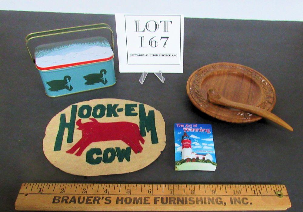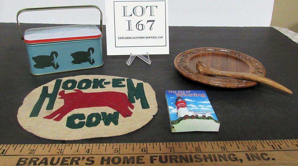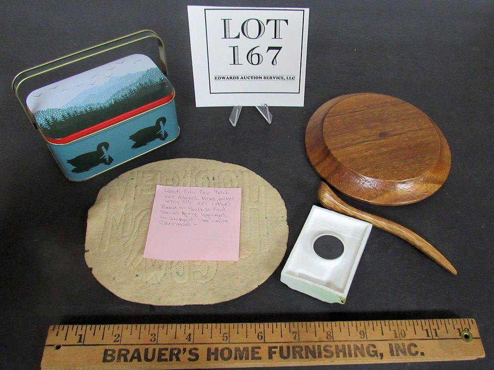 Misc Lot, Small Tin Box, Wood Plate and Spoon, Magnet, Vintage Patch
