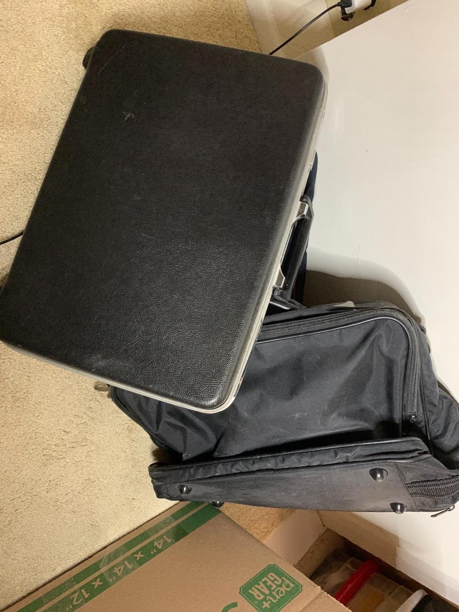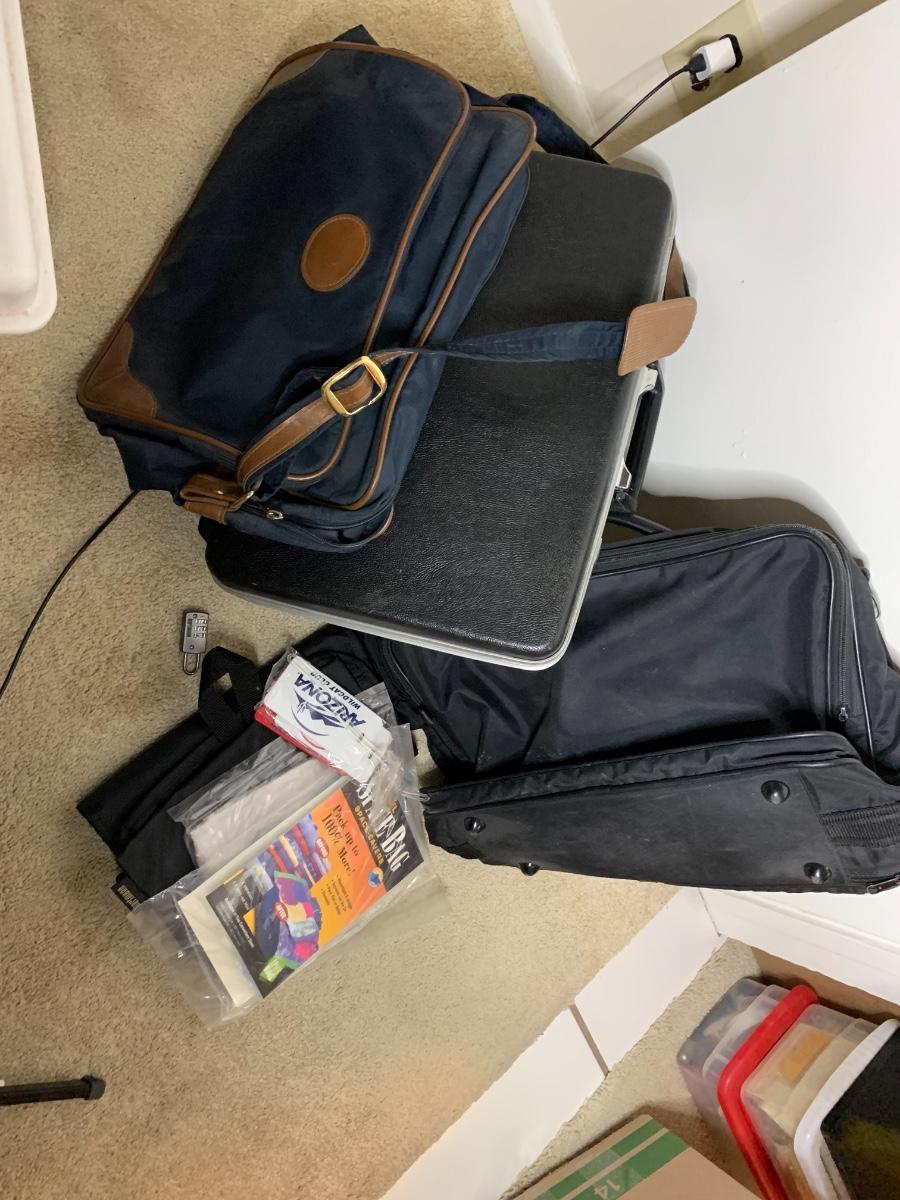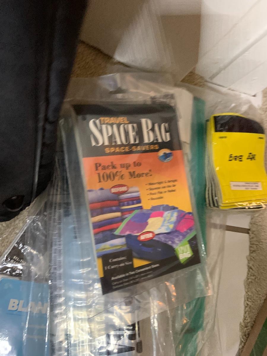 A few traveling bags, hard side brief case, luggage tags and space bags
