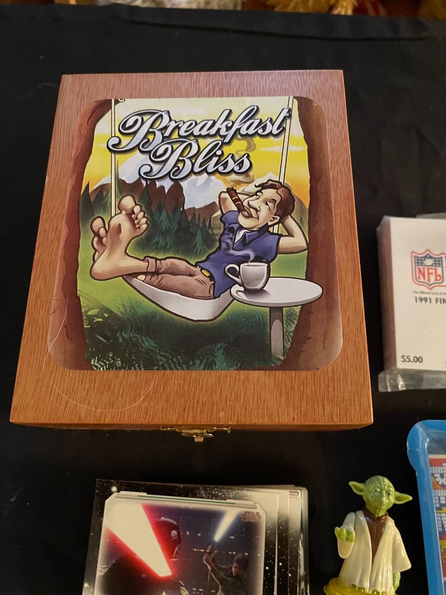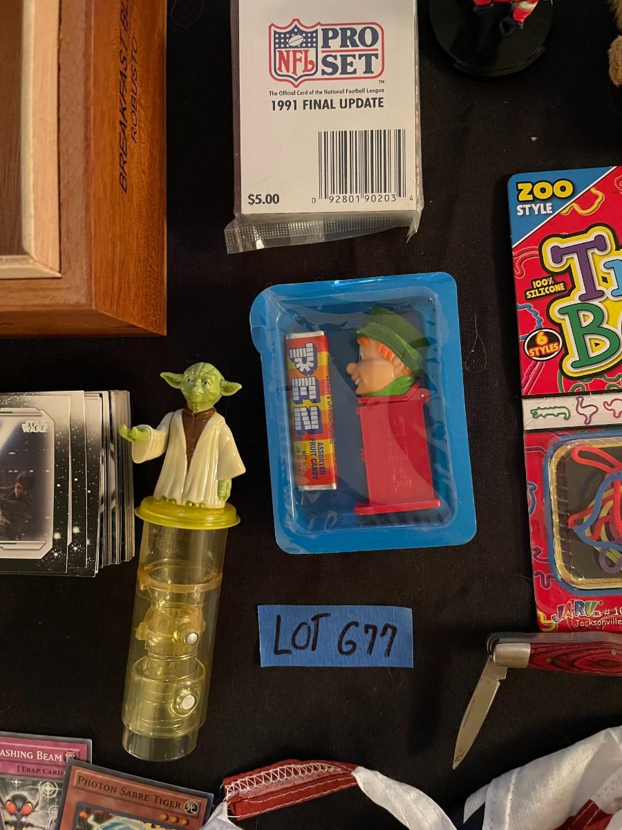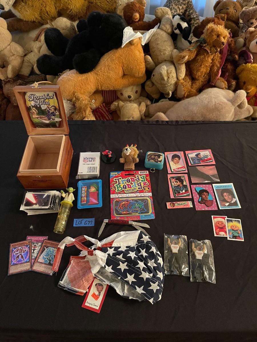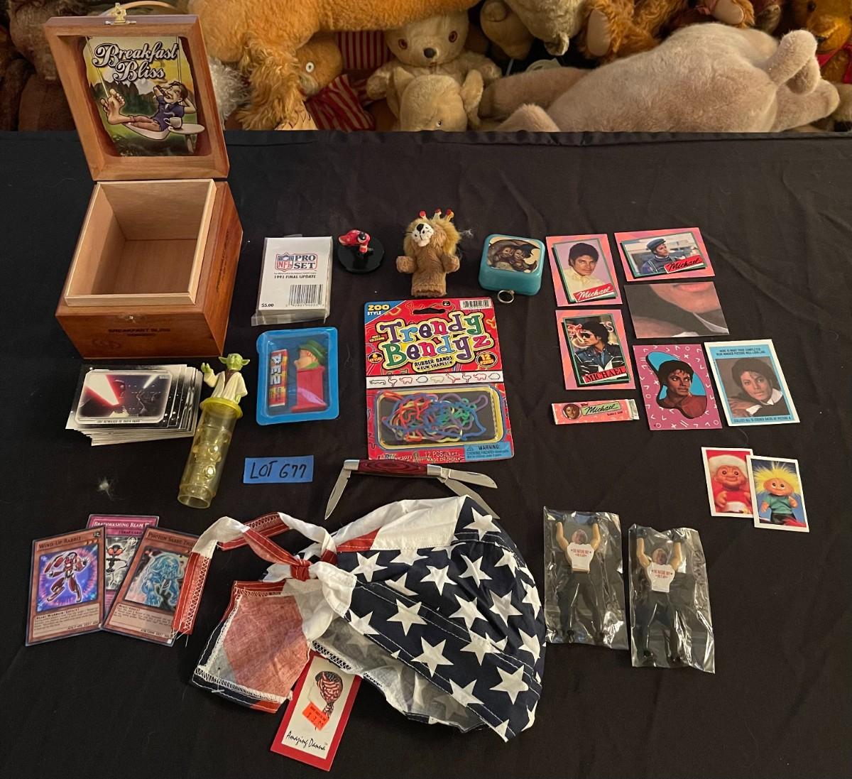 Adorable mini collection set - Michael Jackson gum & photocards, toys, stickers, music box *works*, pocket knife, bandana, wooden box, Star Wars toy and cards, yughiyo cards, 1991 NFL Pro set final update, Lucky Charms pez, trendy bendyz.