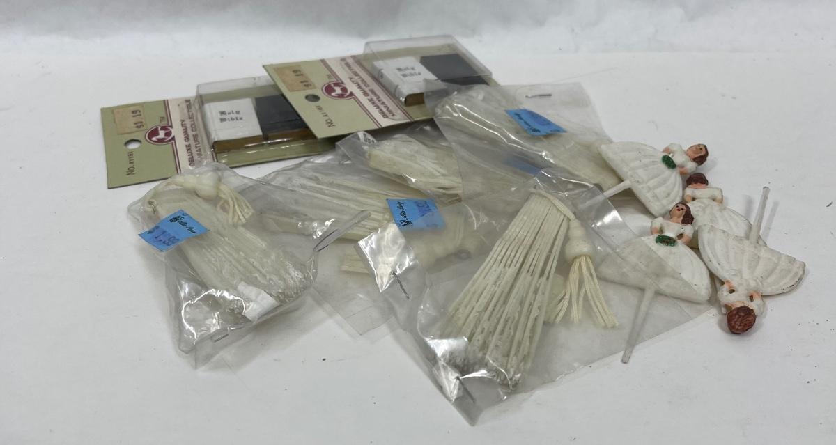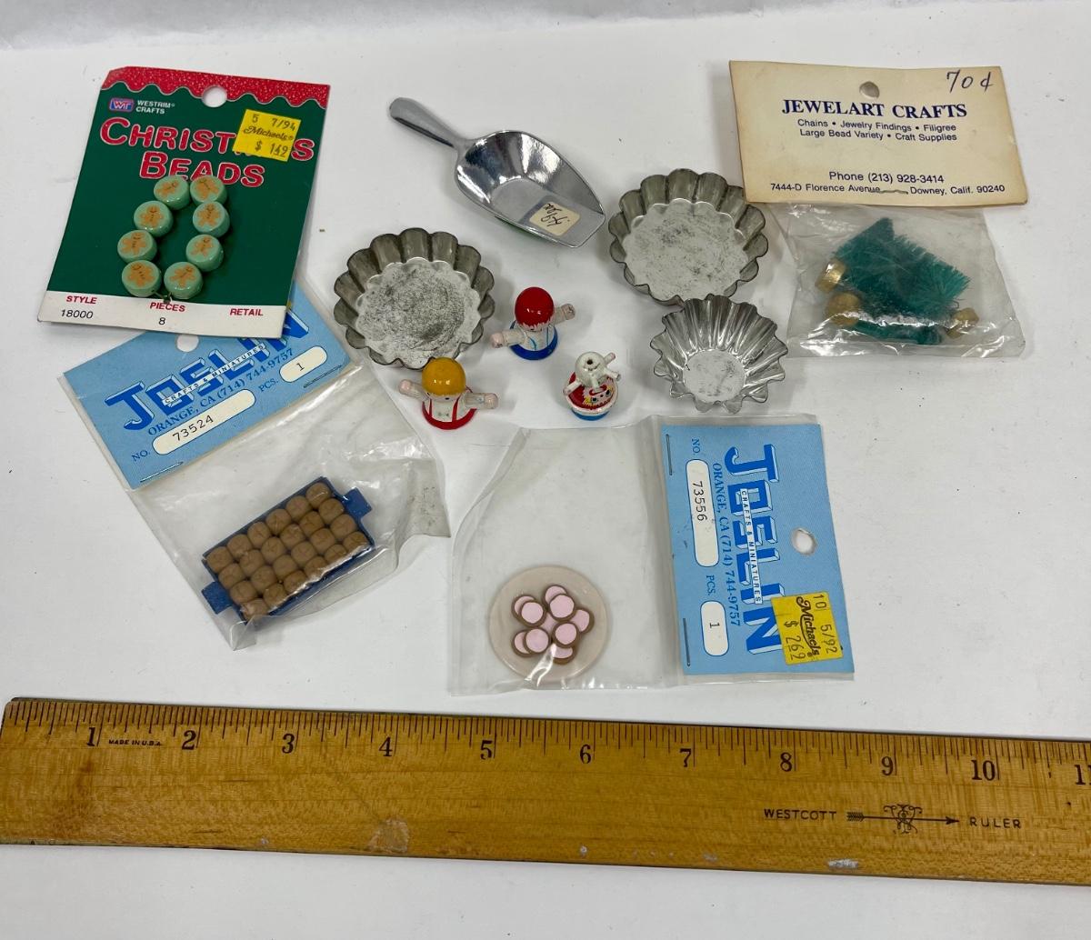 Misc Miniature Lot - tiny baking pans, baked goods, wooden people, Christmas Trees, and a Scoop