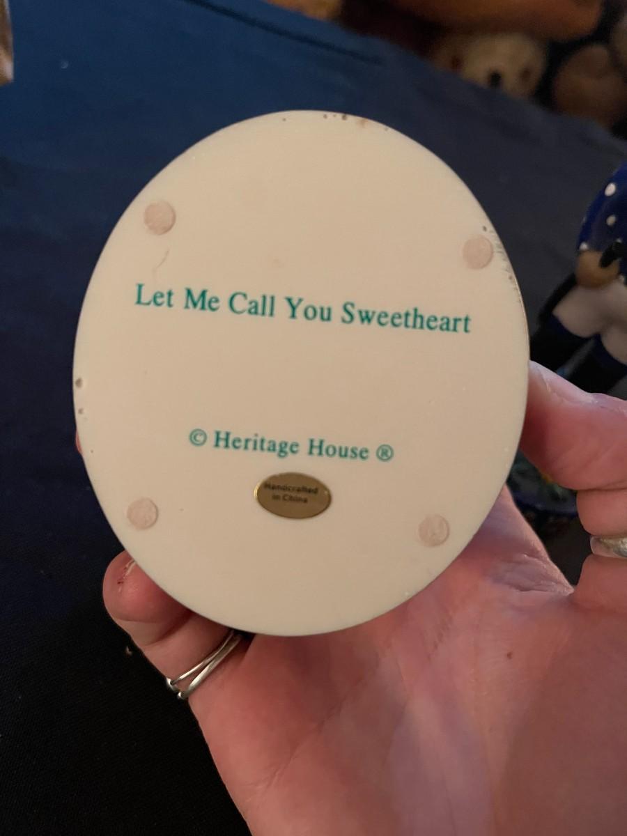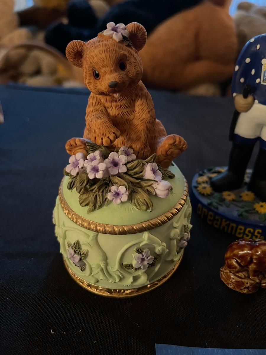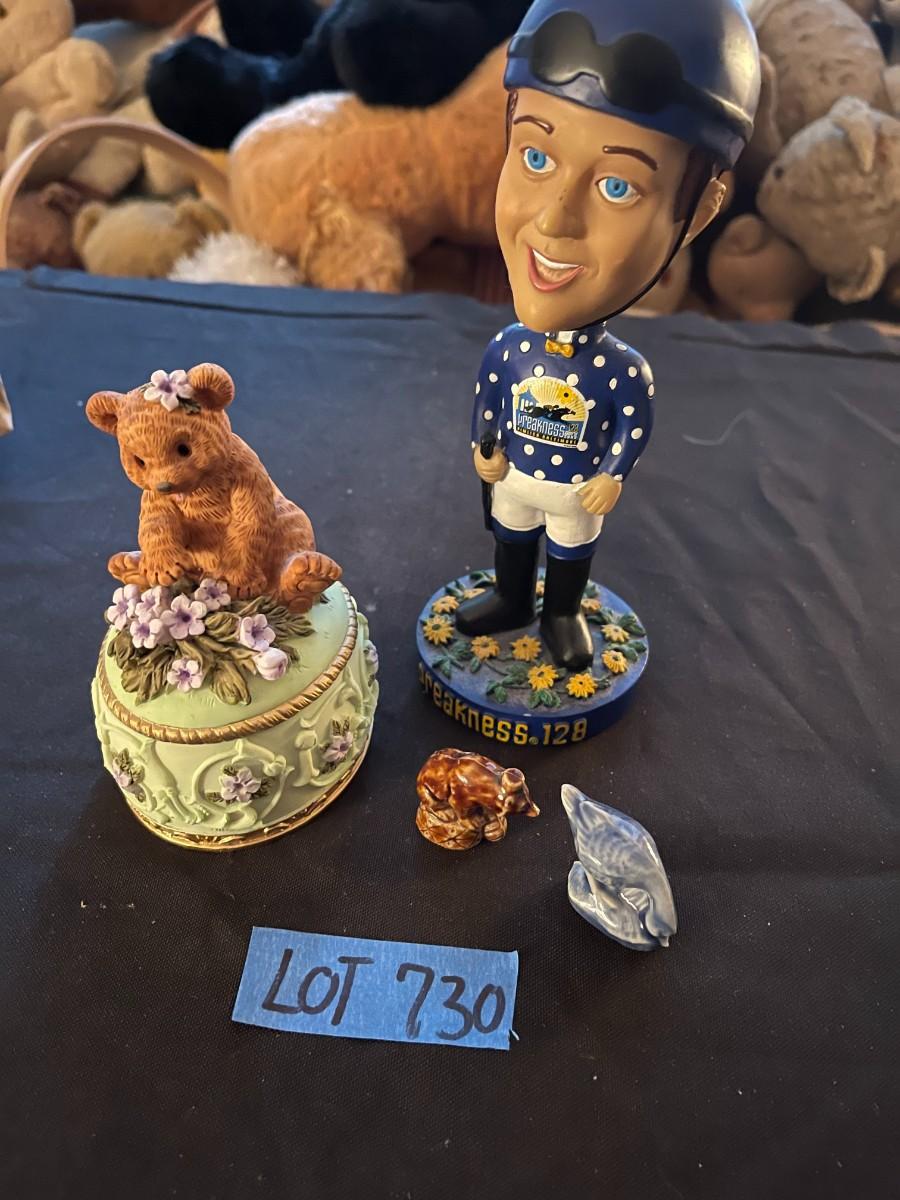 "Let me call you sweetheart" musicbox, Heritage House teddy bear, (2) mini painted animals, preakness 128 bobblehead.