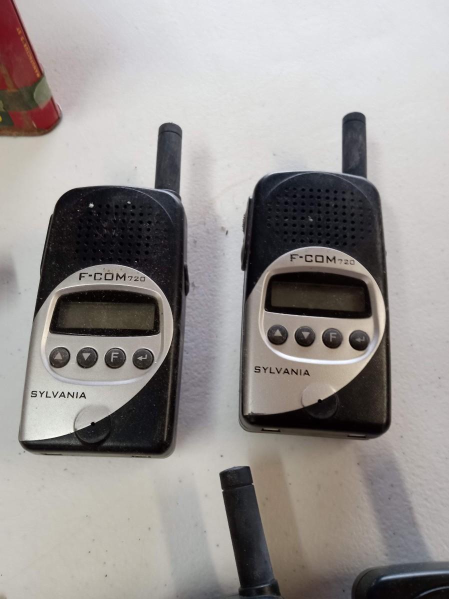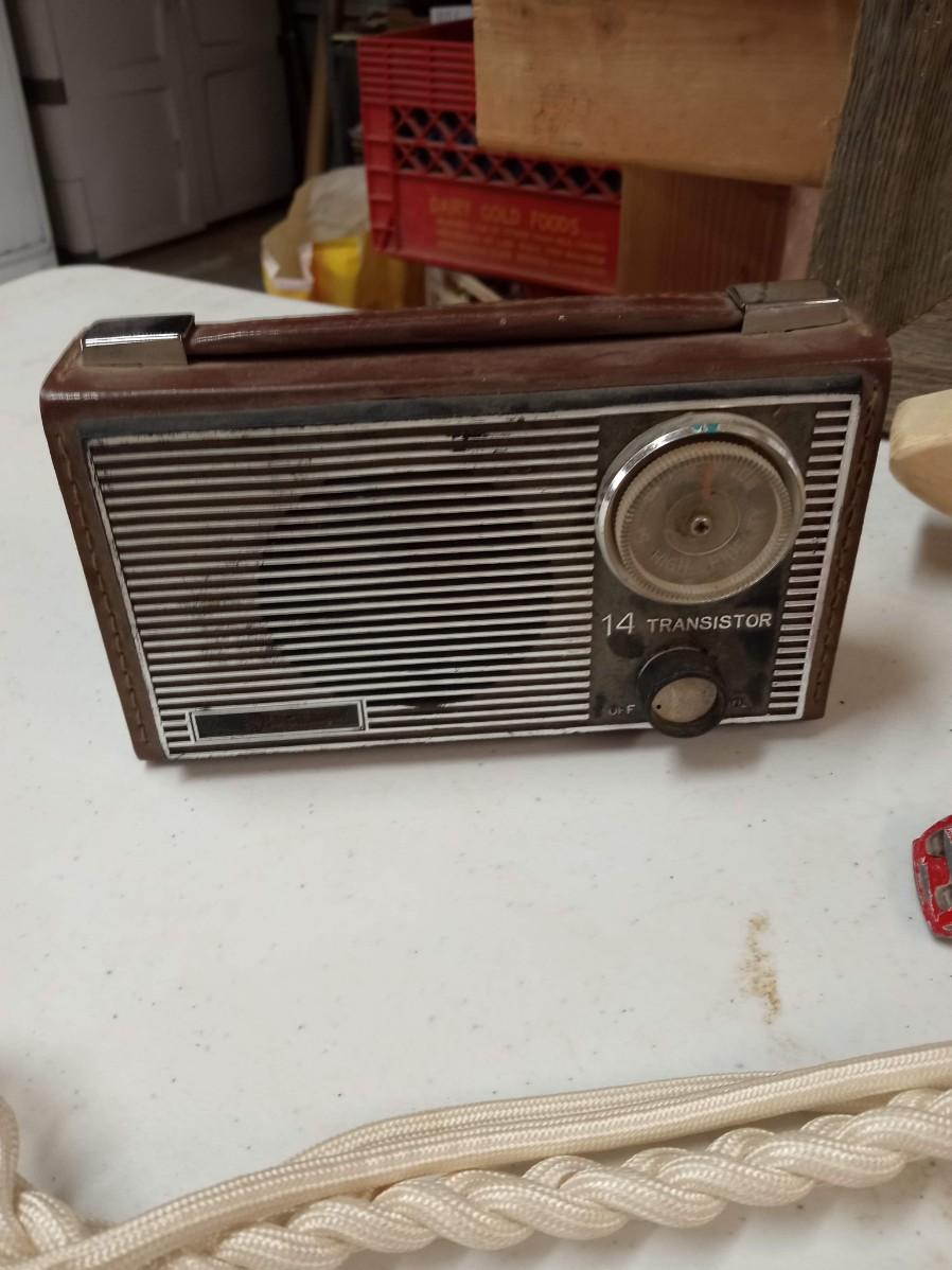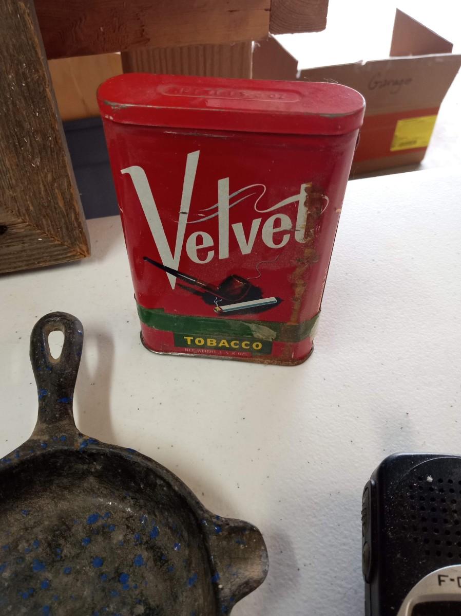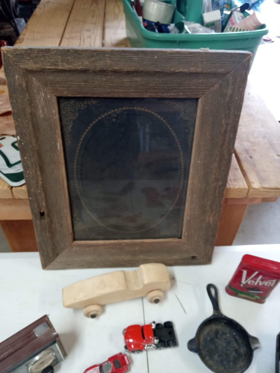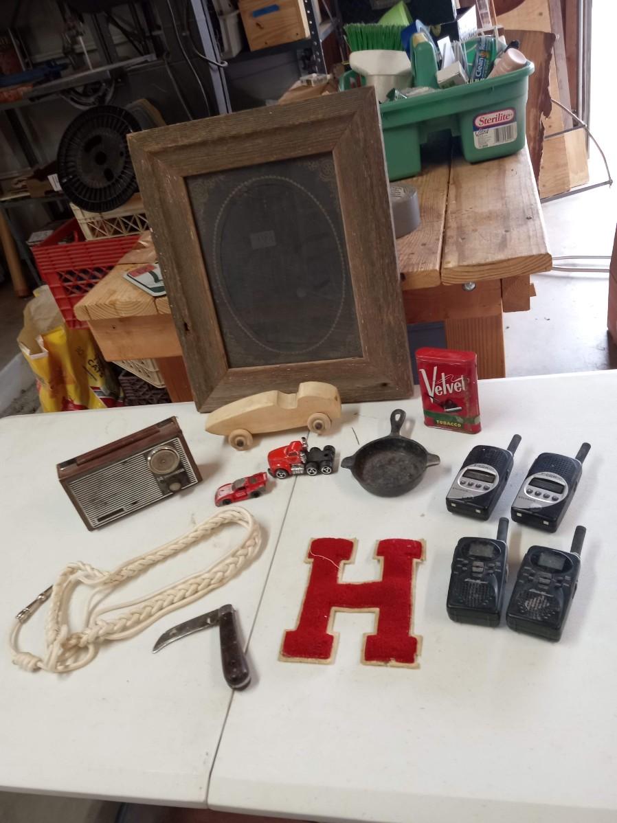 BARN WOOD FRAME, TRANSISTER RADIO, 2 SETS OF WALKIE TALKIE LIKE, CAST IRON SKILLET ASHTRAY, WOODEN CAR, POCKET KNIFE, RED VELVET TIN CAN AND MORE